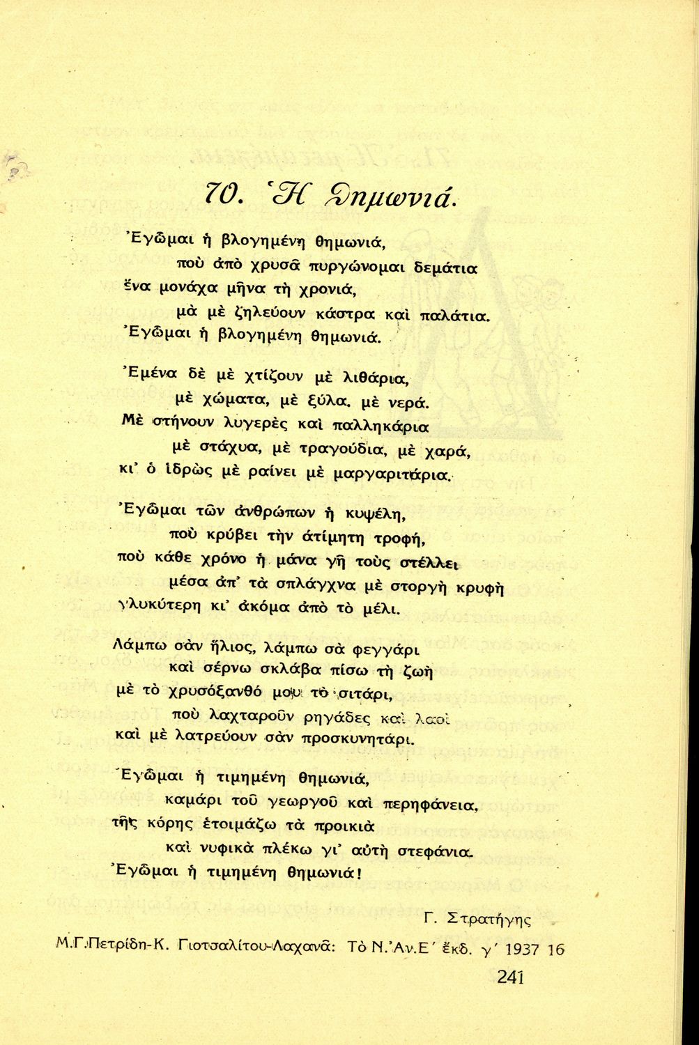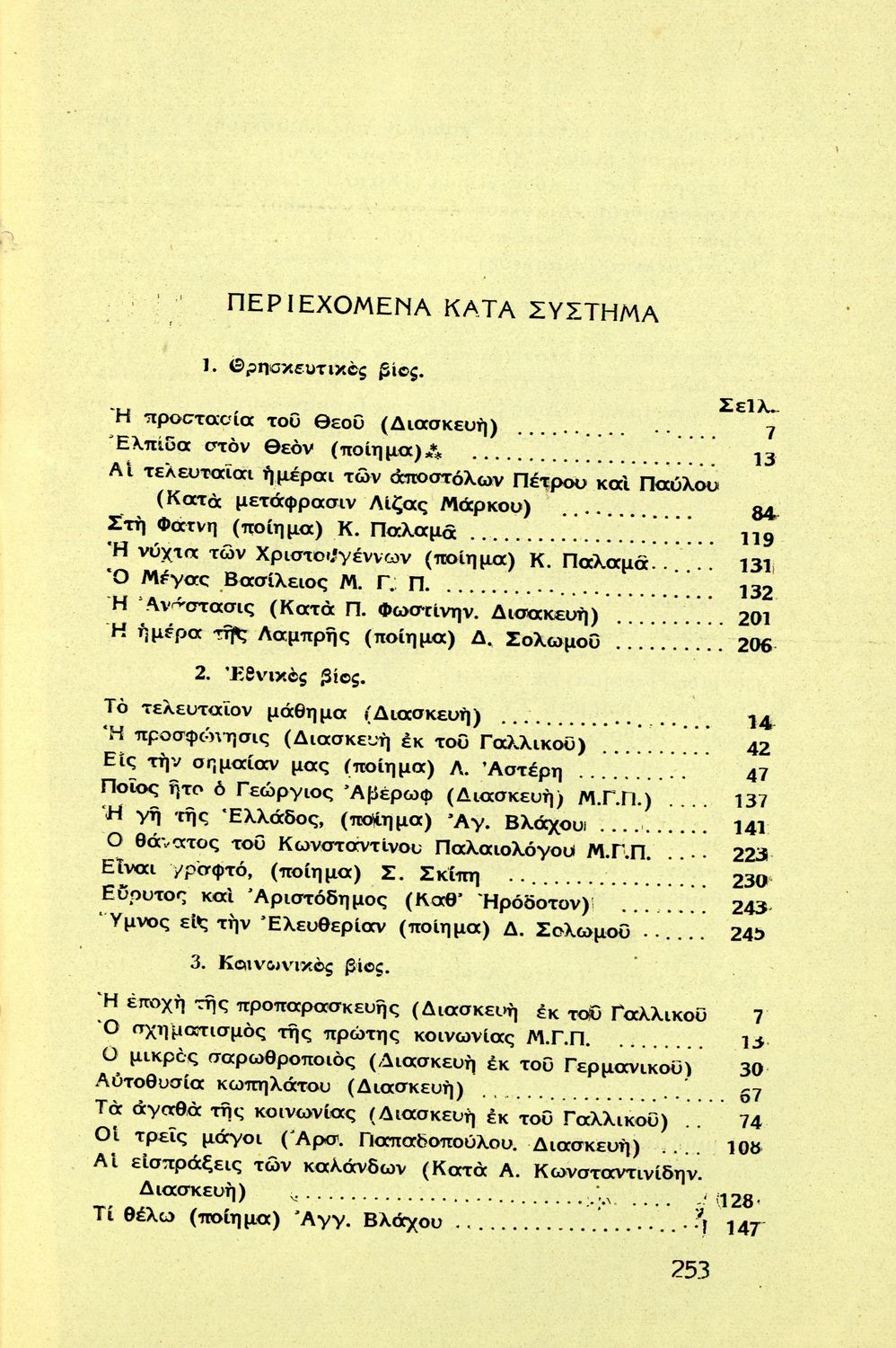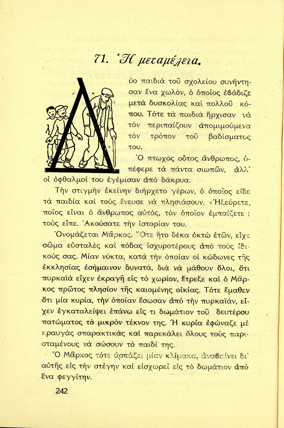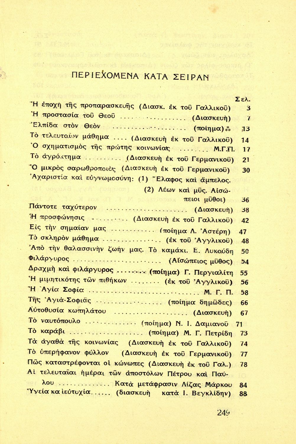 Αναγνωστικό Ε΄ Δημοτικού που περιλαμβάνει πεζογραφήματα εμπνευσμένα από την ελληνική φύση, την αγροτική ζωή και από το τρίπτυχο "Πατρίς- θρησκεία- οικογένεια".
