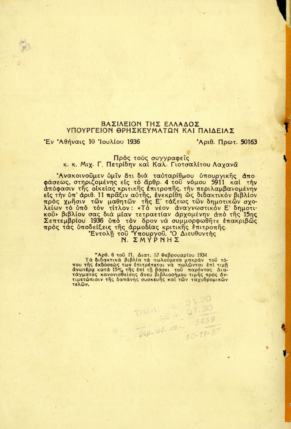 Τίτλος: Το νέον αναγνωστικόν της Ε΄ τάξεως του Δημοτικού Σχολείου