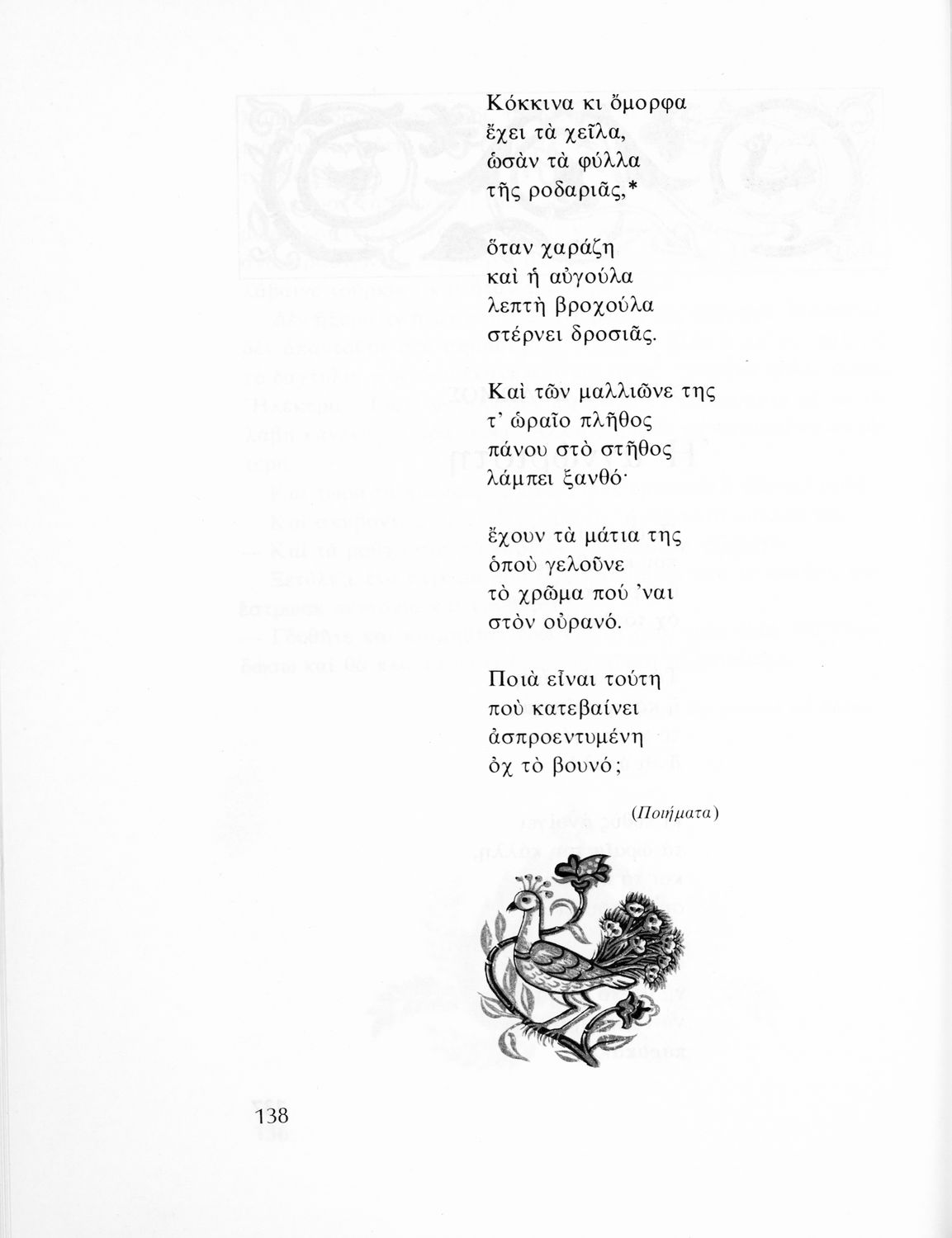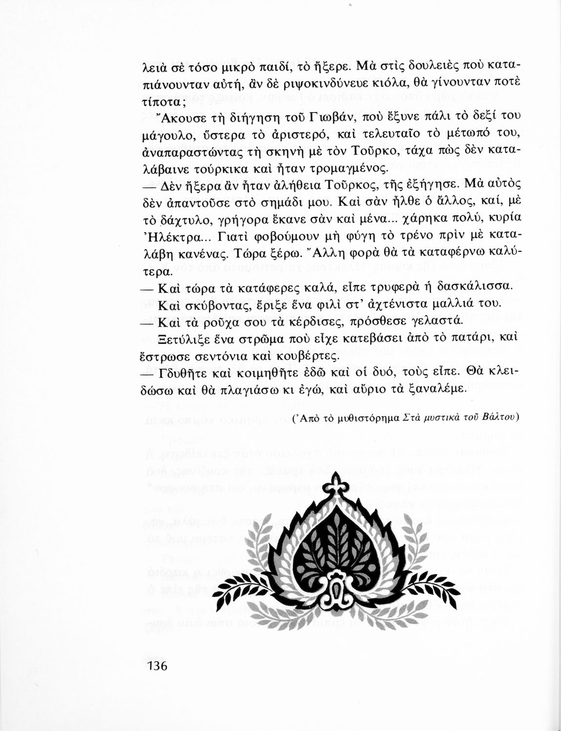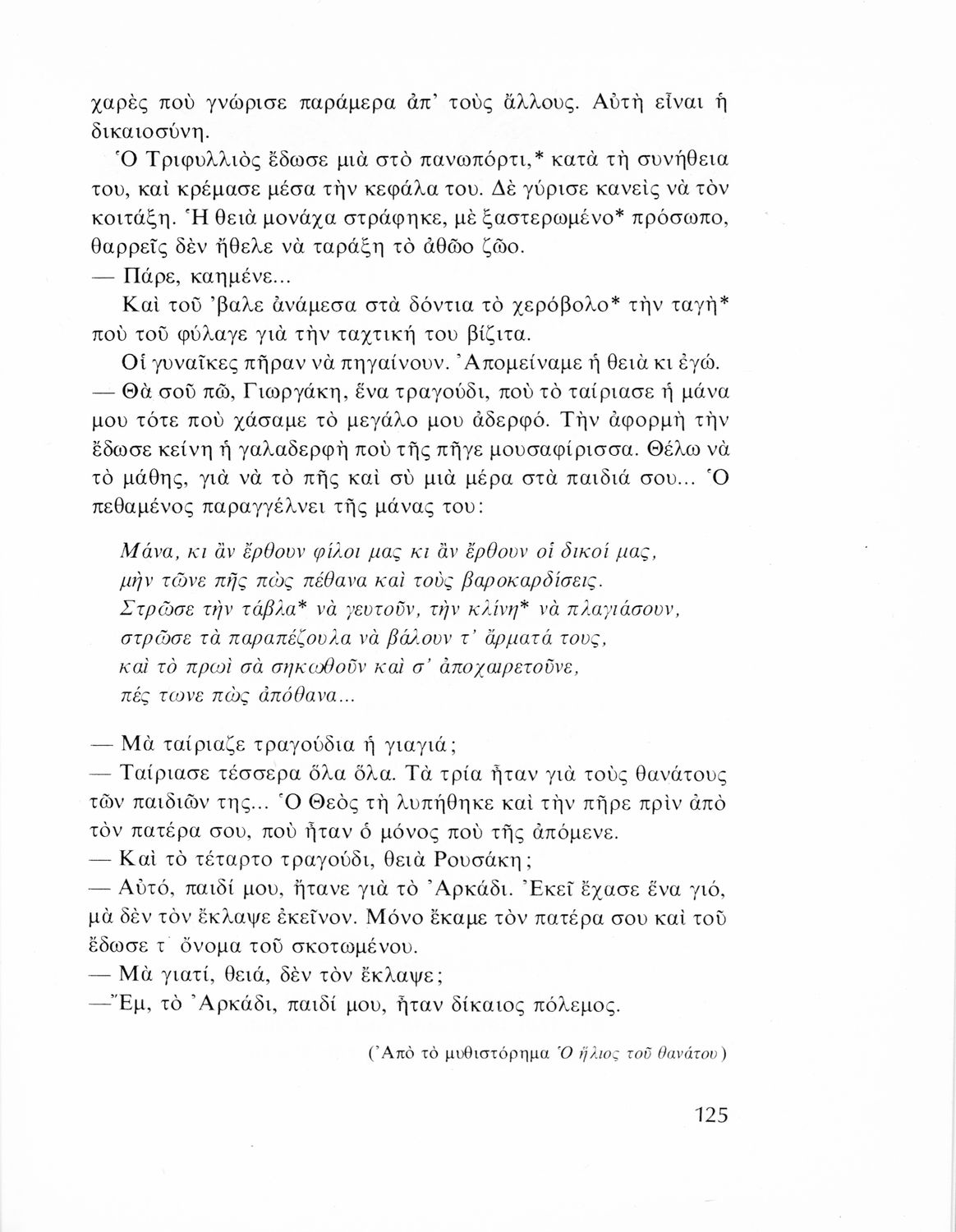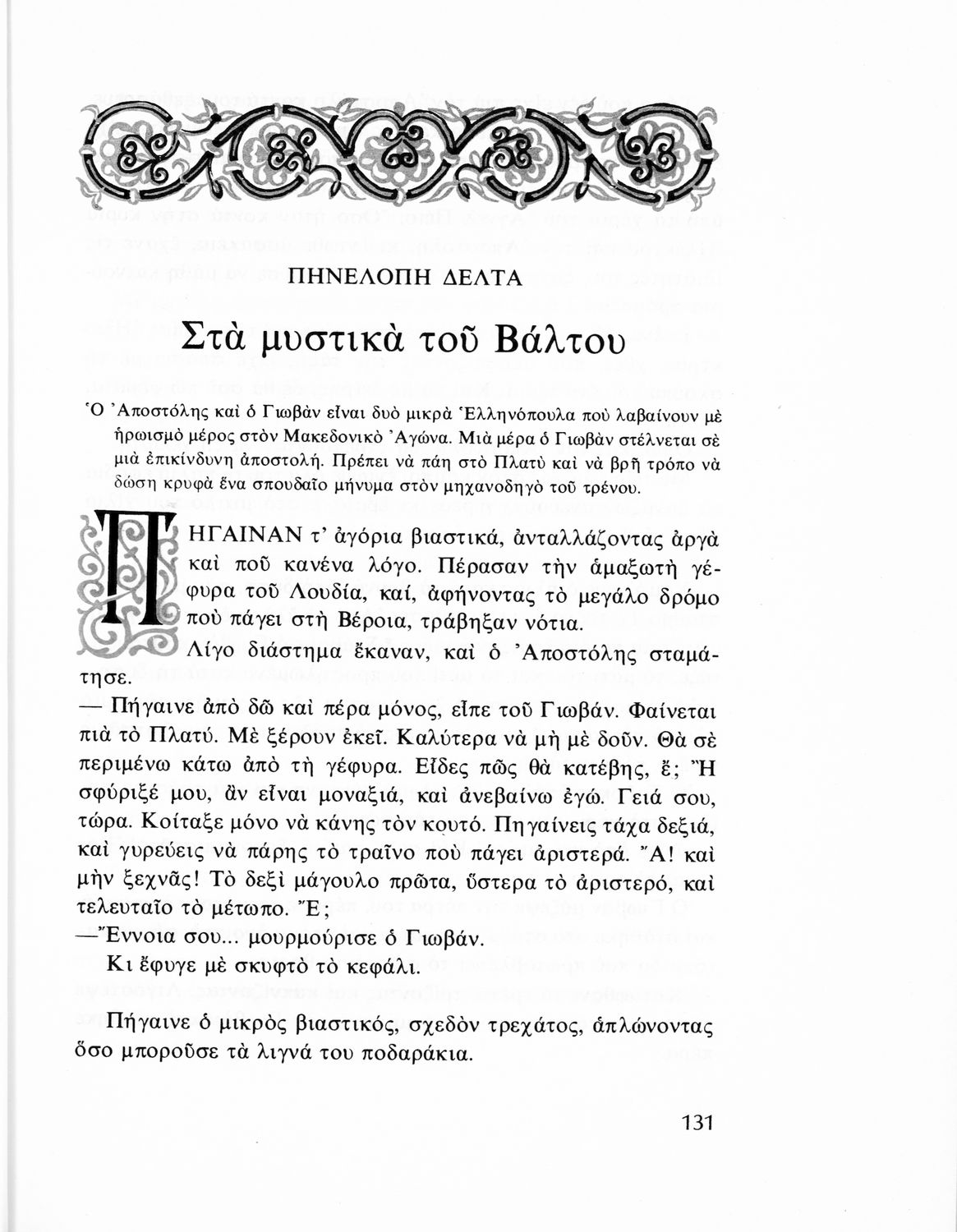 Αναγνωστικό για τις Ε' και ΣΤ΄ Δημοτικού που περιλαμβάνει πεζά και ποιήματα της Νέας Ελληνικής Λογοτεχνίας εμπνευσμένα από την καθημερινότητα των παιδιών και των οικογενειών τους, την ελληνική ιστορία, τις οικογενειακές στιγμές και εορτές, το παιχνίδι και την εθνική παράδοση, και τα δημοτικά και ακριτικά τραγούδια. Περιέχει και 5 κείμενα γραμμένα στην καθαρεύουσα με θέματα από τον κοινωνικό και εθνικό βίο, και ερμηνευτικό λεξιλόγιο.. Το βιβλίο είναι αφιερωμένο στη μνήμη της Πηνελόπης Δέλτα.