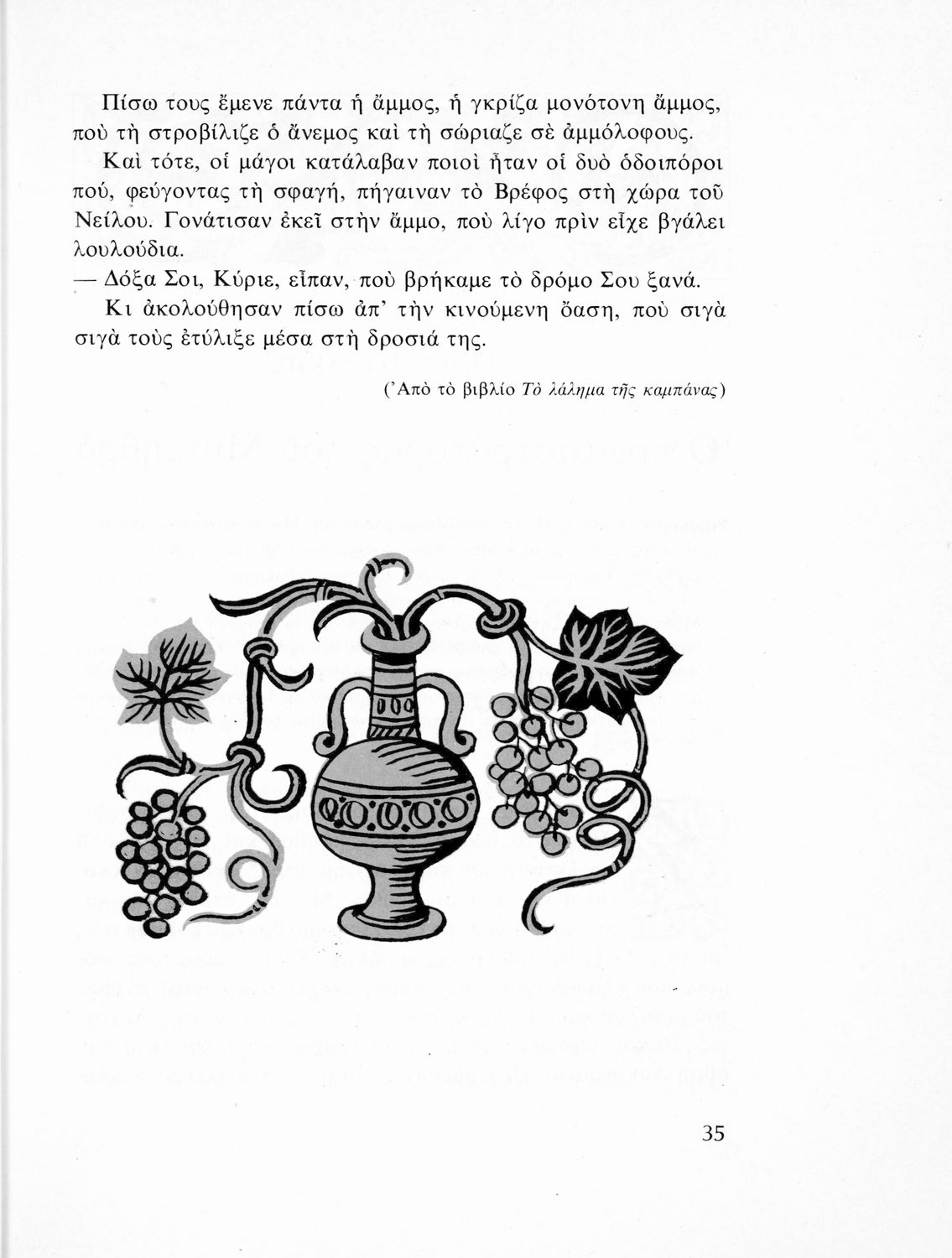 Παρουσίαση περιεχομένου: Αναγνωστικό για τις Ε' και ΣΤ΄ Δημοτικού που περιλαμβάνει πεζά και ποιήματα της Νέας Ελληνικής Λογοτεχνίας εμπνευσμένα από την καθημερινότητα των παιδιών και των οικογενειών τους, την ελληνική ιστορία, τις οικογενειακές στιγμές και εορτές, το παιχνίδι και την εθνική παράδοση, και τα δημοτικά και ακριτικά τραγούδια. Περιέχει και 5 κείμενα γραμμένα στην καθαρεύουσα με θέματα από τον κοινωνικό και εθνικό βίο, και ερμηνευτικό λεξιλόγιο.. Το βιβλίο είναι αφιερωμένο στη μνήμη της Πηνελόπης Δέλτα.