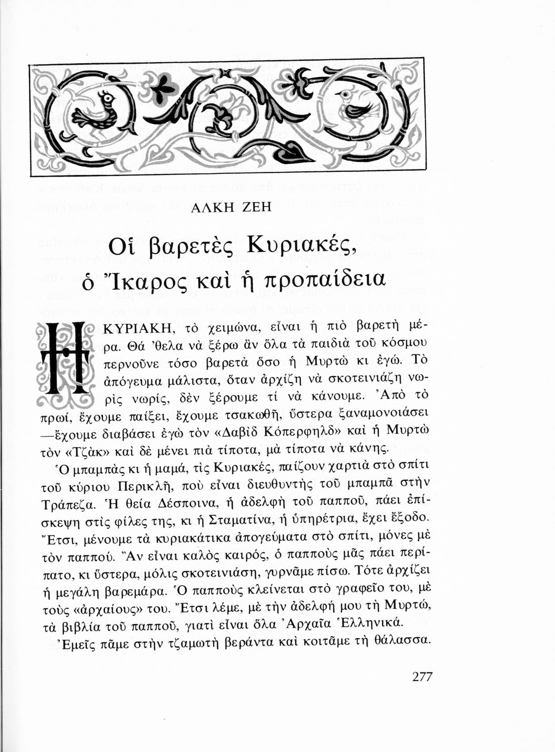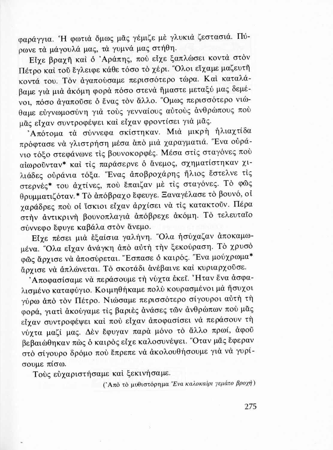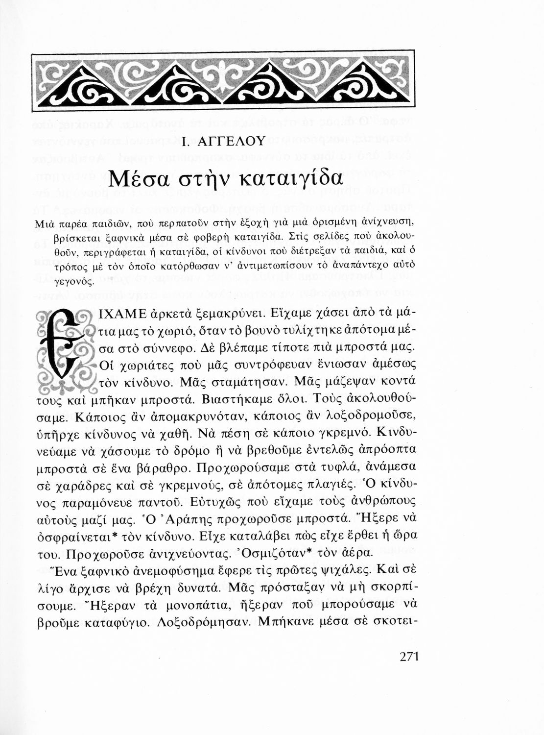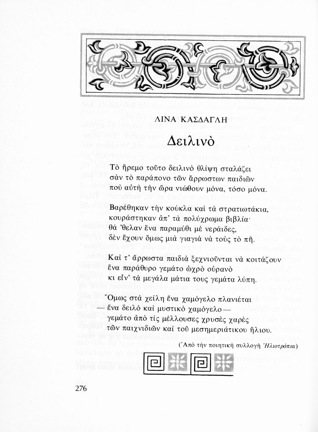 Αναγνωστικό για τις Ε' και ΣΤ΄ Δημοτικού που περιλαμβάνει πεζά και ποιήματα της Νέας Ελληνικής Λογοτεχνίας εμπνευσμένα από την καθημερινότητα των παιδιών και των οικογενειών τους, την ελληνική ιστορία, τις οικογενειακές στιγμές και εορτές, το παιχνίδι και την εθνική παράδοση, και τα δημοτικά και ακριτικά τραγούδια. Περιέχει και 5 κείμενα γραμμένα στην καθαρεύουσα με θέματα από τον κοινωνικό και εθνικό βίο, και ερμηνευτικό λεξιλόγιο.. Το βιβλίο είναι αφιερωμένο στη μνήμη της Πηνελόπης Δέλτα.