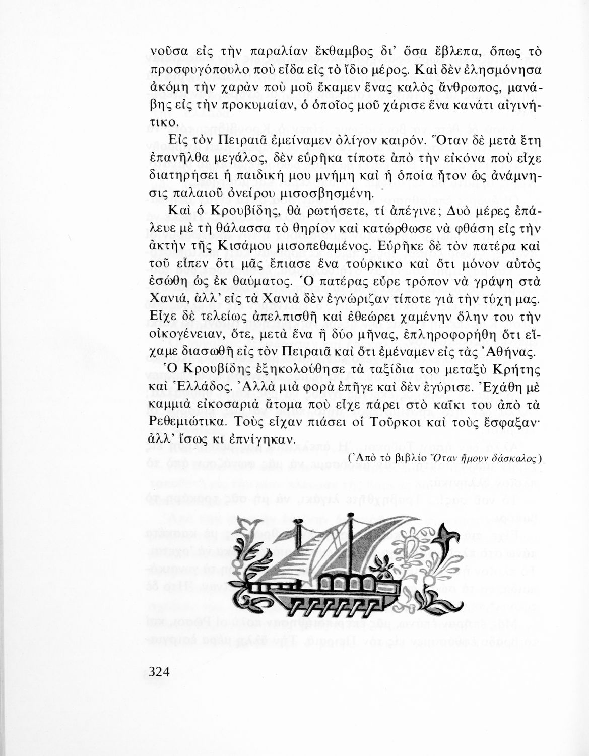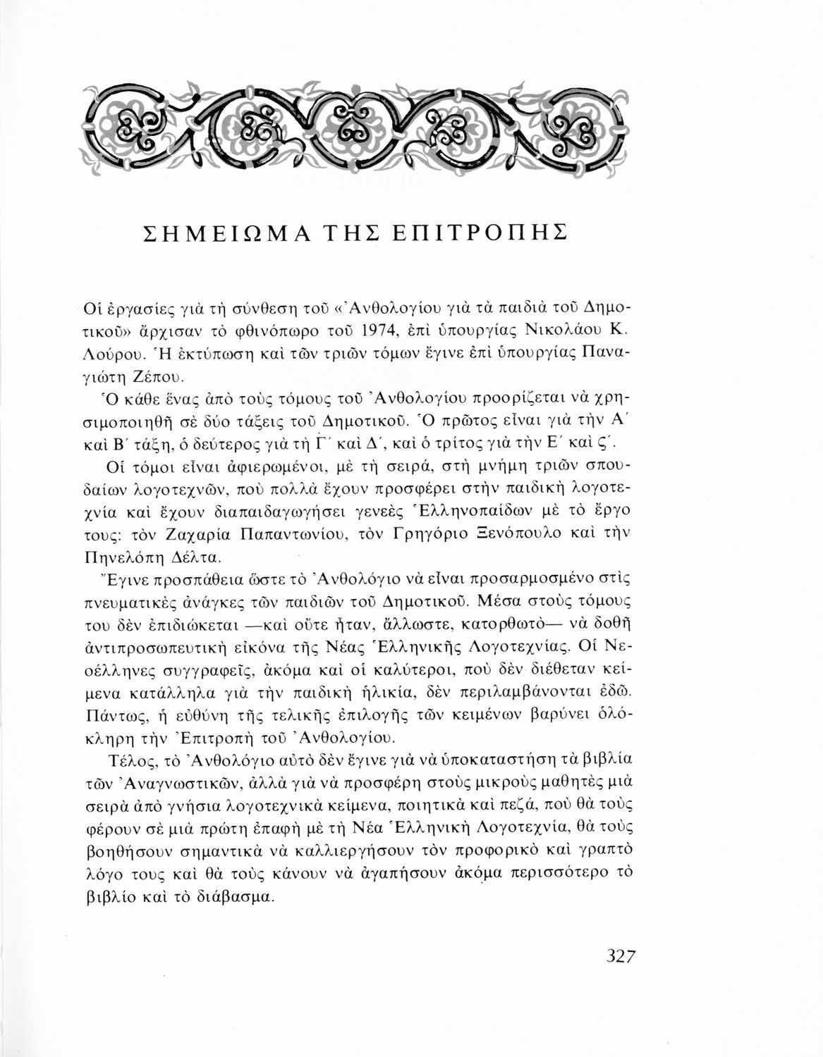 Αναγνωστικό για τις Ε' και ΣΤ΄ Δημοτικού που περιλαμβάνει πεζά και ποιήματα της Νέας Ελληνικής Λογοτεχνίας εμπνευσμένα από την καθημερινότητα των παιδιών και των οικογενειών τους, την ελληνική ιστορία, τις οικογενειακές στιγμές και εορτές, το παιχνίδι και την εθνική παράδοση, και τα δημοτικά και ακριτικά τραγούδια. Περιέχει και 5 κείμενα γραμμένα στην καθαρεύουσα με θέματα από τον κοινωνικό και εθνικό βίο, και ερμηνευτικό λεξιλόγιο.. Το βιβλίο είναι αφιερωμένο στη μνήμη της Πηνελόπης Δέλτα.