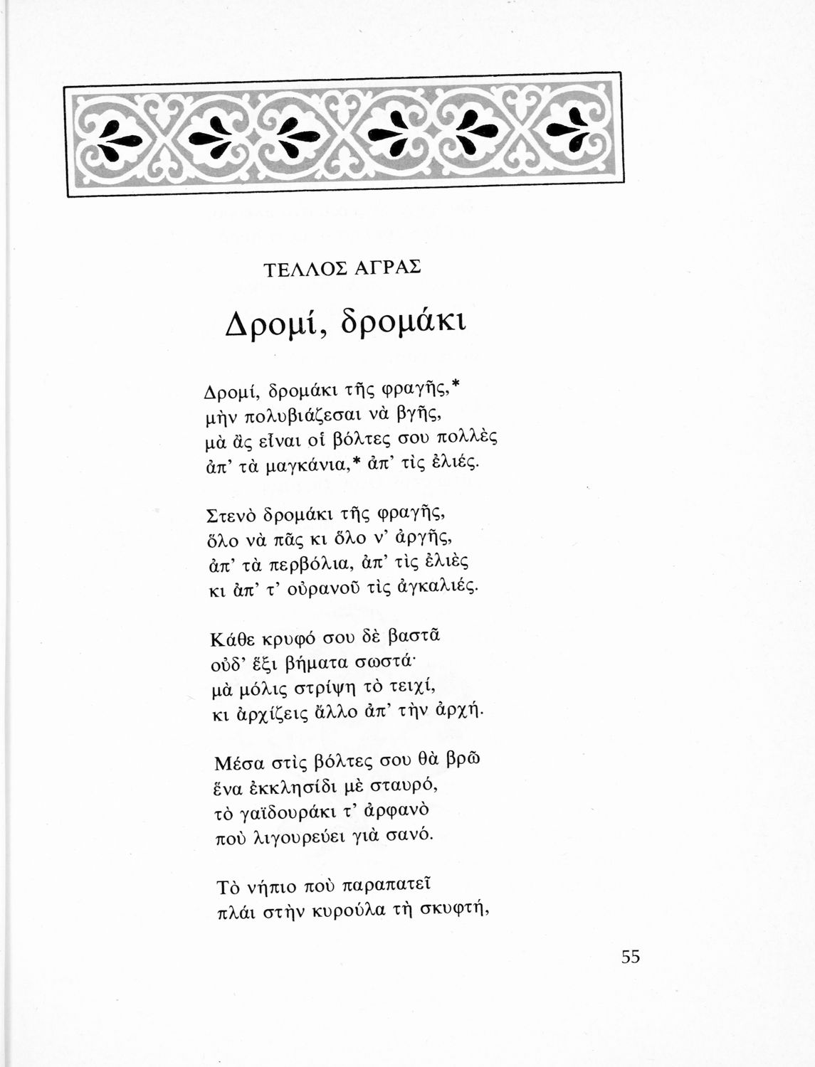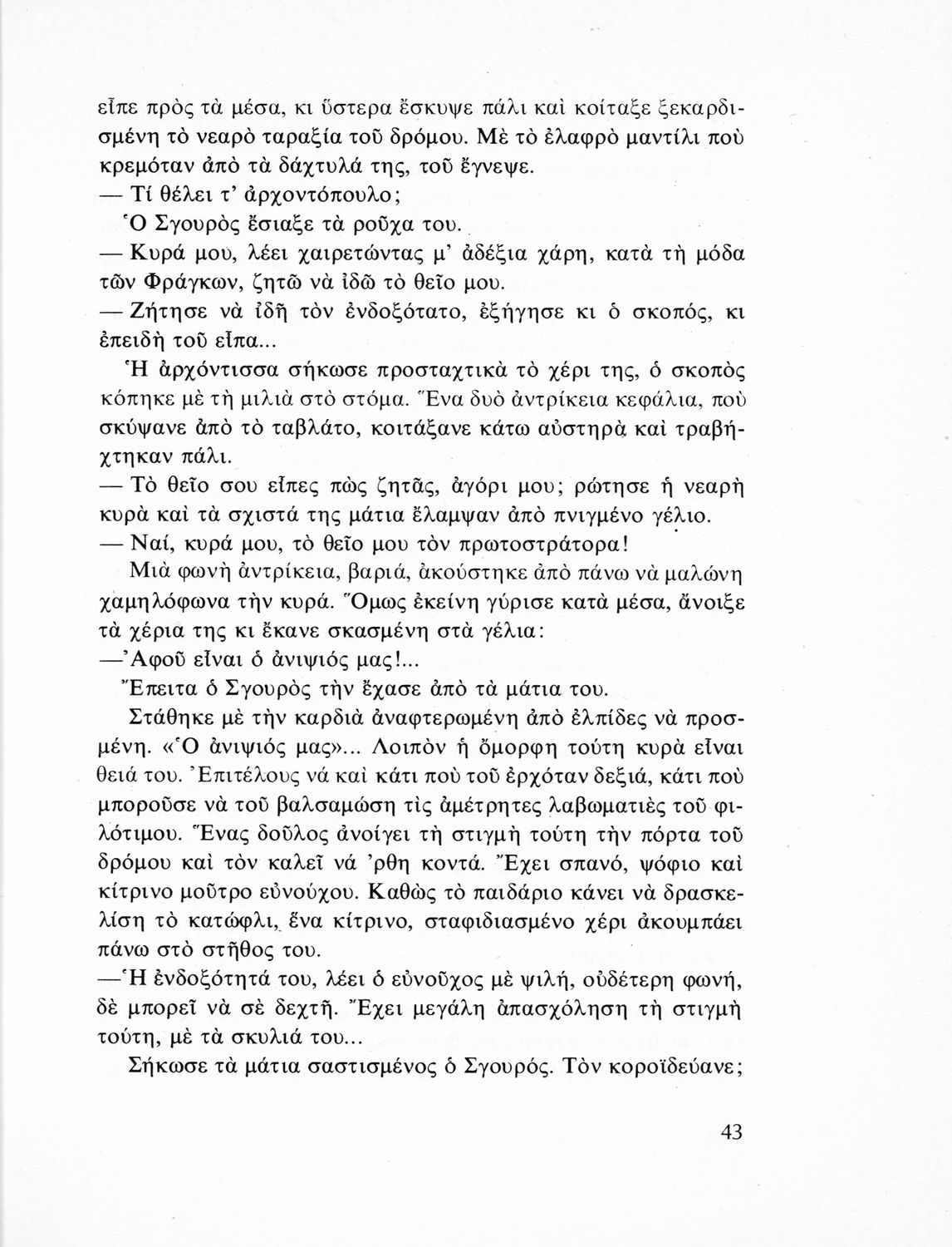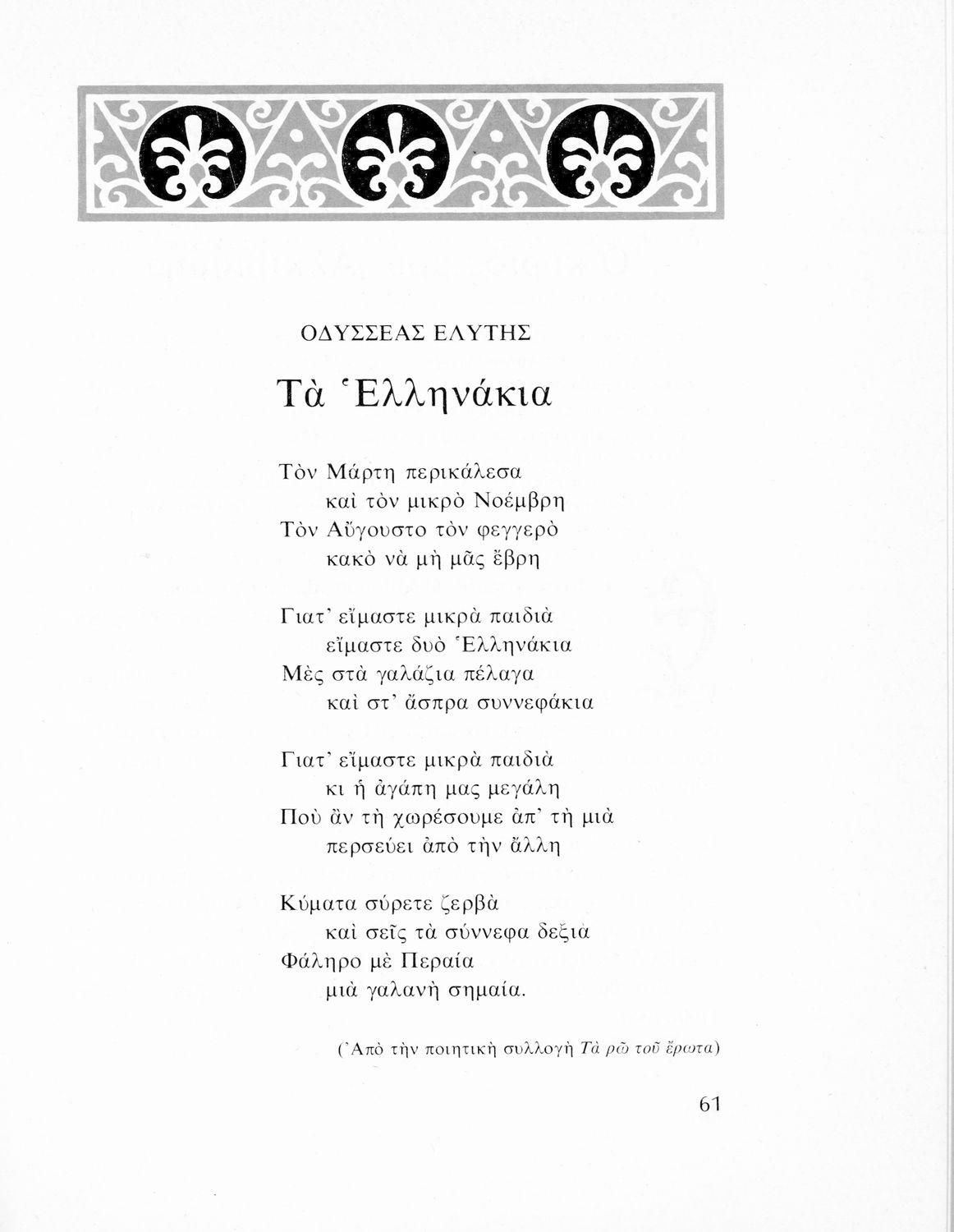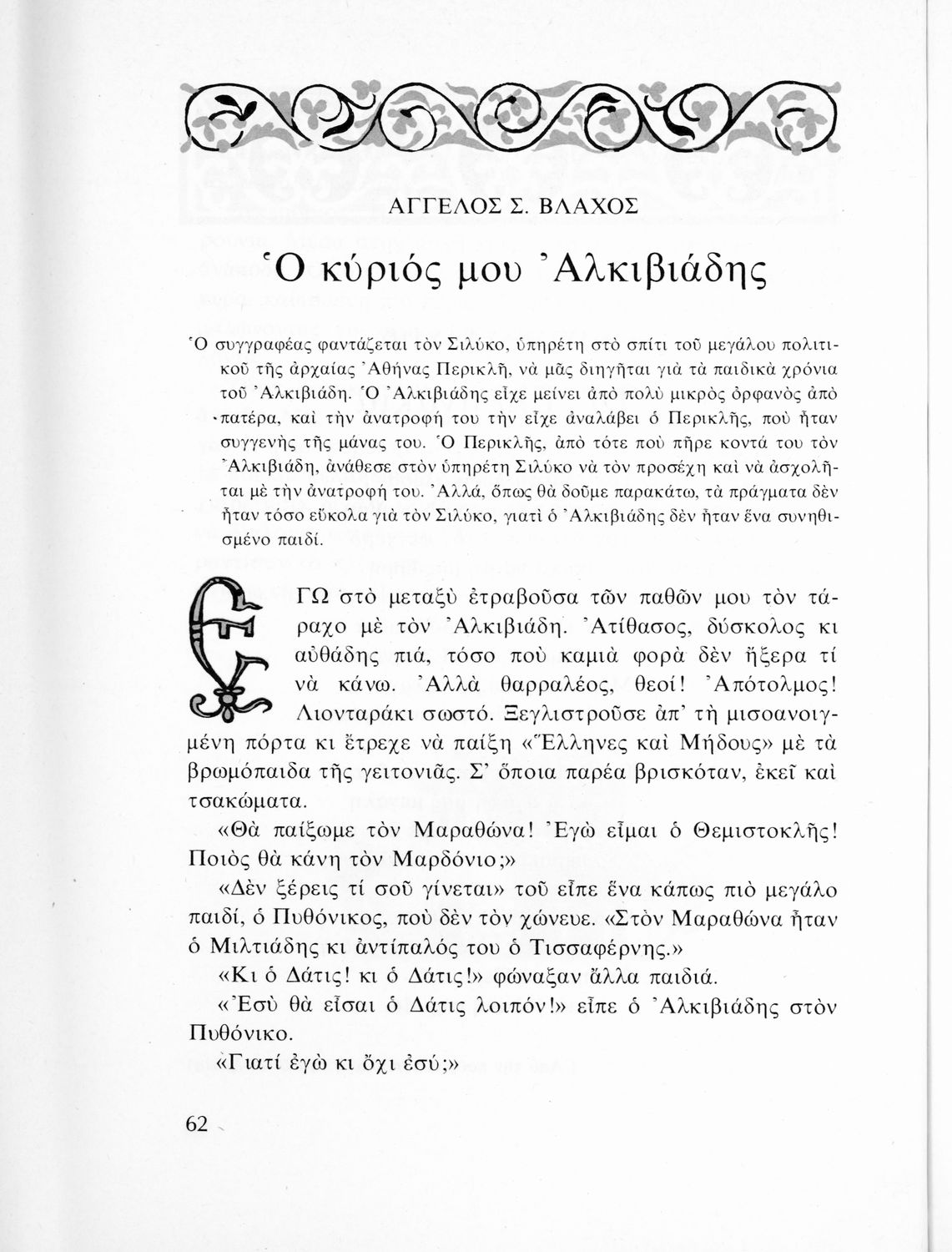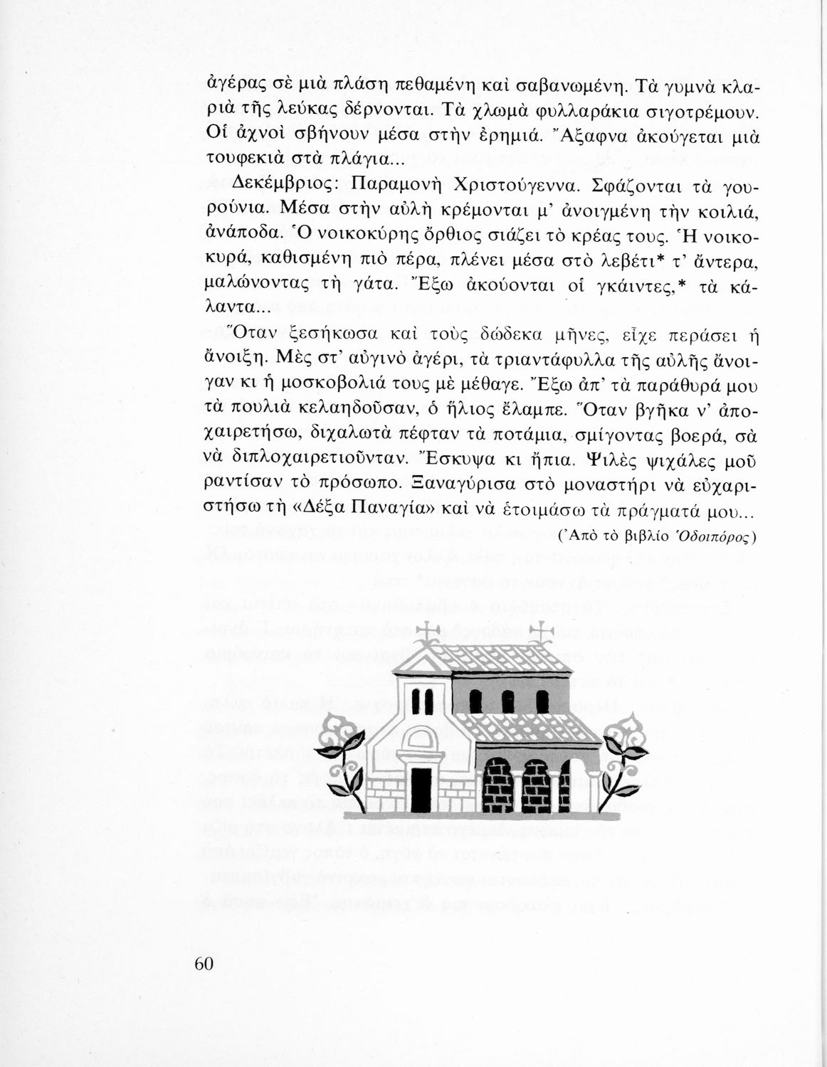 Αναγνωστικό για τις Ε' και ΣΤ΄ Δημοτικού που περιλαμβάνει πεζά και ποιήματα της Νέας Ελληνικής Λογοτεχνίας εμπνευσμένα από την καθημερινότητα των παιδιών και των οικογενειών τους, την ελληνική ιστορία, τις οικογενειακές στιγμές και εορτές, το παιχνίδι και την εθνική παράδοση, και τα δημοτικά και ακριτικά τραγούδια. Περιέχει και 5 κείμενα γραμμένα στην καθαρεύουσα με θέματα από τον κοινωνικό και εθνικό βίο, και ερμηνευτικό λεξιλόγιο.. Το βιβλίο είναι αφιερωμένο στη μνήμη της Πηνελόπης Δέλτα.