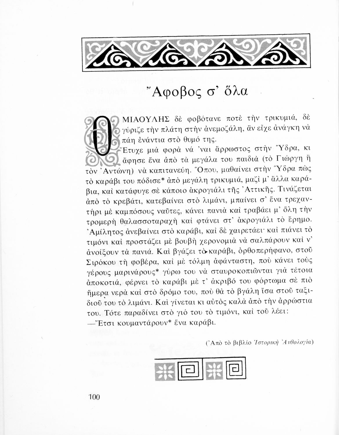 Βαθμίδα εκπαίδευσης: Πρωτοβάθμια Τάξη: Ε' Δημοτικού / ΣΤ' Δημοτικού Μάθημα: Νέα Ελληνικά Γλώσσα: Δημοτική, Καθαρεύουσα Παρουσίαση περιεχομένου: Αναγνωστικό για τις Ε' και ΣΤ΄ Δημοτικού που περιλαμβάνει πεζά και ποιήματα της Νέας Ελληνικής Λογοτεχνίας εμπνευσμένα από την καθημερινότητα των παιδιών και των οικογενειών τους, την ελληνική ιστορία, τις οικογενειακές στιγμές και εορτές, το παιχνίδι και την εθνική παράδοση, και τα δημοτικά και ακριτικά τραγούδια. Περιέχει και 5 κείμενα γραμμένα στην καθαρεύουσα με θέματα από τον κοινωνικό και εθνικό βίο, και ερμηνευτικό λεξιλόγιο.. Το βιβλίο είναι αφιερωμένο στη μνήμη της Πηνελόπης Δέλτα. |