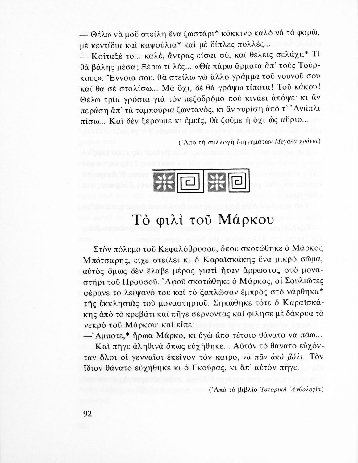 LDR 02167 2200229 4500 035 ## _a20-02533 040 ## _aΚΕΝΕΚ - Εταιρεία Σπουδών Νεοελληνικού Πολιτισμού και Παιδείας 041 ## _ael 100 ## _aΜιχ. Δ. Στασινόπουλος _aΓιώργος Π. Σαββίδης _aΑριστείδης Βουγιούκας _aΑλέξης Δημαράς _aΚαλή Δοξιάδη _aΓιώργος Ιωάννου _aΛίνα Κάσδαγλη _aΚαλλιόπη Μουστάκα 110 ## _a2533 245 0# _aΑνθολόγιο για τα παιδιά του Δημοτικού, μέρος τρίτο 250 ## _a1η Έκδοση 260 ## _aΑθήνα _bΟργανισμός Εκδόσεως Διδακτικών Βιβλίων _c1975 300 ## _a354 _bΕξώφυλλο (έγχρωμο), Σκίτσα (έγχρωμα) _c19 520 ## _aΑναγνωστικό για τις Ε' και ΣΤ΄ Δημοτικού που περιλαμβάνει πεζά και ποιήματα της Νέας Ελληνικής Λογοτεχνίας εμπνευσμένα από την καθημερινότητα των παιδιών και των οικογενειών τους, την ελληνική ιστορία, τις οικογενειακές στιγμές και εορτές, το παιχνίδι και την εθνική παράδοση, και τα δημοτικά και ακριτικά τραγούδια. Περιέχει και 5 κείμενα γραμμένα στην καθαρεύουσα με θέματα από τον κοινωνικό και εθνικό βίο, και ερμηνευτικό λεξιλόγιο.. Το βιβλίο είναι αφιερωμένο στη μνήμη της Πηνελόπης Δέλτα. 521 ## _aΕ' Δημοτικού / ΣΤ' Δημοτικού 522 ## _aΕλλάδα 546 ## _aΔημοτική, Καθαρεύουσα 563 ## _aΜαλακό Εξώφυλλο 583 ## _a2618/7-6-1975 _c1975 650 #4 _aΔημοτικά τραγούδια _aΛαϊκοί μύθοι _aΞενόπουλος _aΣολωμός 700 ## _aΑγ. Αστεριάδης