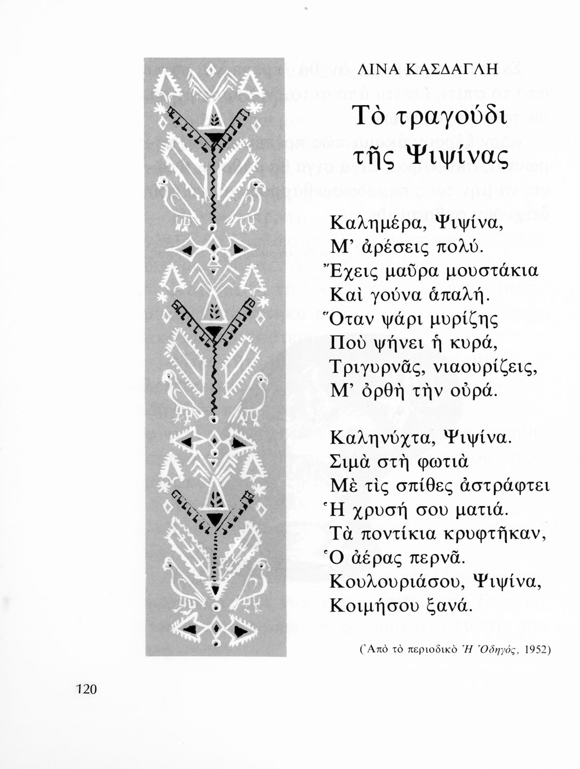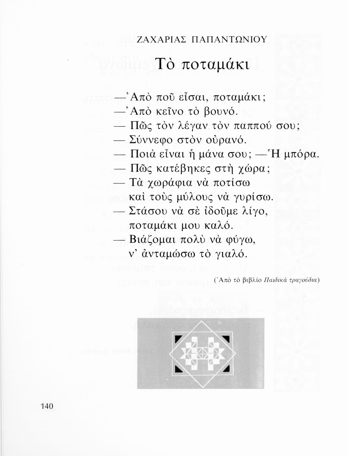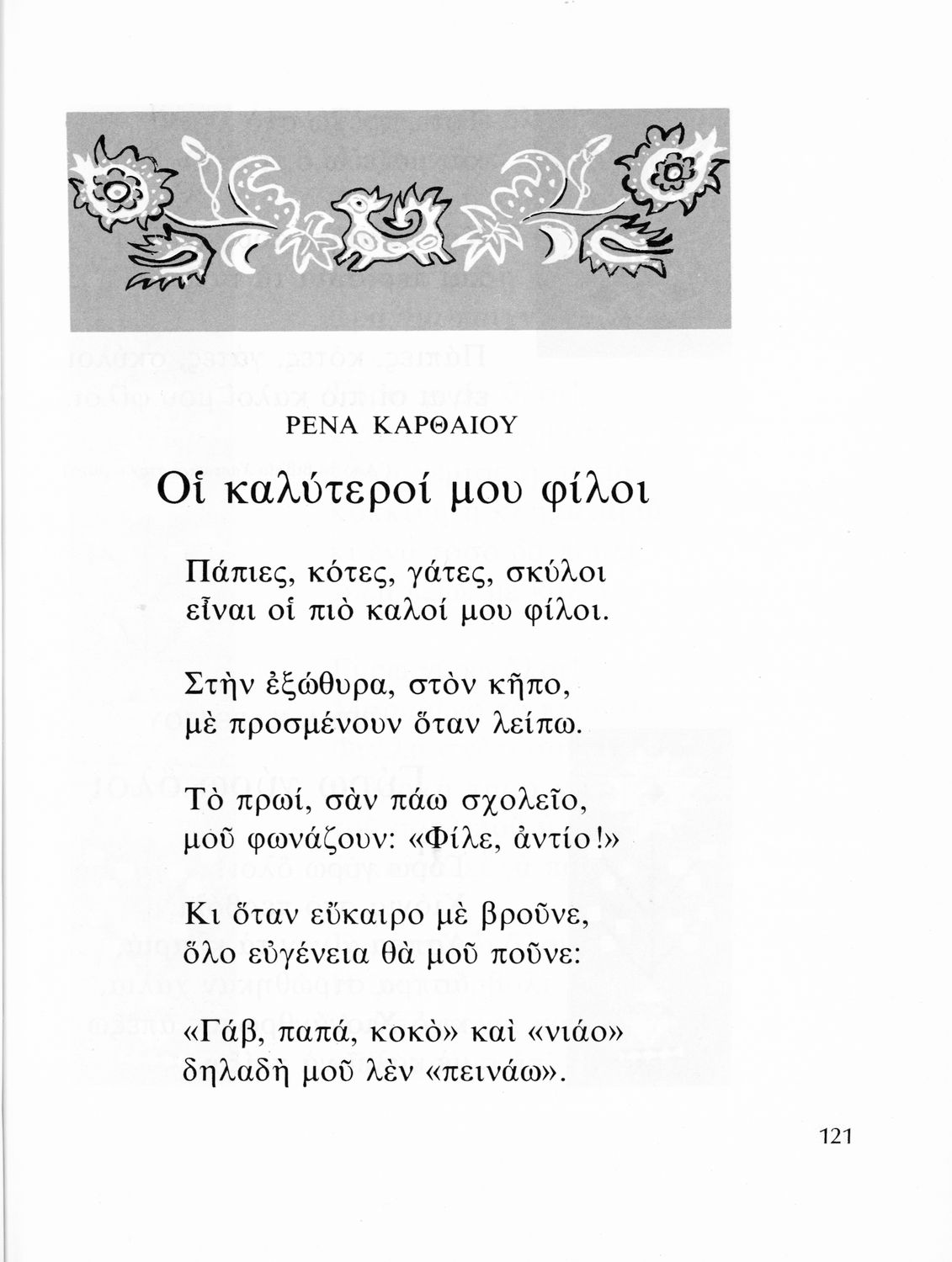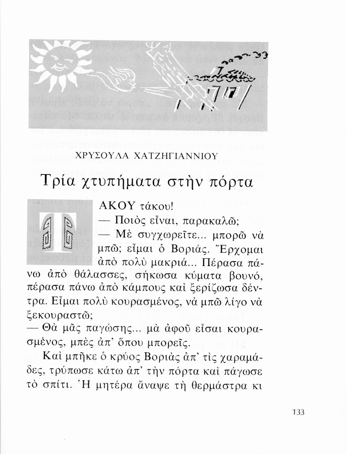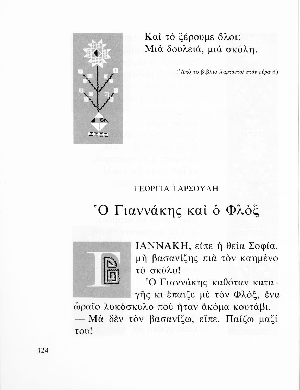 Αναγνωστικό που περιλαμβάνει πεζά και ποιήματα της νέας ελληνικής λογοτεχνίας για τους μαθητές του Δημοτικού. Το βιβλίο είναι αφιερωμένο στη μνήμη του Ζαχαρία Παπαντωνίου και αναδημοσιεύει αρκετά κείμενα από τα αναγνωστικά των εκπαιδευτικών μεταρρυθμίσεων του Ελευθερίου Βενιζέλου.