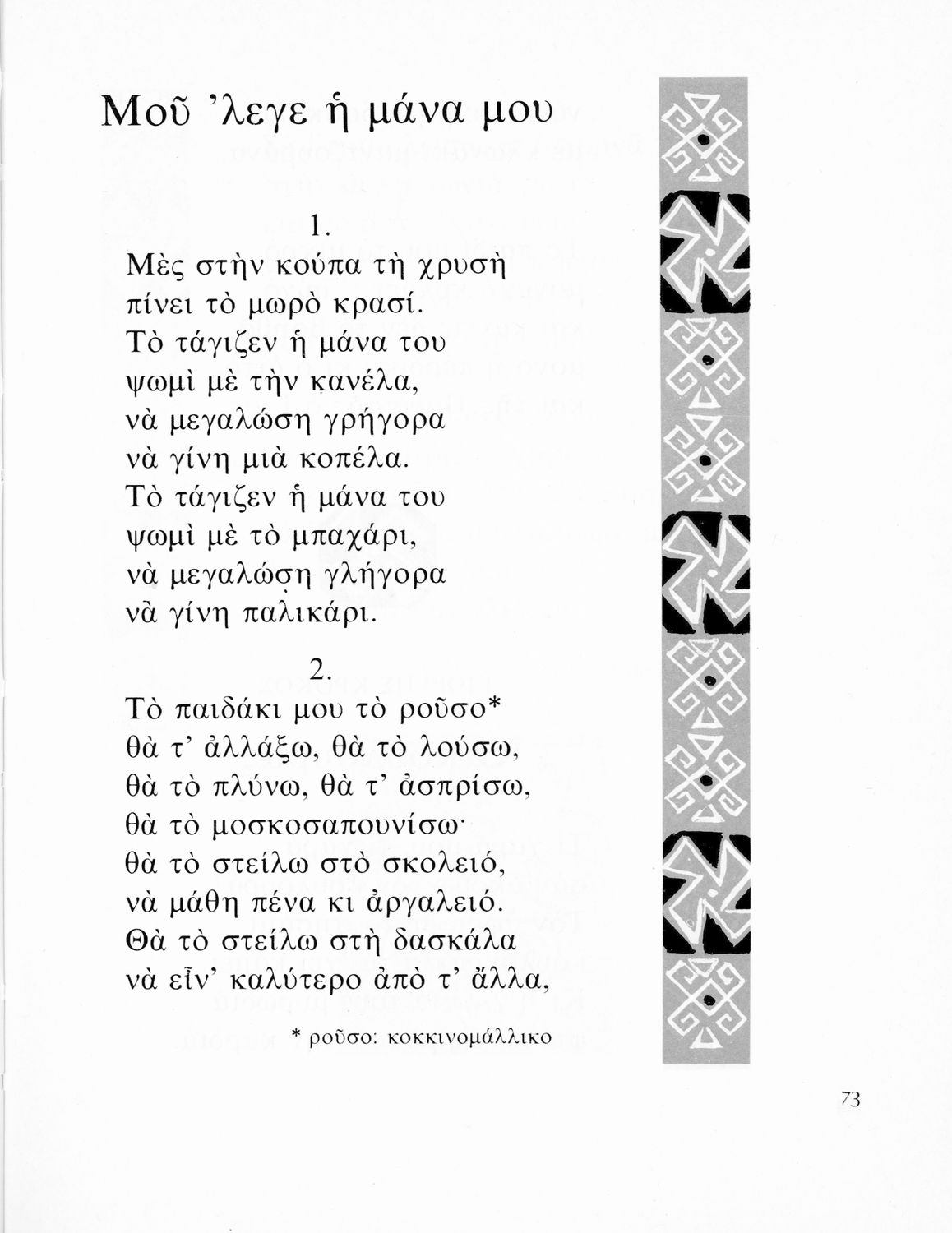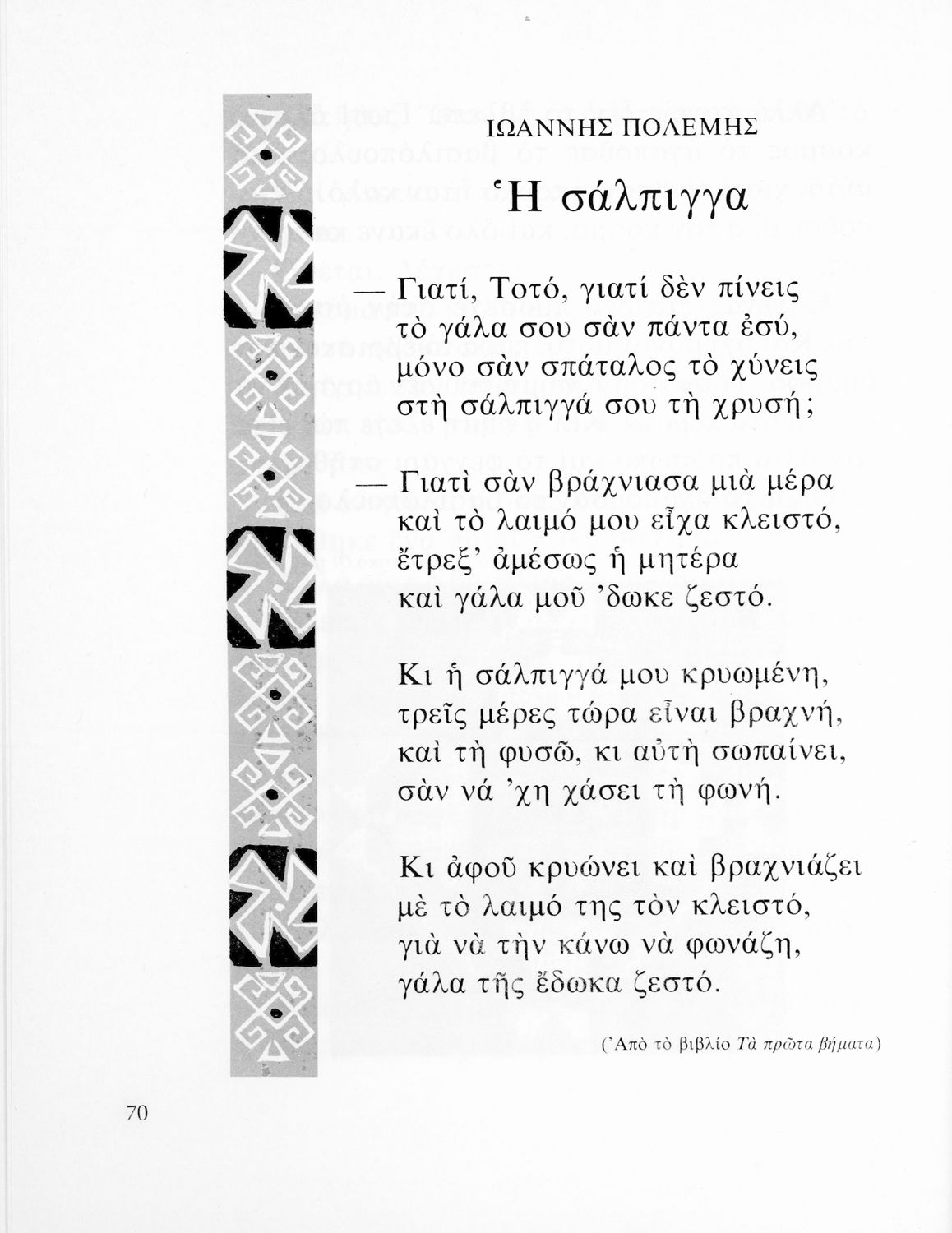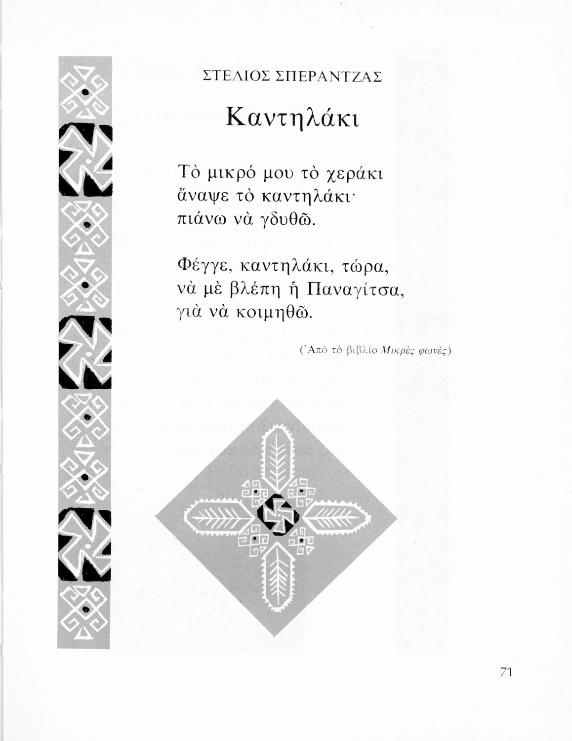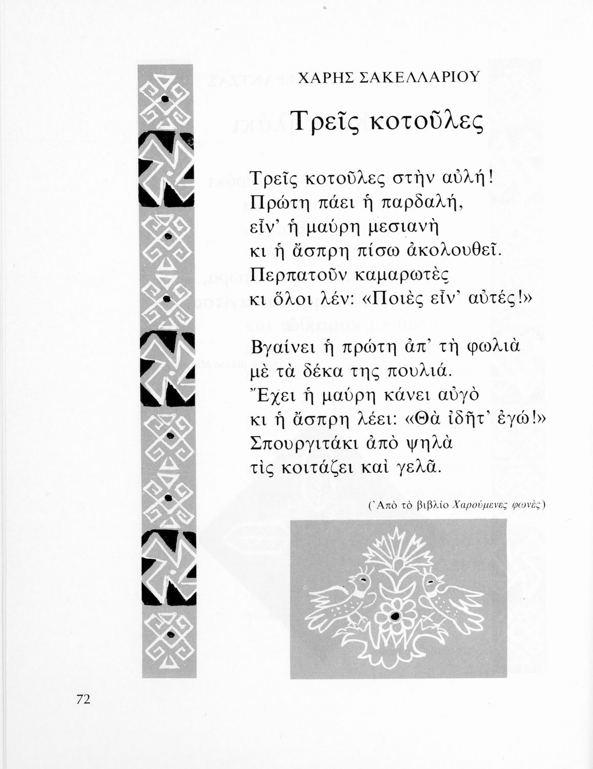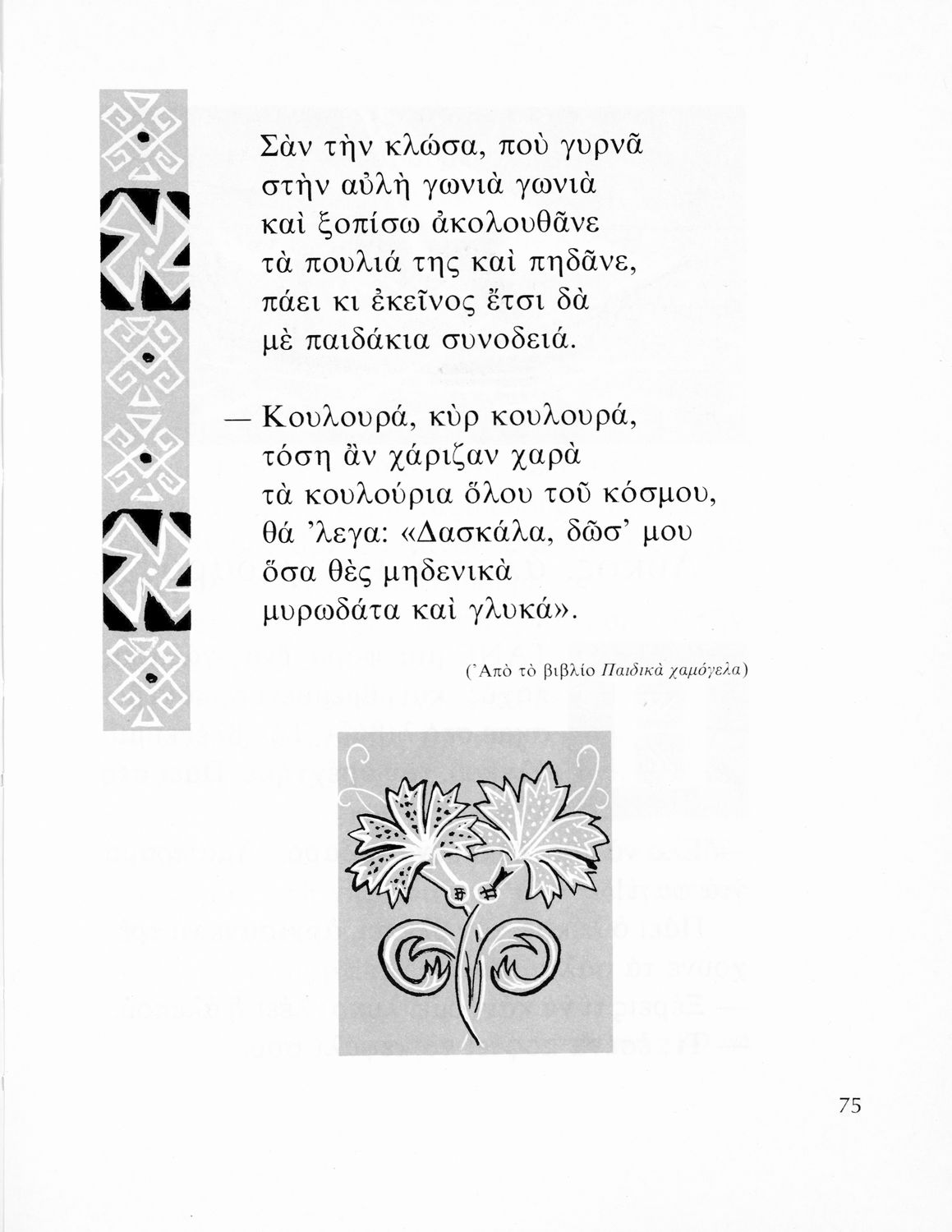 Αναγνωστικό που περιλαμβάνει πεζά και ποιήματα της νέας ελληνικής λογοτεχνίας για τους μαθητές του Δημοτικού. Το βιβλίο είναι αφιερωμένο στη μνήμη του Ζαχαρία Παπαντωνίου και αναδημοσιεύει αρκετά κείμενα από τα αναγνωστικά των εκπαιδευτικών μεταρρυθμίσεων του Ελευθερίου Βενιζέλου.