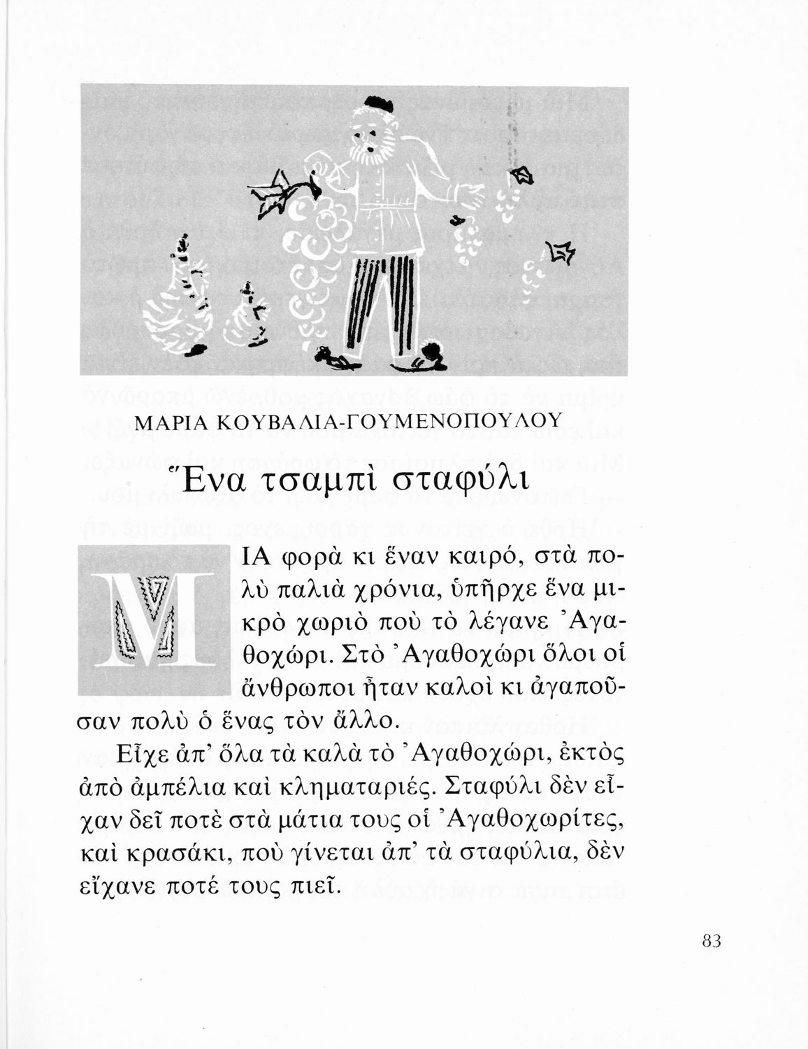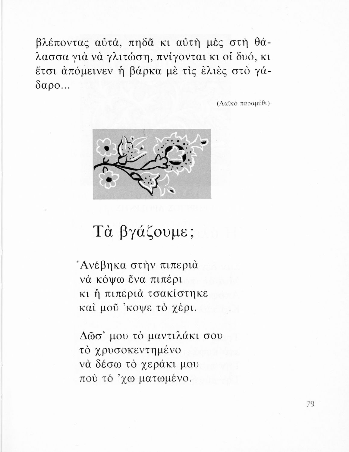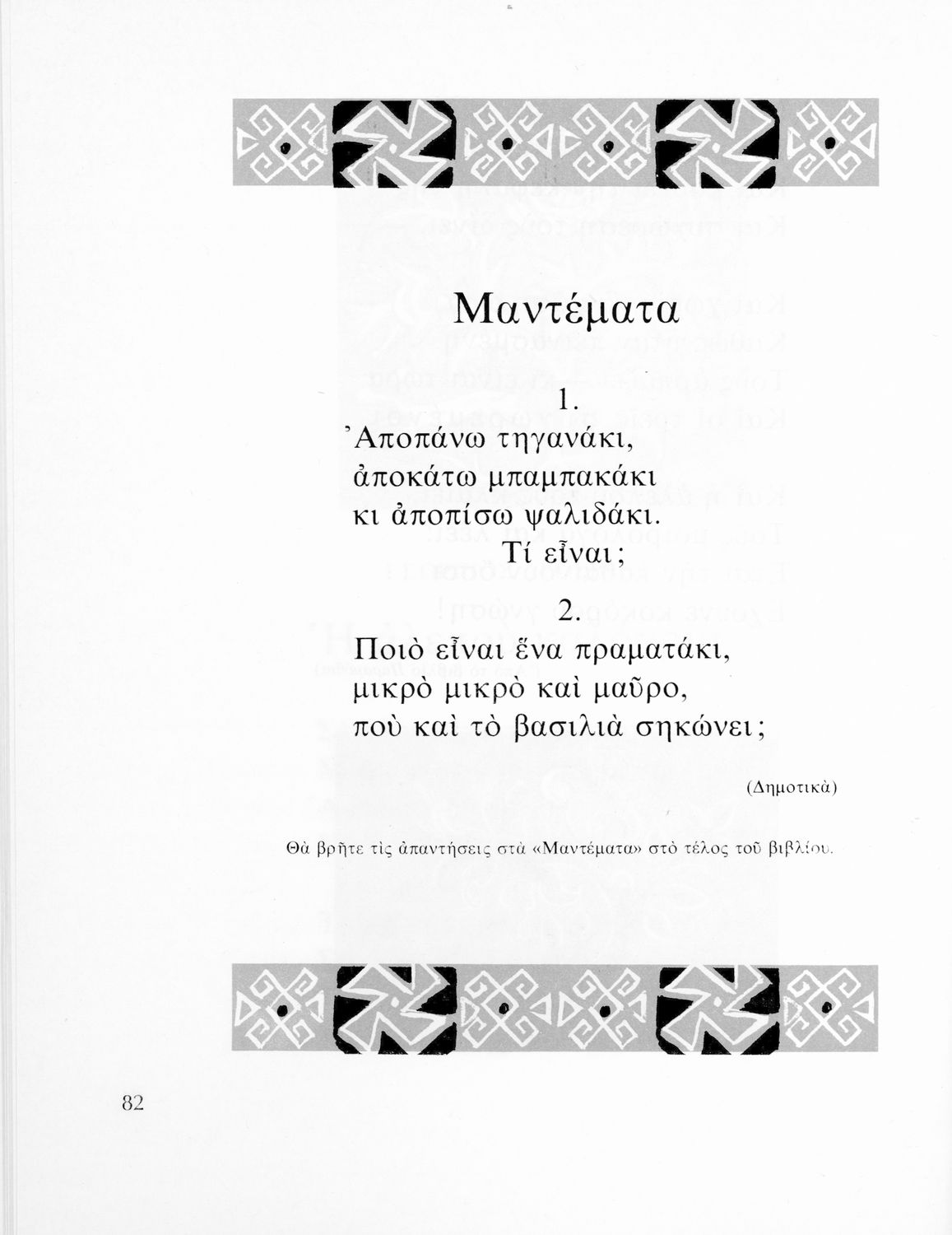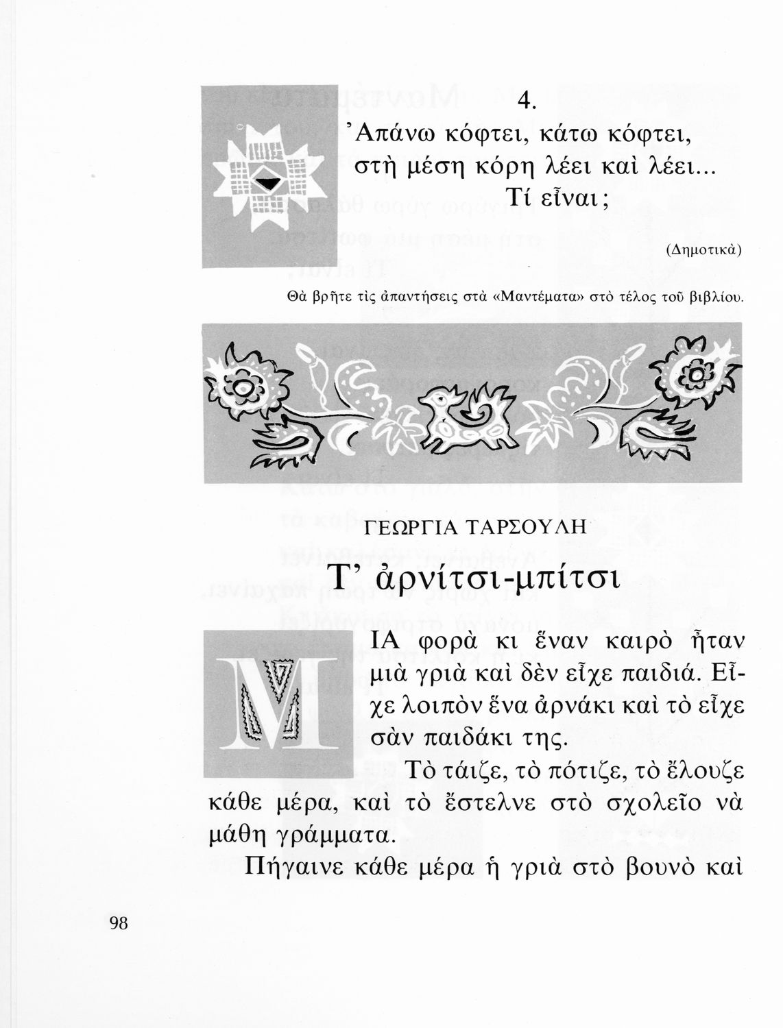 Αναγνωστικό που περιλαμβάνει πεζά και ποιήματα της νέας ελληνικής λογοτεχνίας για τους μαθητές του Δημοτικού. Το βιβλίο είναι αφιερωμένο στη μνήμη του Ζαχαρία Παπαντωνίου και αναδημοσιεύει αρκετά κείμενα από τα αναγνωστικά των εκπαιδευτικών μεταρρυθμίσεων του Ελευθερίου Βενιζέλου.