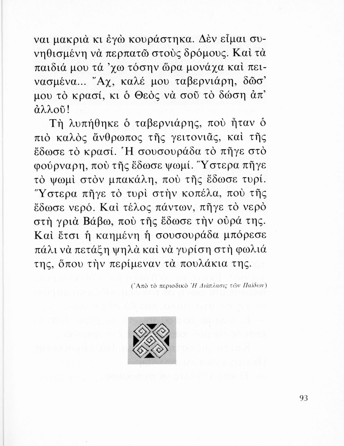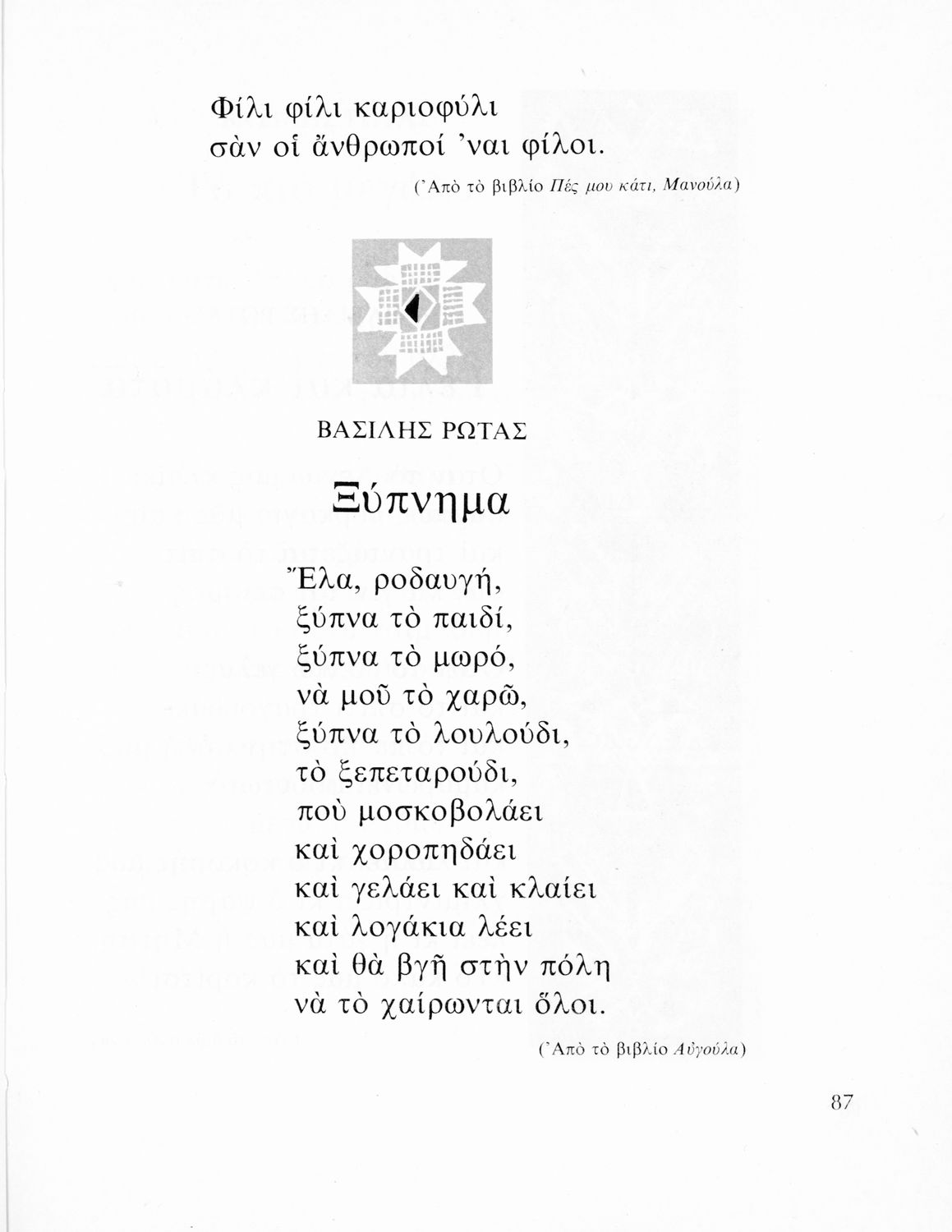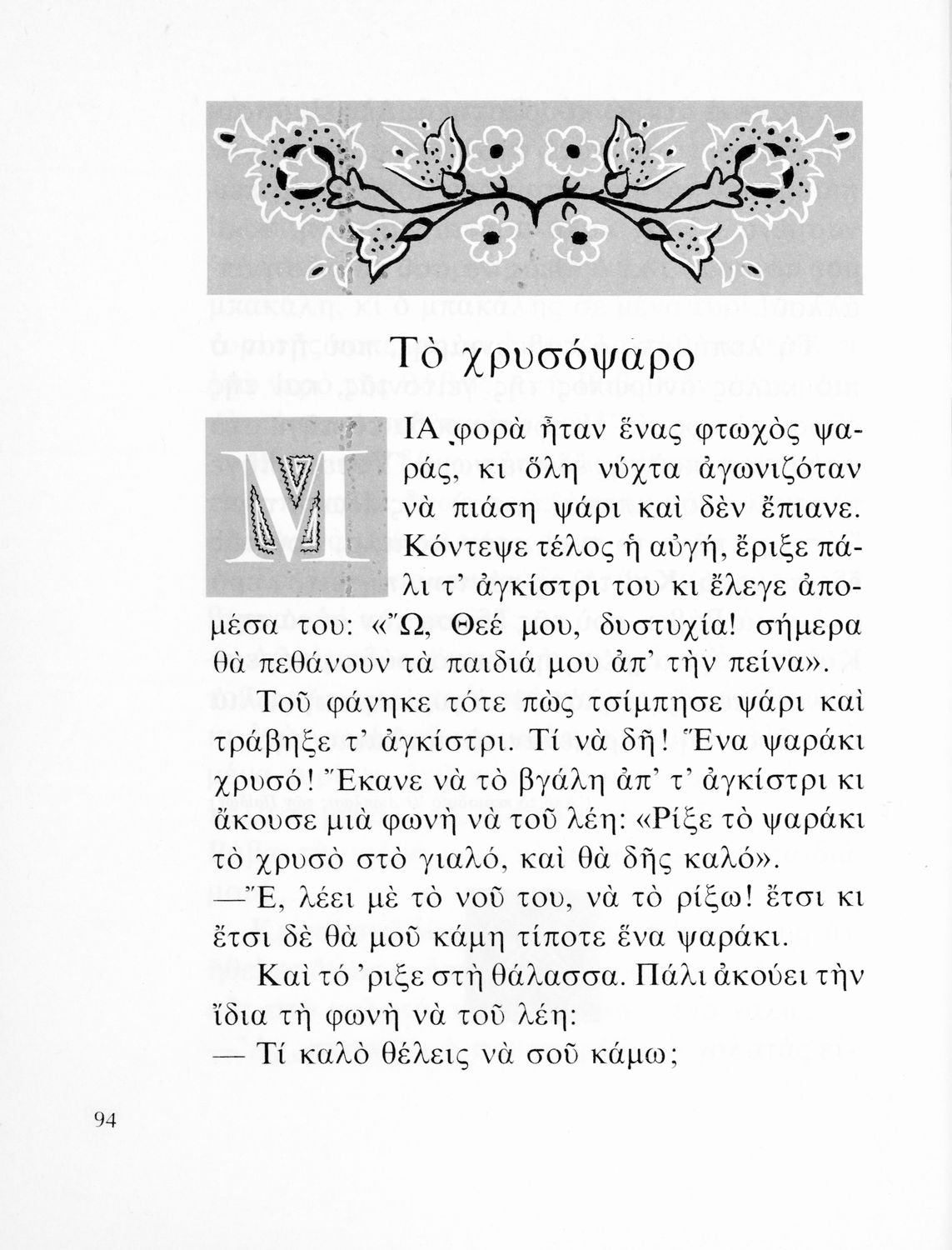 Αναγνωστικό που περιλαμβάνει πεζά και ποιήματα της νέας ελληνικής λογοτεχνίας για τους μαθητές του Δημοτικού. Το βιβλίο είναι αφιερωμένο στη μνήμη του Ζαχαρία Παπαντωνίου και αναδημοσιεύει αρκετά κείμενα από τα αναγνωστικά των εκπαιδευτικών μεταρρυθμίσεων του Ελευθερίου Βενιζέλου.