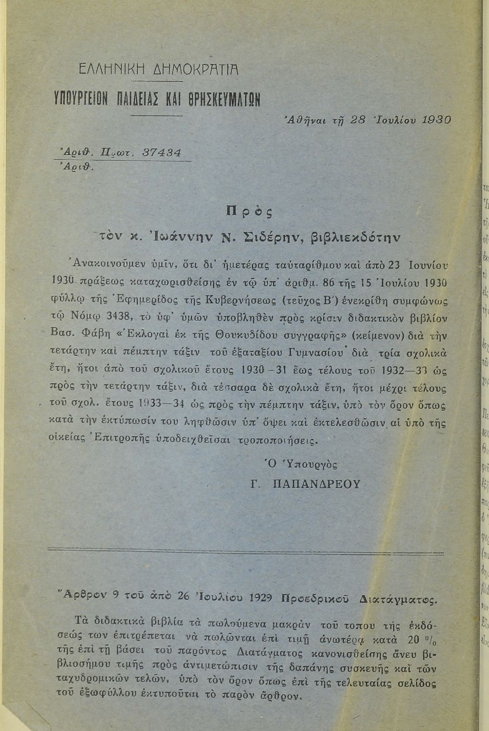 Υπουργική απόφαση / Σύμβαση: 37434/15-7-1930