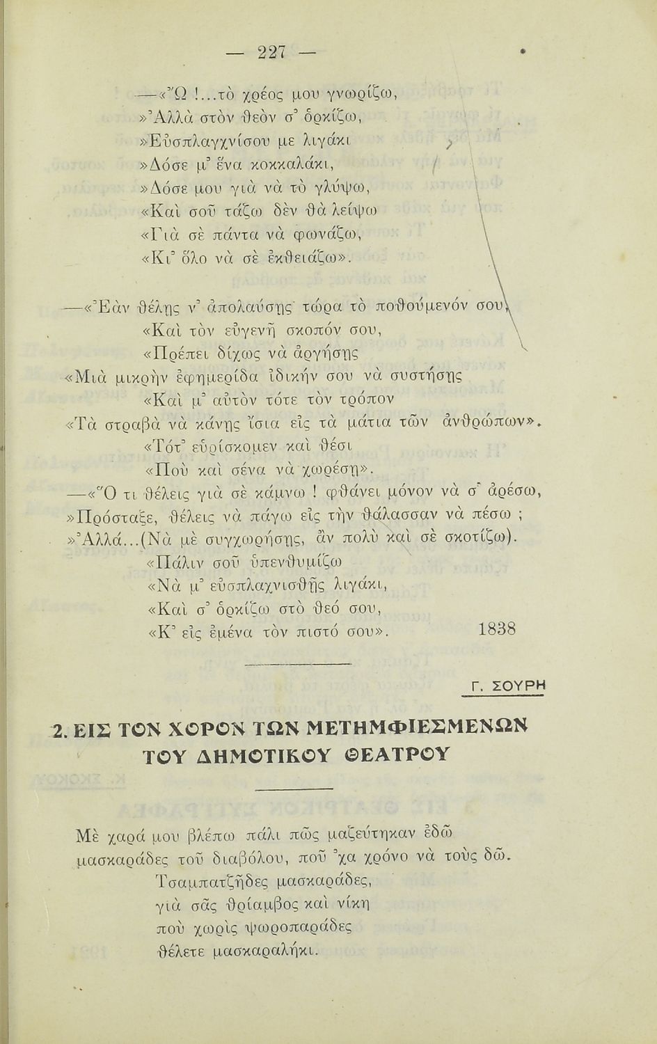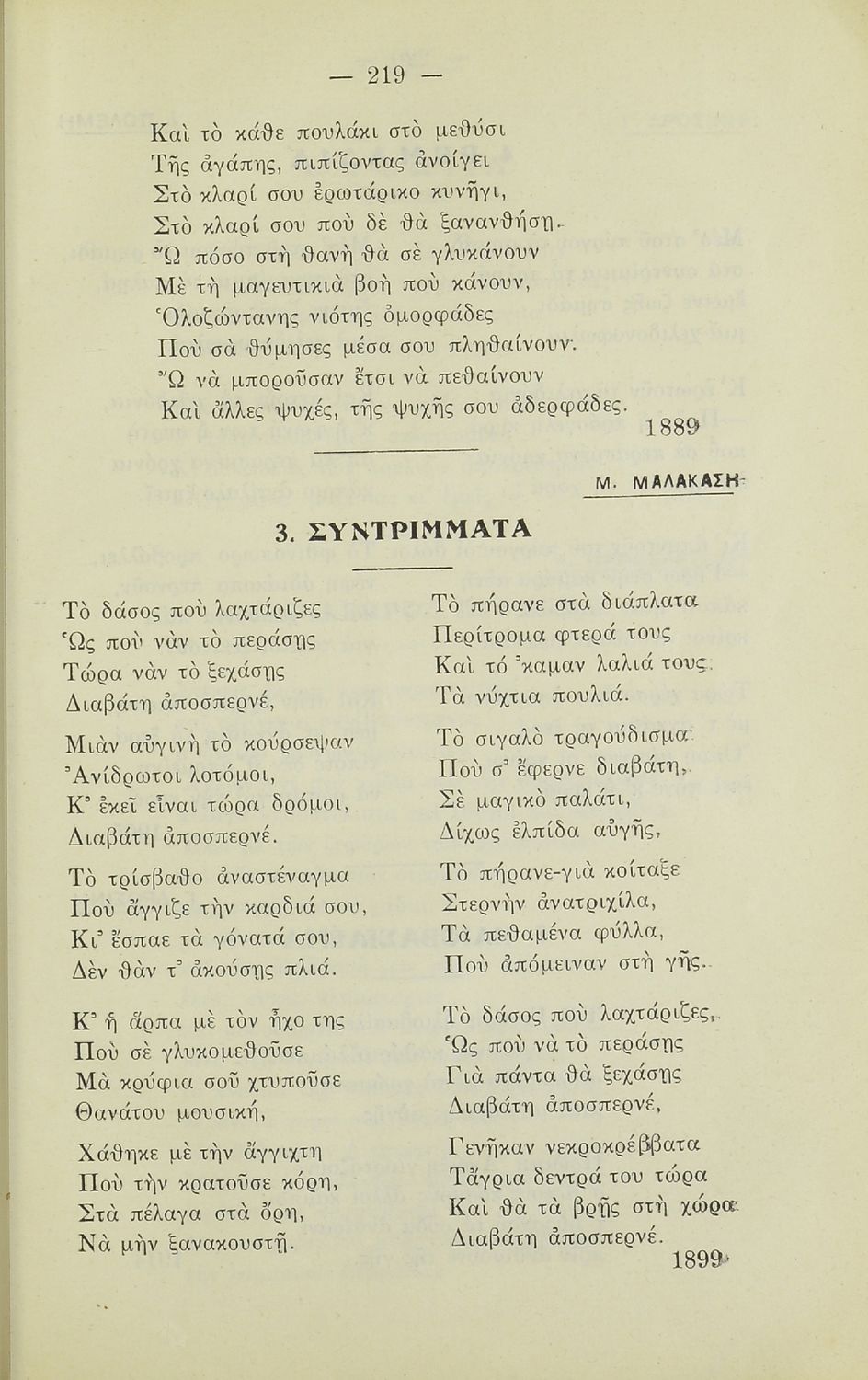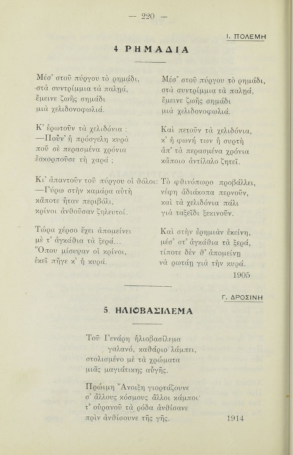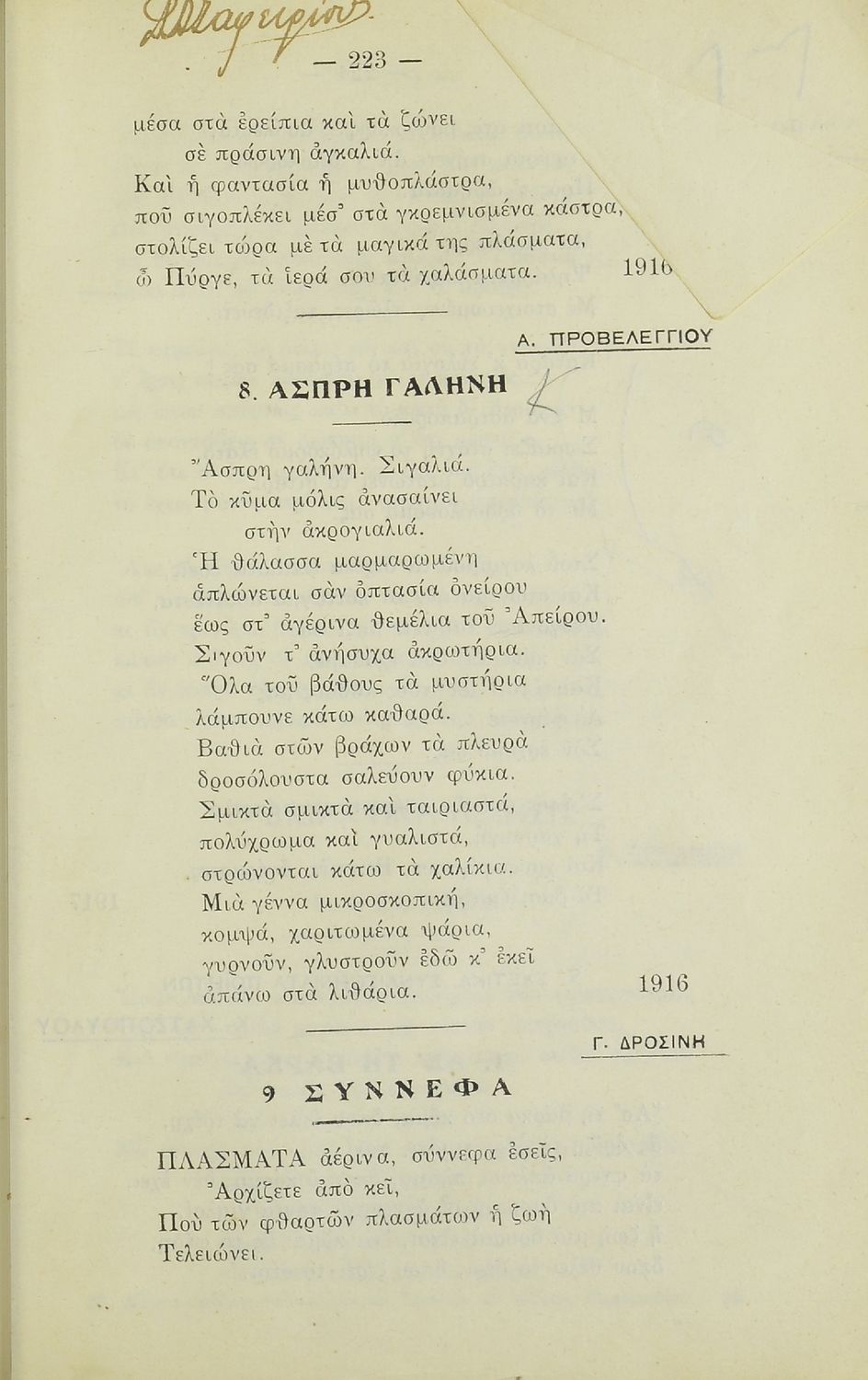 Σχολικό εγχειρίδιο για την Β΄ Γυμνασίου και την Γ΄ Αστικού Θηλέων για το μάθημα των Νέων Ελληνικών. Το εγχειρίδιο αποτελείται από κείμενα πεζού λόγου, επικολυρικά ποιήματα, ωδές, ηθογραφικά διηγήματα, ρητορικά