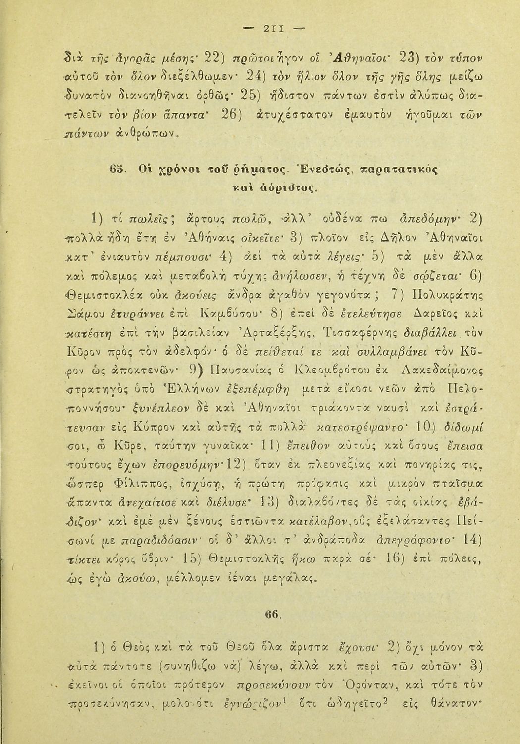 Βαθμίδα εκπαίδευσης: Δευτεροβάθμια Τάξη: Γυμνάσιο Μάθημα: Αρχαία Ελληνικά Γλώσσα: Καθαρεύουσα Παρουσίαση περιεχομένου: Σχολικό εγχειρίδιο Αρχαίων Ελληνικών Γυμνασίου που εξετάζει τα μέρη του λόγου και την σύνταξή τους. |