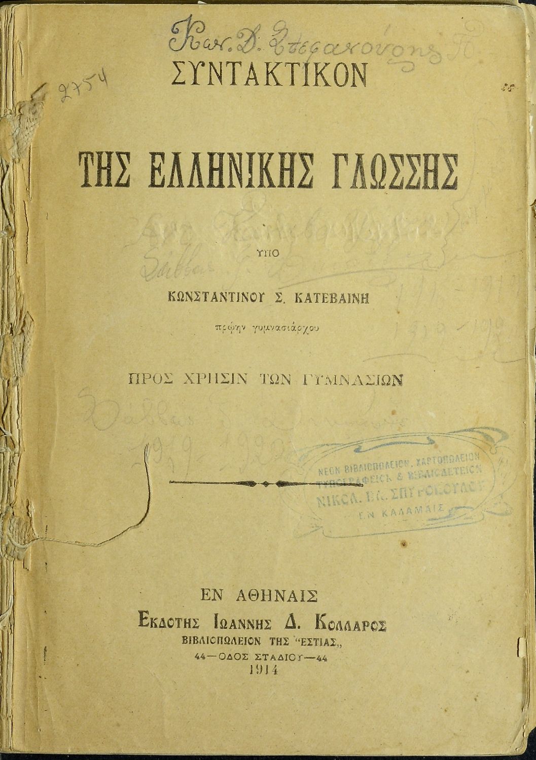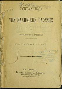 Κωδικός αναγνώρισης: 20-02754 Τίτλος: Συντακτικόν της ελληνικής γλώσσης προς χρήσιν των Γυμνασίων Συγγραφέας: Κωνσταντίνος Σ. Κατεβαίνης Μέγεθος και υπόστρωμα: Σχολικό εγχειρίδιο, 19εκ., μαλακό εξώφυλλο, 238 σελίδες. |