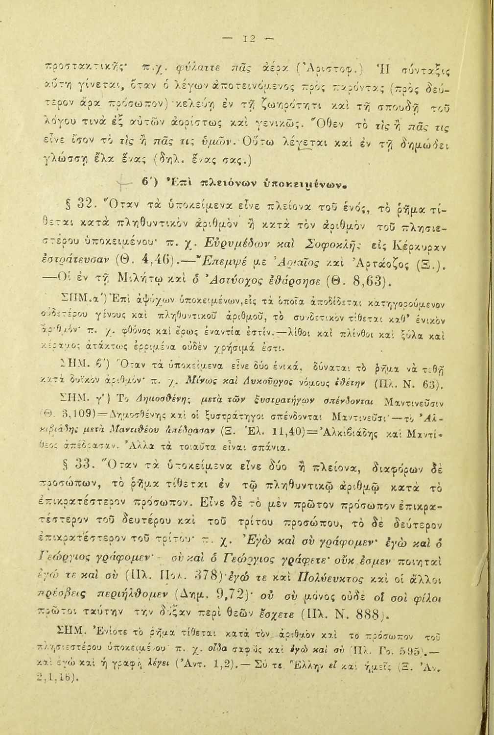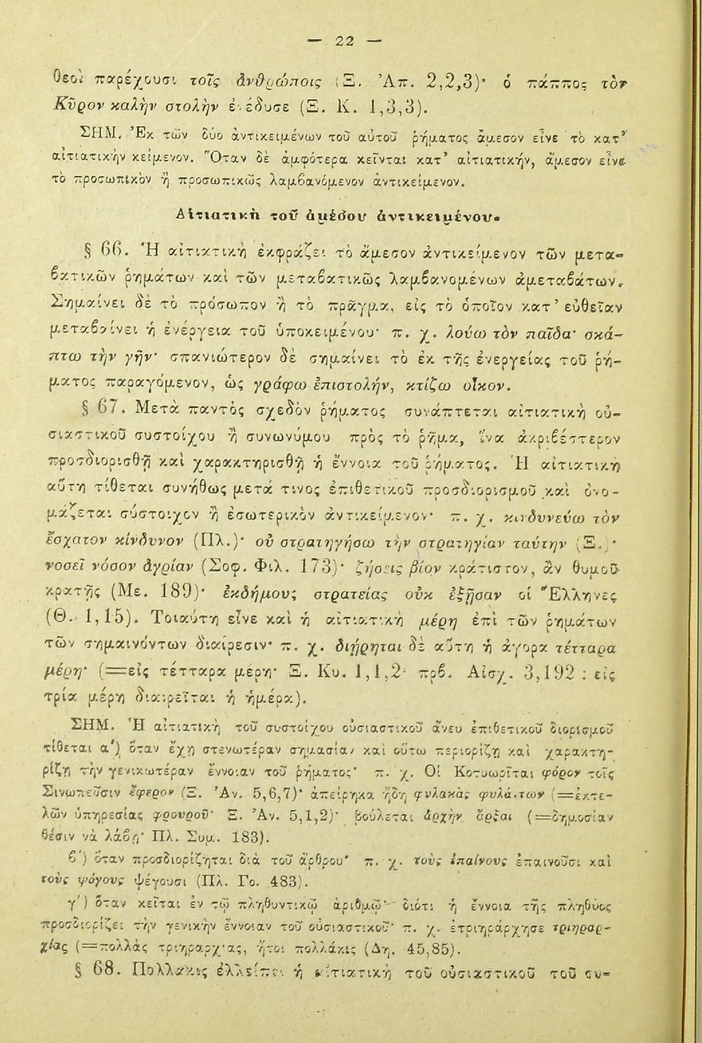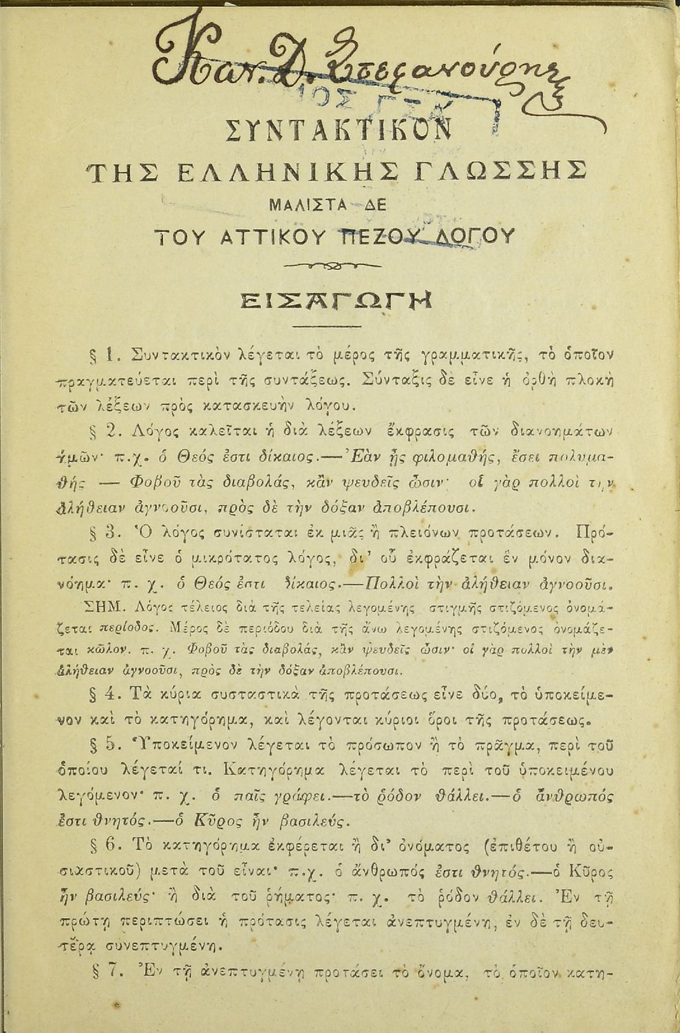 Βαθμίδα εκπαίδευσης: Δευτεροβάθμια Τάξη: Γυμνάσιο Μάθημα: Αρχαία Ελληνικά Γλώσσα: Καθαρεύουσα Παρουσίαση περιεχομένου: Σχολικό εγχειρίδιο Αρχαίων Ελληνικών Γυμνασίου που εξετάζει τα μέρη του λόγου και την σύνταξή τους. |
