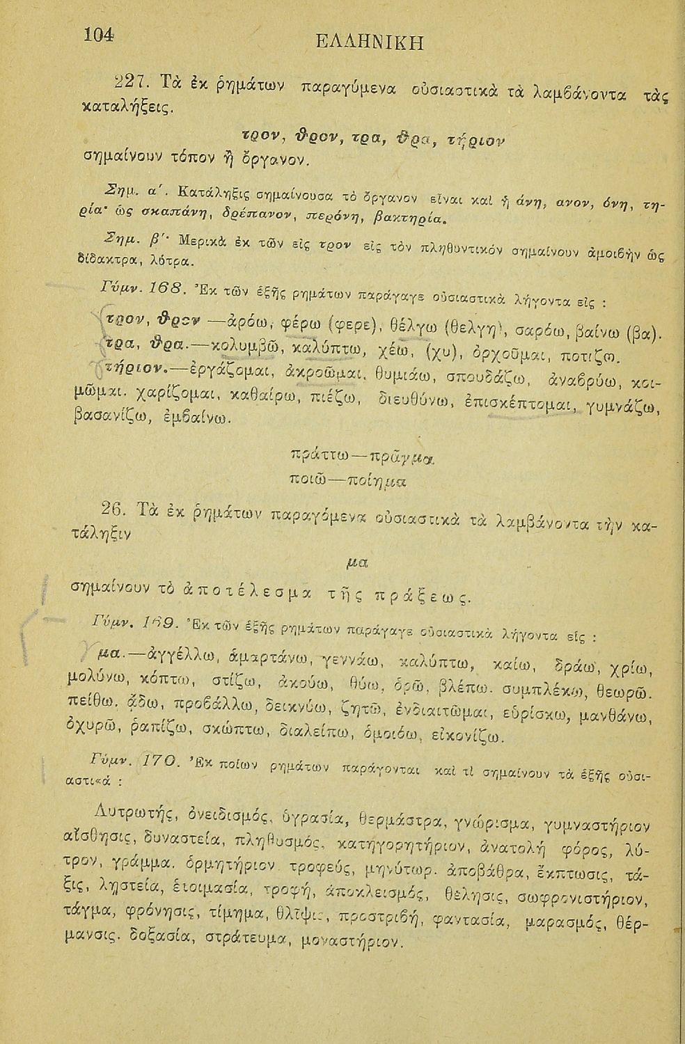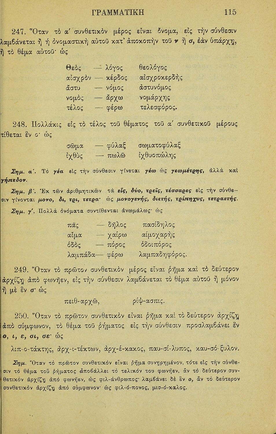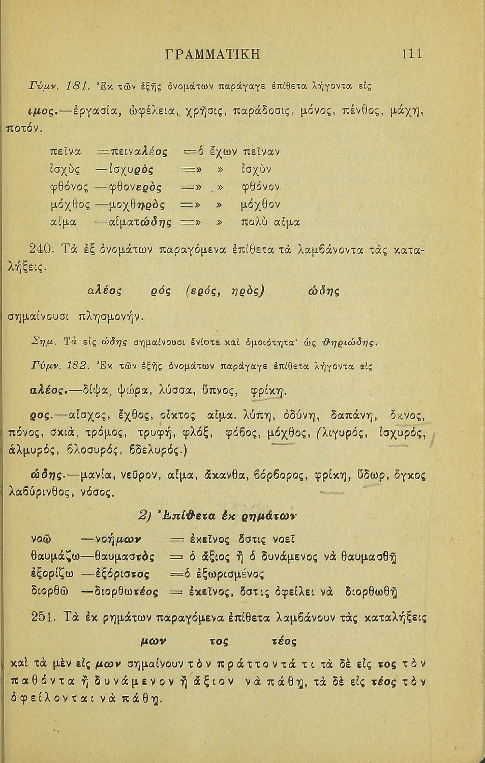 Σχολικό εγχειρίδιο Αρχαίων Ελληνικών για τα Ελληνικά Σχολεία και Παρθεναγωγεία που περιέχει τους κανόνες γραμματικής και είναι χωρισμένο σε φθογγολογικό, τυπολογικό και ετυμολογικό μέρος.