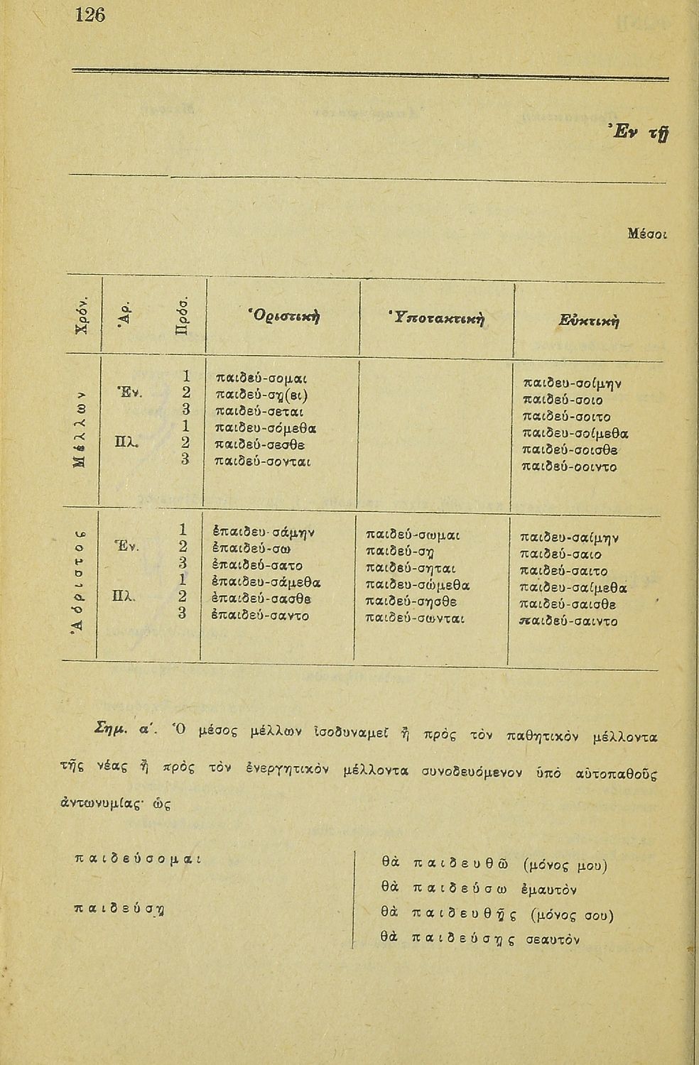 Σχολικό εγχειρίδιο που περιλαμβάνει τη γραμματική της αρχαίας ελληνικής, λεξικό ρημάτων και τους βασικότερους κανόνες του συντακτικού.