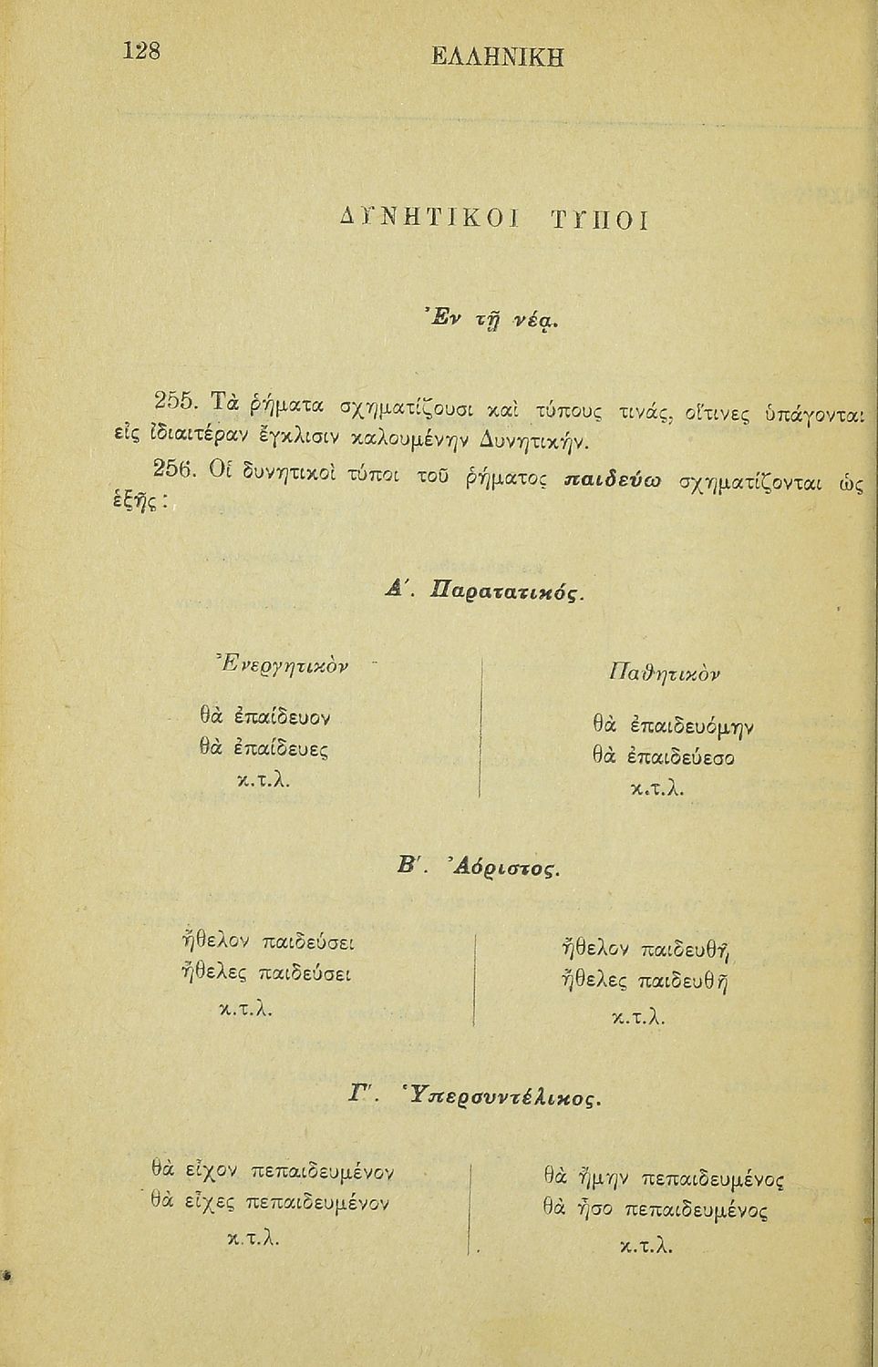 Σχολικό εγχειρίδιο Αρχαίων Ελληνικών για τα Ελληνικά Σχολεία και Παρθεναγωγεία που περιέχει τους κανόνες γραμματικής και είναι χωρισμένο σε φθογγολογικό, τυπολογικό και ετυμολογικό μέρος.