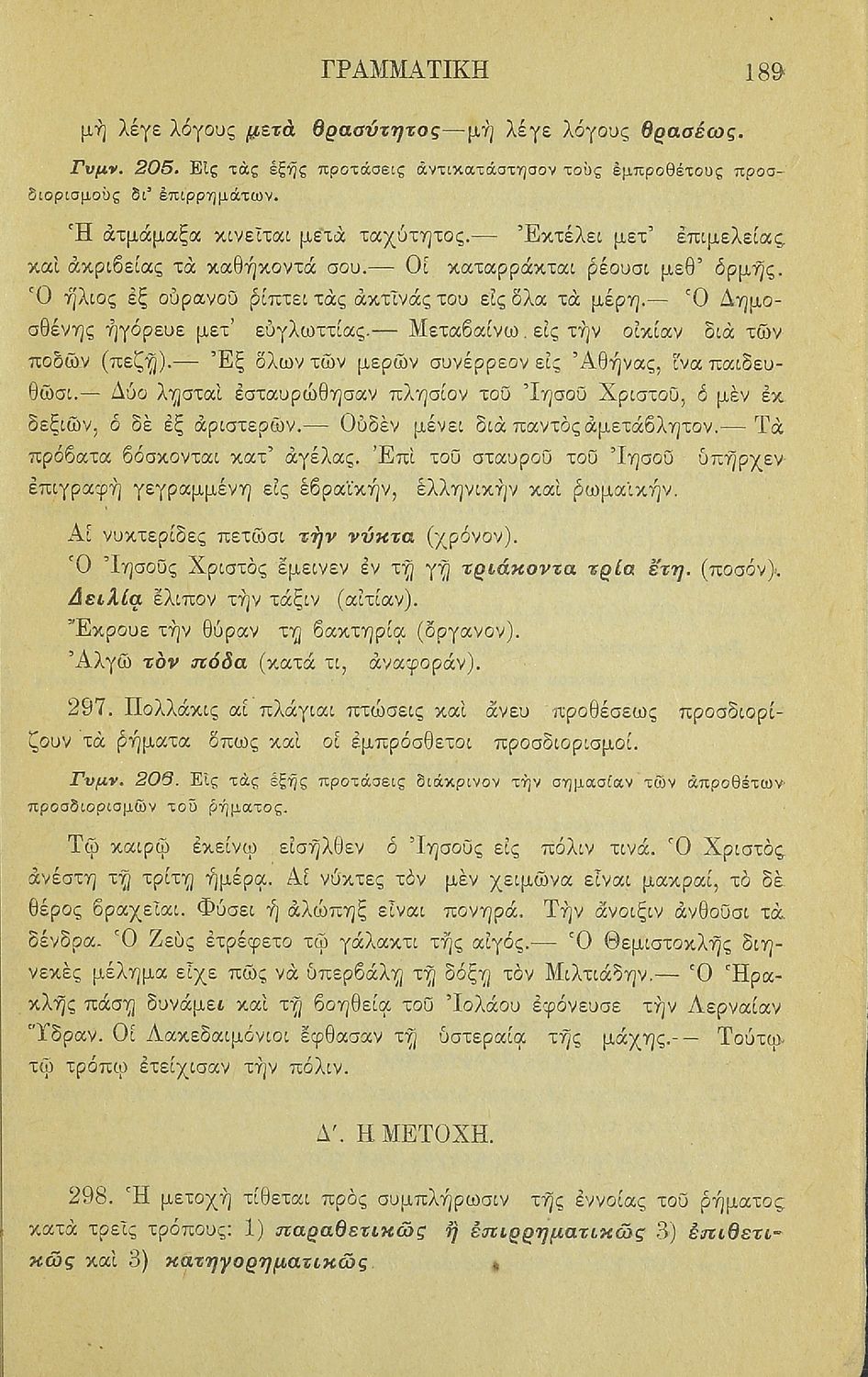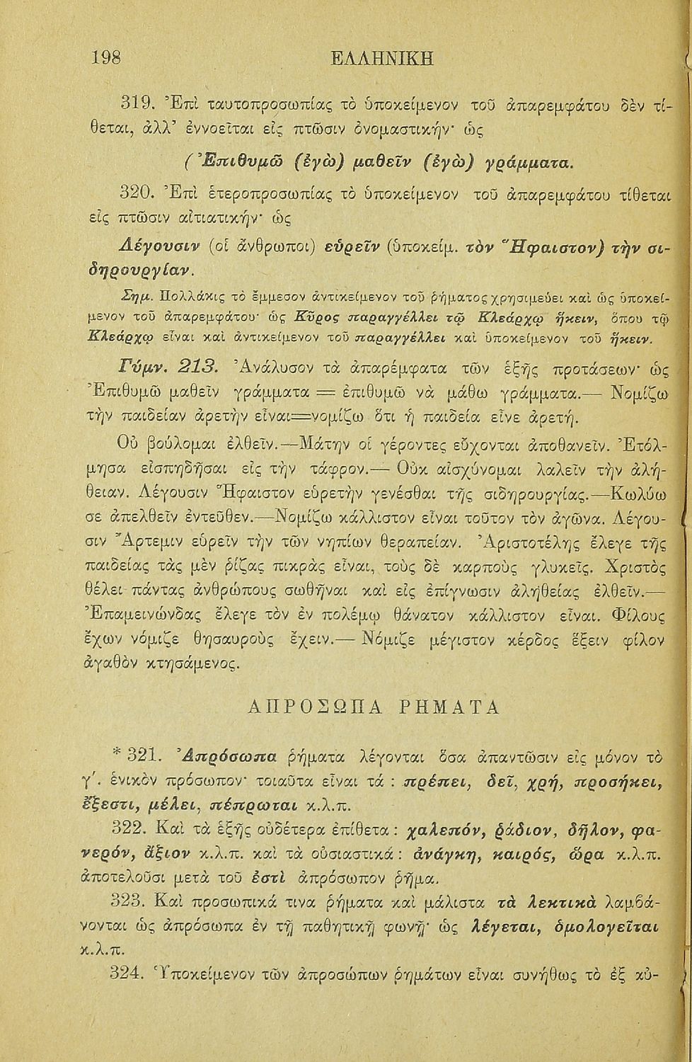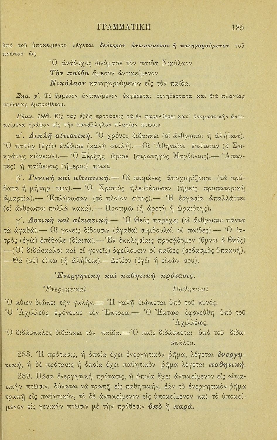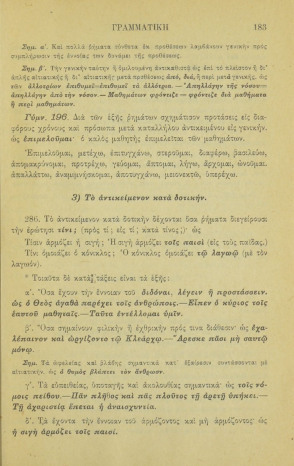Σχολικό εγχειρίδιο Αρχαίων Ελληνικών για τα Ελληνικά Σχολεία και Παρθεναγωγεία που περιέχει τους κανόνες γραμματικής και είναι χωρισμένο σε φθογγολογικό, τυπολογικό και ετυμολογικό μέρος.