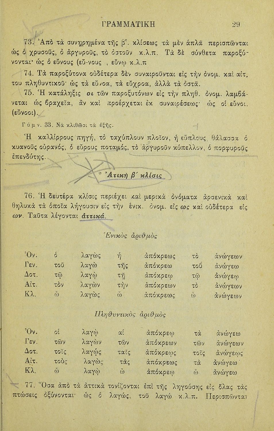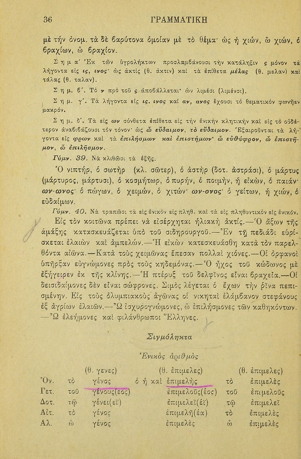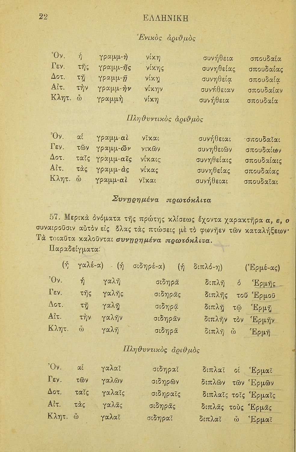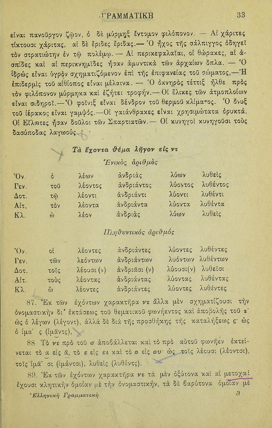 Σχολικό εγχειρίδιο Αρχαίων Ελληνικών Δημοτικού που περιλαμβάνει τους κανόνες γραμματικής και είναι χωρισμένο σε φθογγολογικό, τυπικό και ετυμολογικό μέρος.