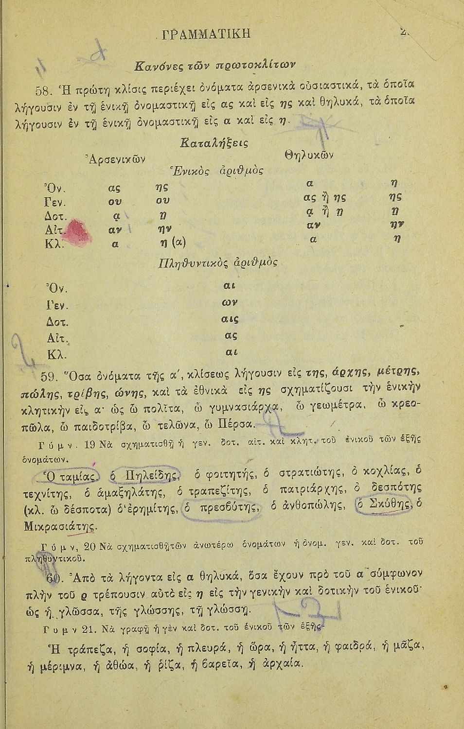 Σχολικό εγχειρίδιο Αρχαίων Ελληνικών για τα Ελληνικά Σχολεία και Παρθεναγωγεία που περιέχει τους κανόνες γραμματικής και είναι χωρισμένο σε φθογγολογικό, τυπολογικό και ετυμολογικό μέρος.