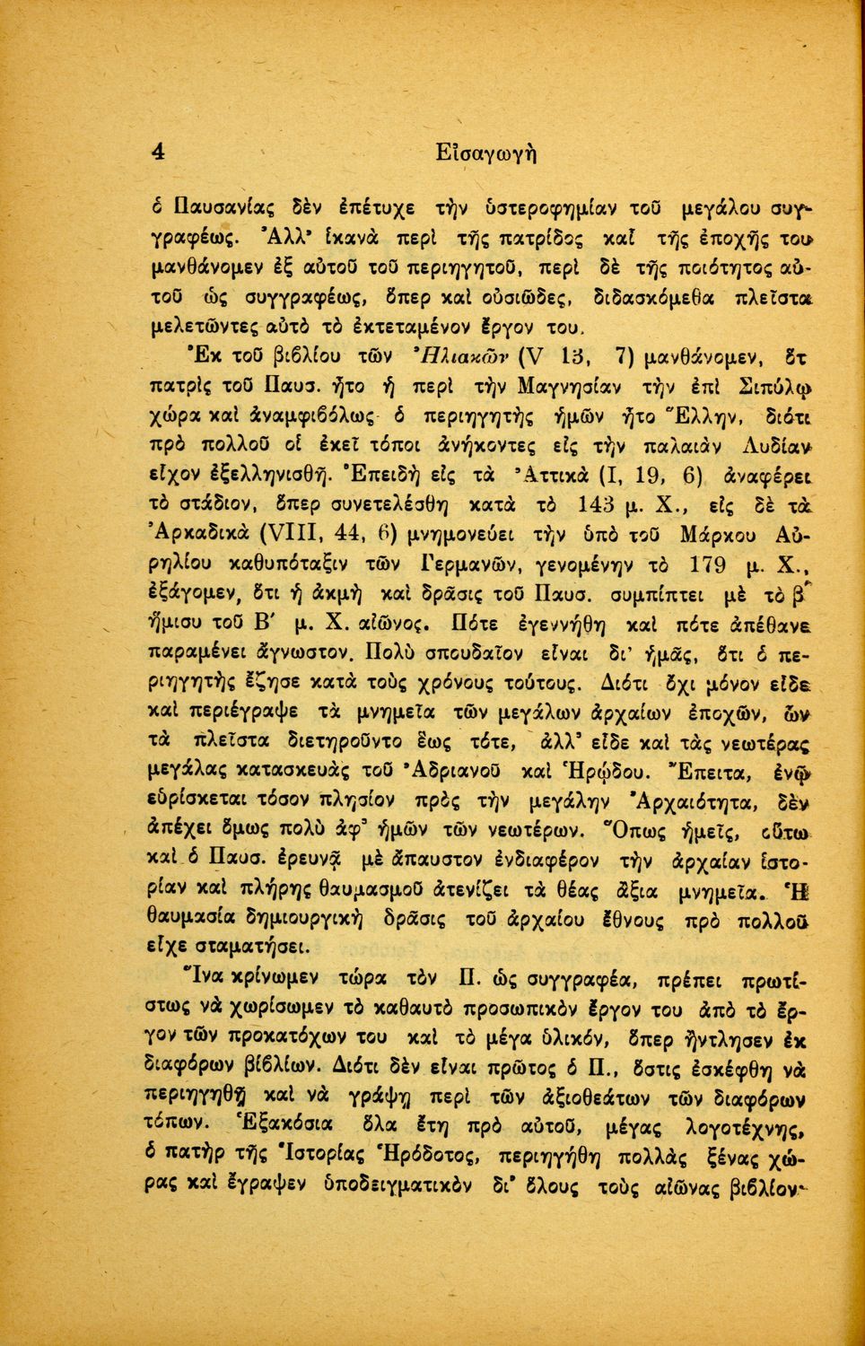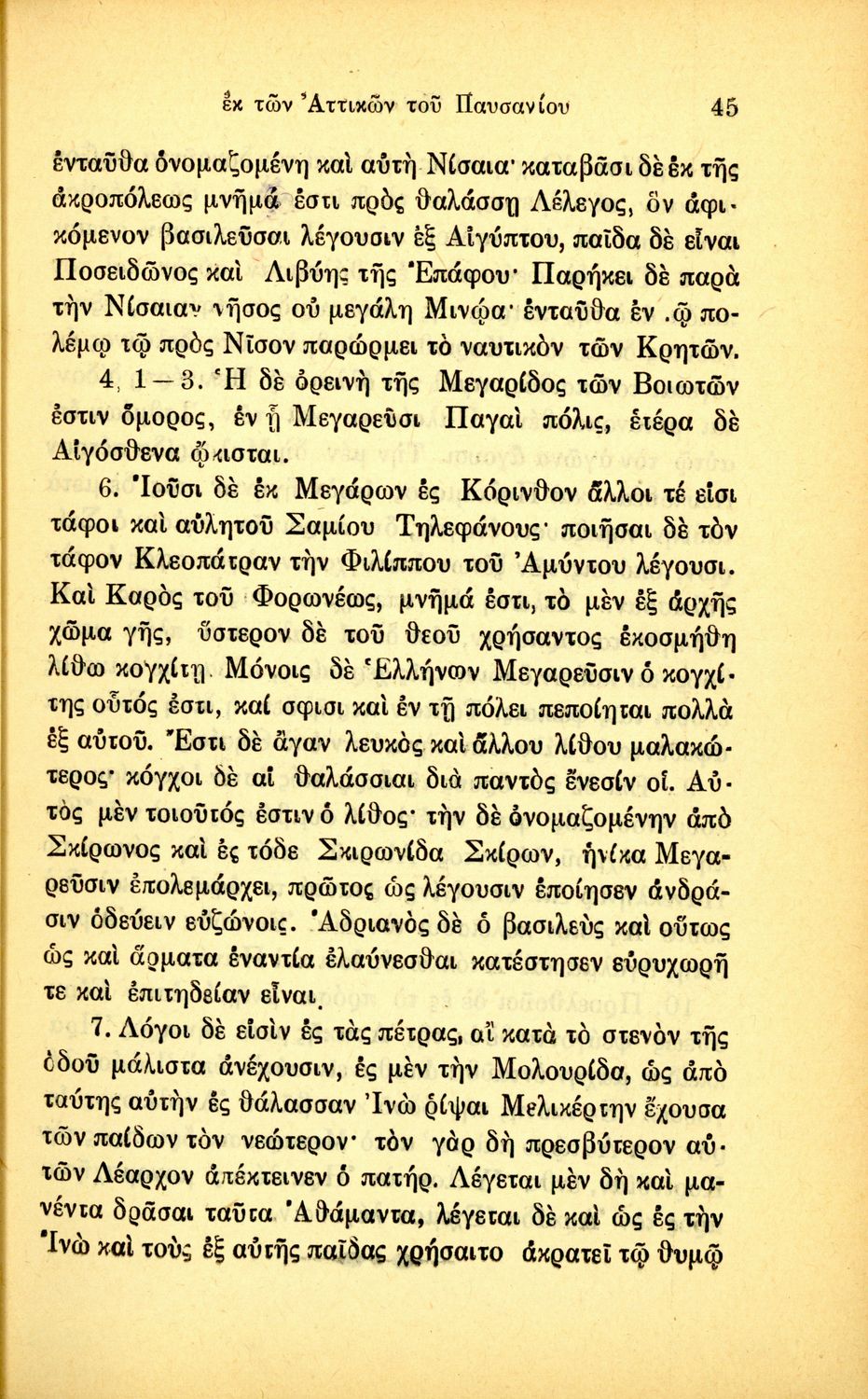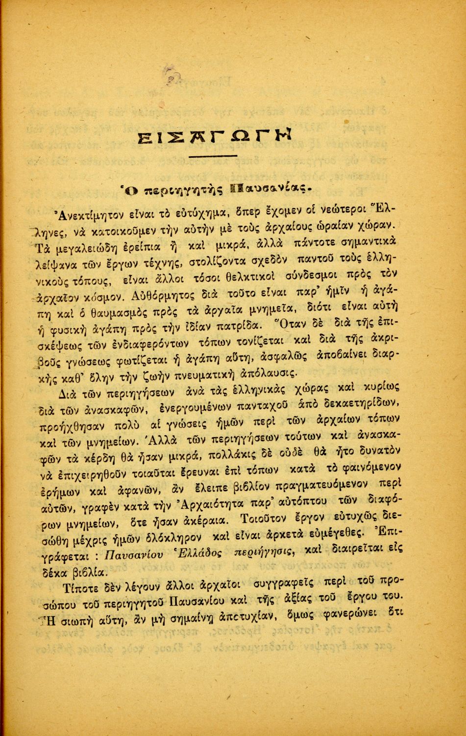 Βαθμίδα εκπαίδευσης: Δευτεροβάθμια Τάξη: Δ΄ Εξαταξίου Γυμνασίου Μάθημα: Αρχαία Ελληνικά Γλώσσα: Καθαρεύουσα Παρουσίαση περιεχομένου: Σχολικό εγχειρίδιο Αρχαίων Ελληνικών Δ΄ Γυμνασίου που περιλαμβάνει αποσπάσματα από τα Αττικά του Παυσανία, εισαγωγή στη ζωή και το έργο του, και ερμηνευτικά και πραγματολογικά σχόλια. |