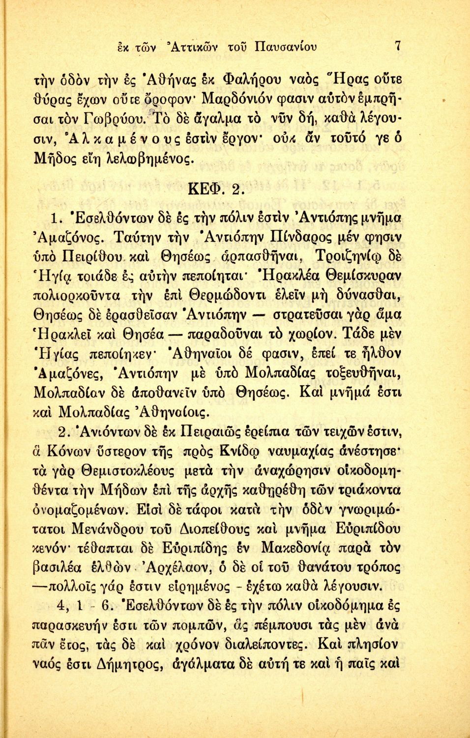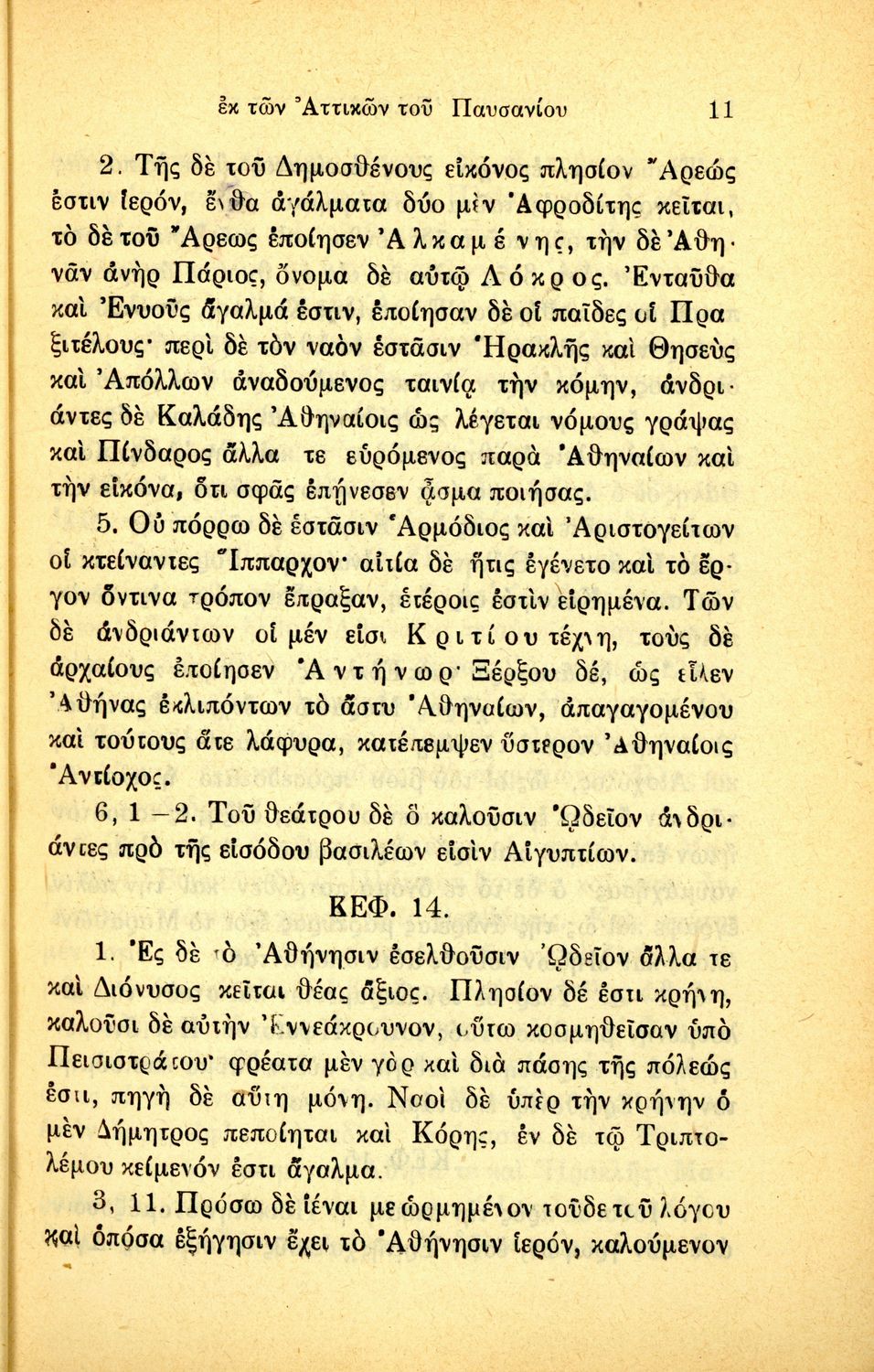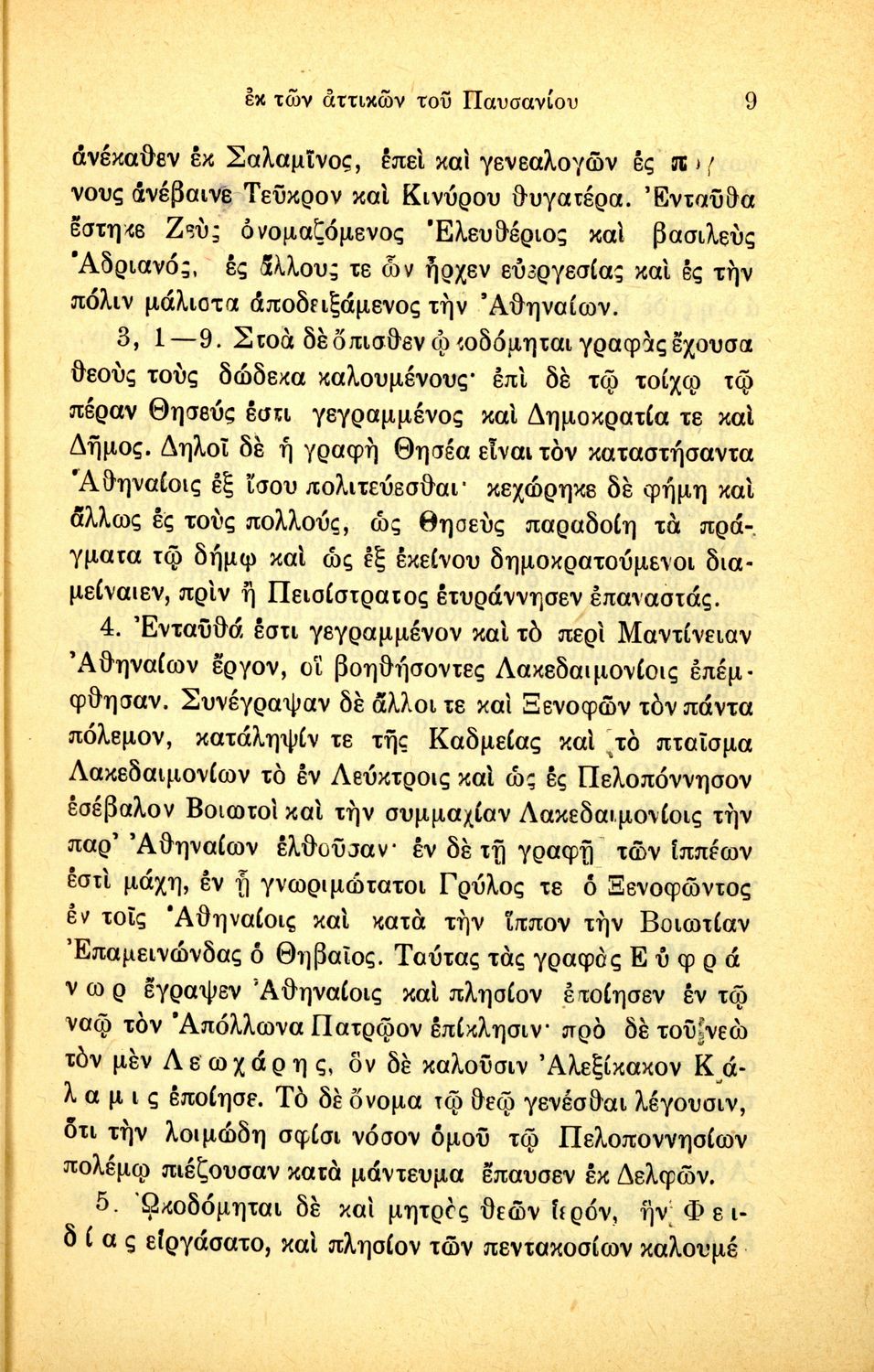 Σχολικό εγχειρίδιο Αρχαίων Ελληνικών Δ΄ Γυμνασίου που περιλαμβάνει αποσπάσματα από τα Αττικά του Παυσανία, εισαγωγή στη ζωή και το έργο του, και ερμηνευτικά και πραγματολογικά σχόλια.