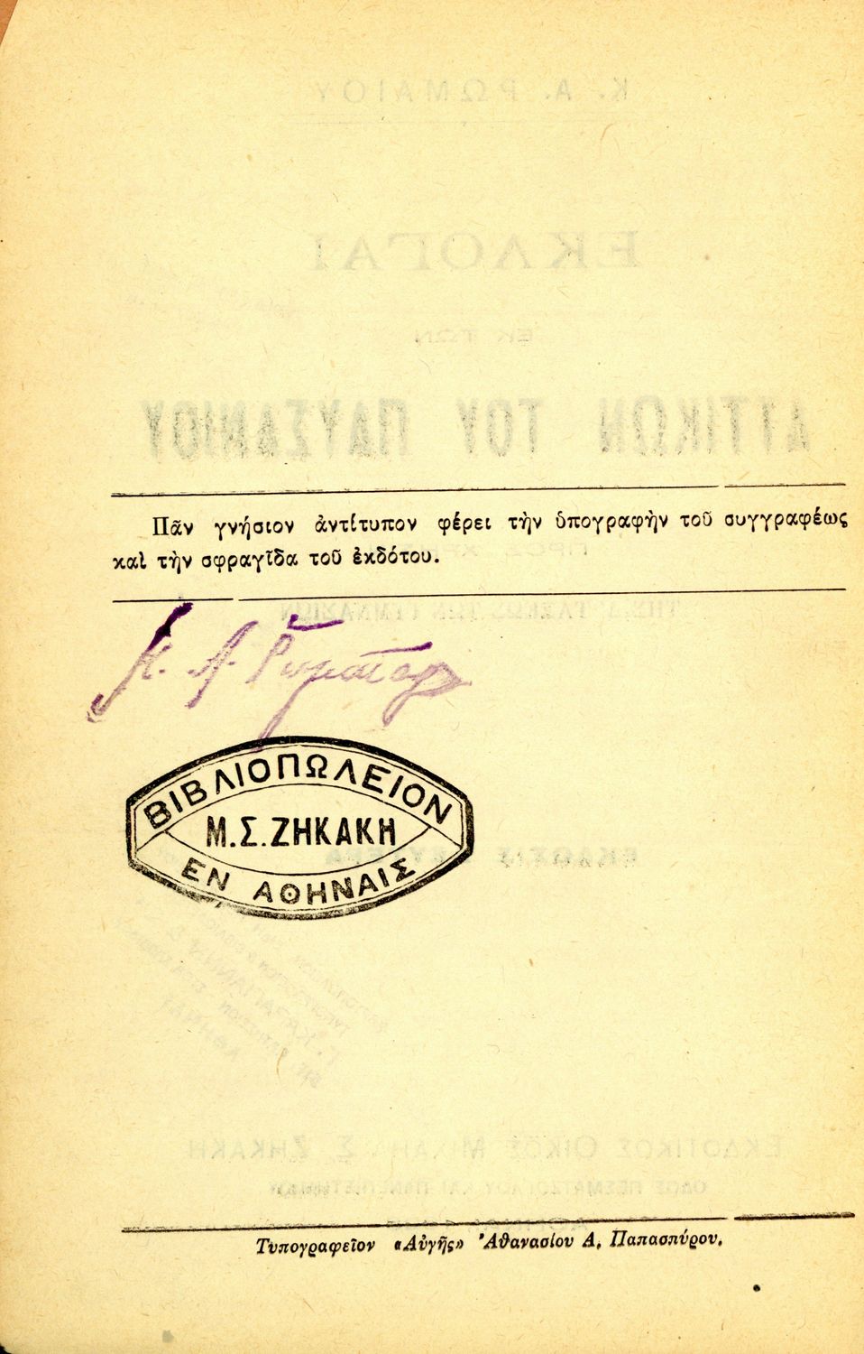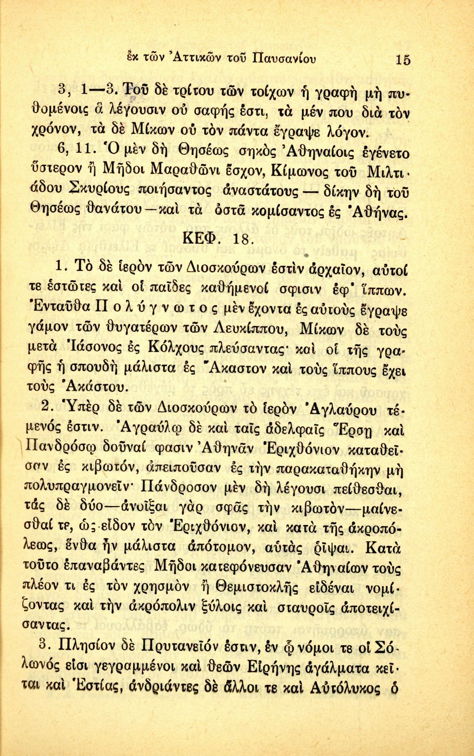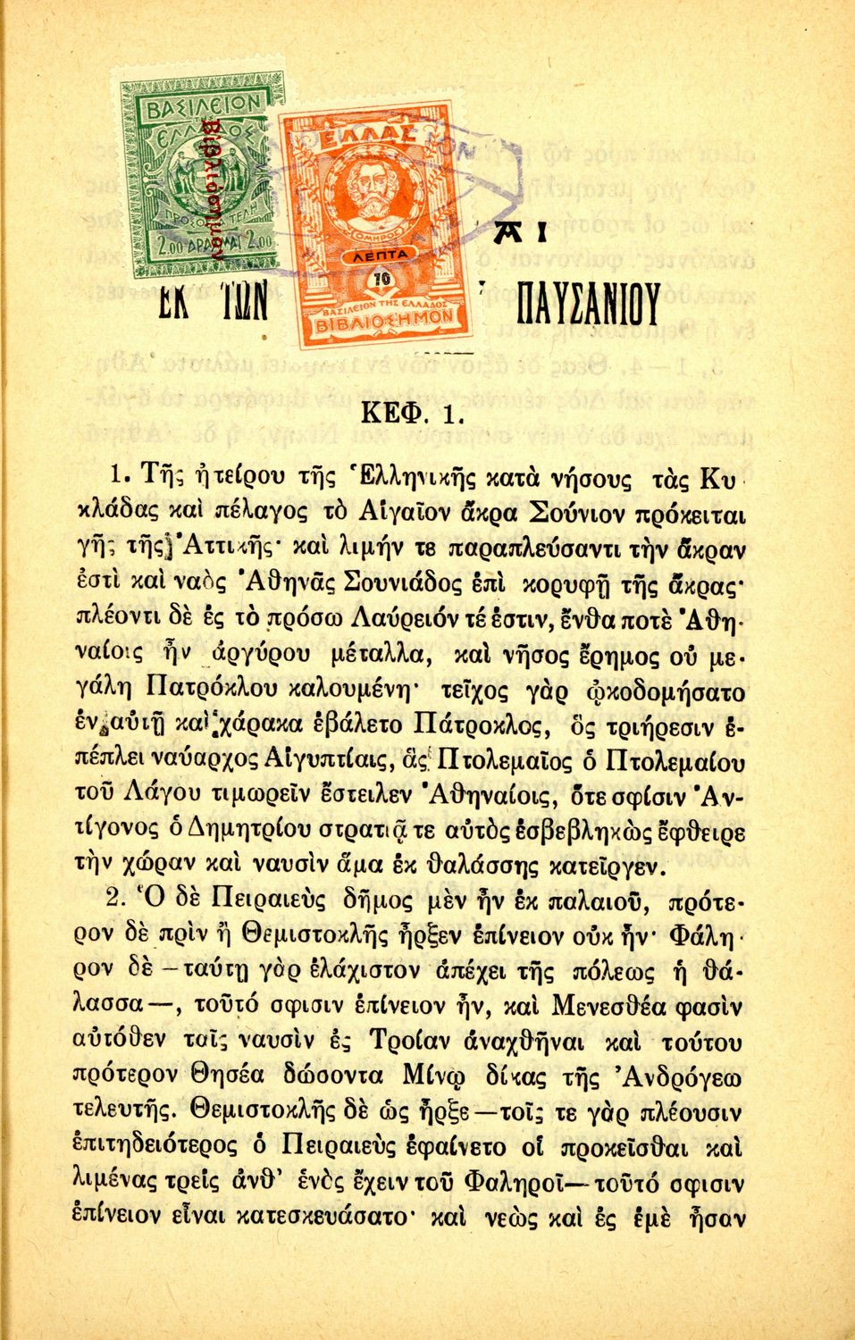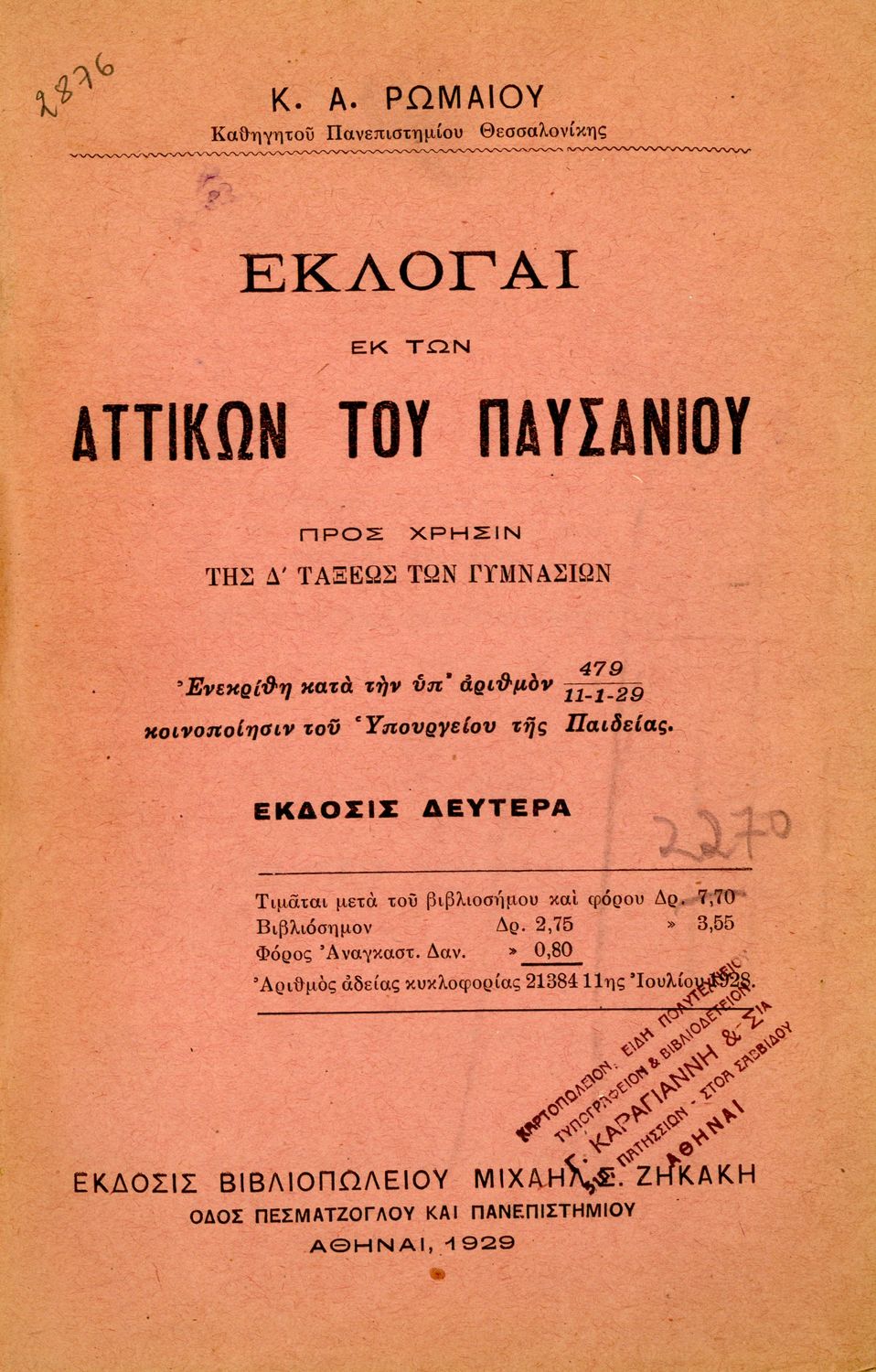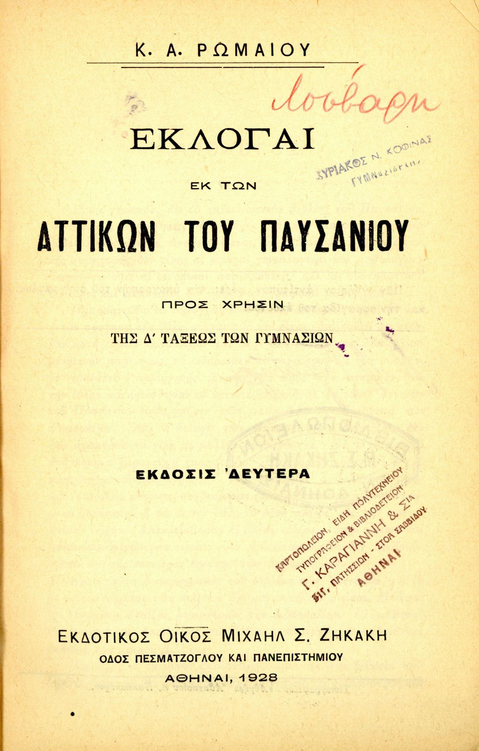 Τίτλος: Εκλογαί εκ των Αττικών του Παυσανίου προς χρήσιν της Δ΄ τάξεως των Γυμνασίων