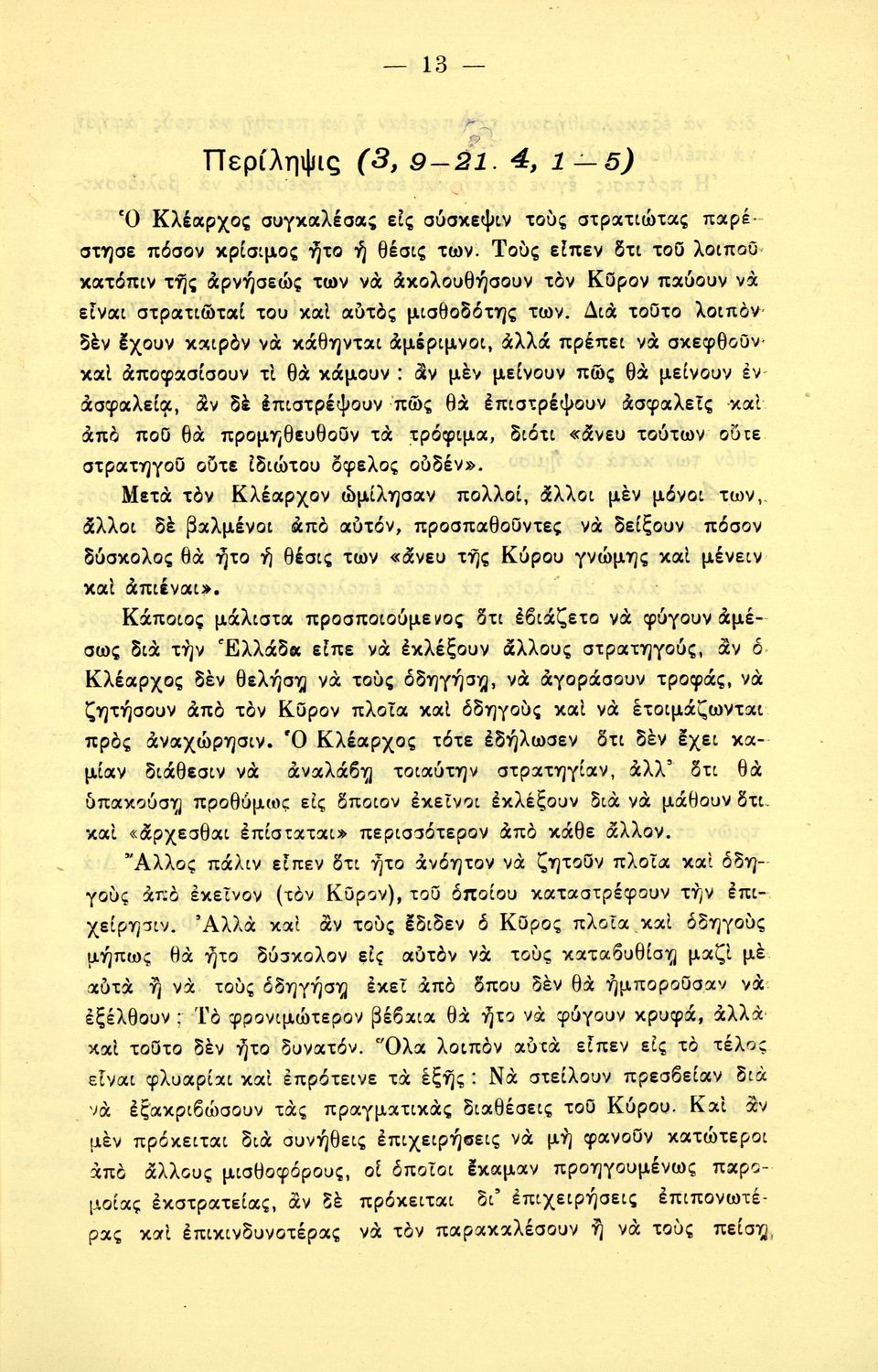 Σχολικό εγχειρίδιο Αρχαίων Ελληνικών Γ΄ Γυμνασίου που περιλαμβάνει αποσπάσματα από το έργο του Ξενοφώντα Κύρου Ανάβασις, εισαγωγικά σχόλια για τη ζωή και το έργο του, ερμηνευτικές και γραμματικές παρατηρήσεις.