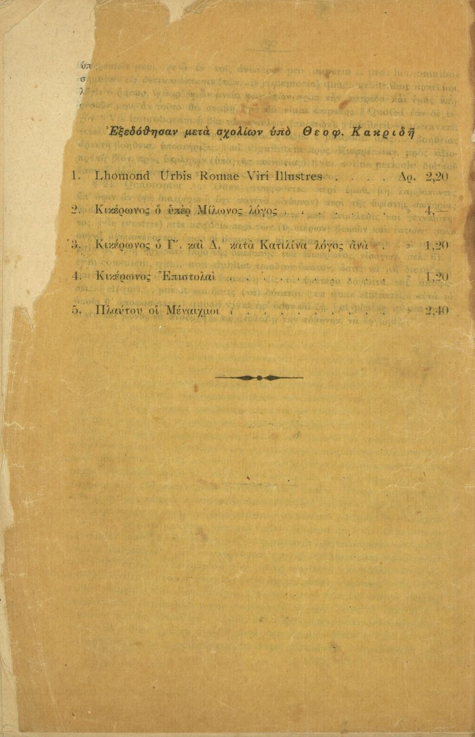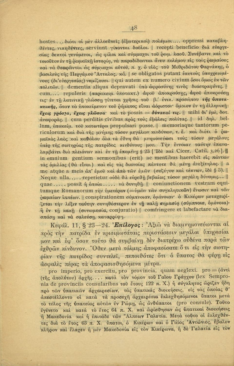Μαθητικό βοήθημα Λατινικών που περιλαμβάνει μετάφραση του Τρίτου και Τέταρτου κατά Κατιλίνα λόγων και περίληψη της υπόθεσής τους.