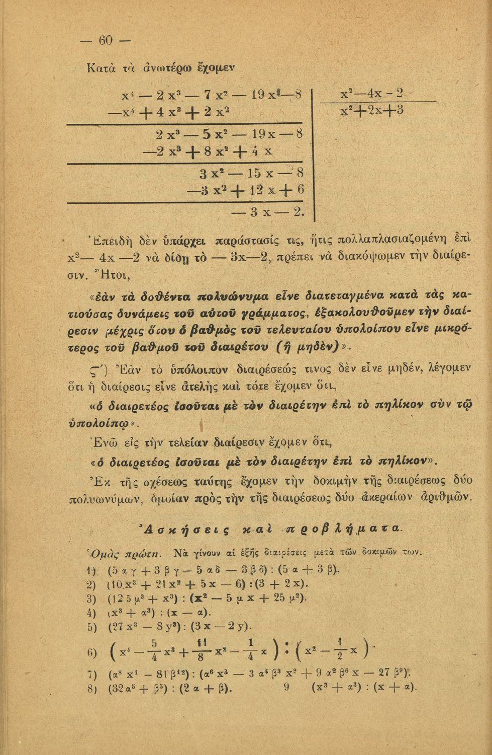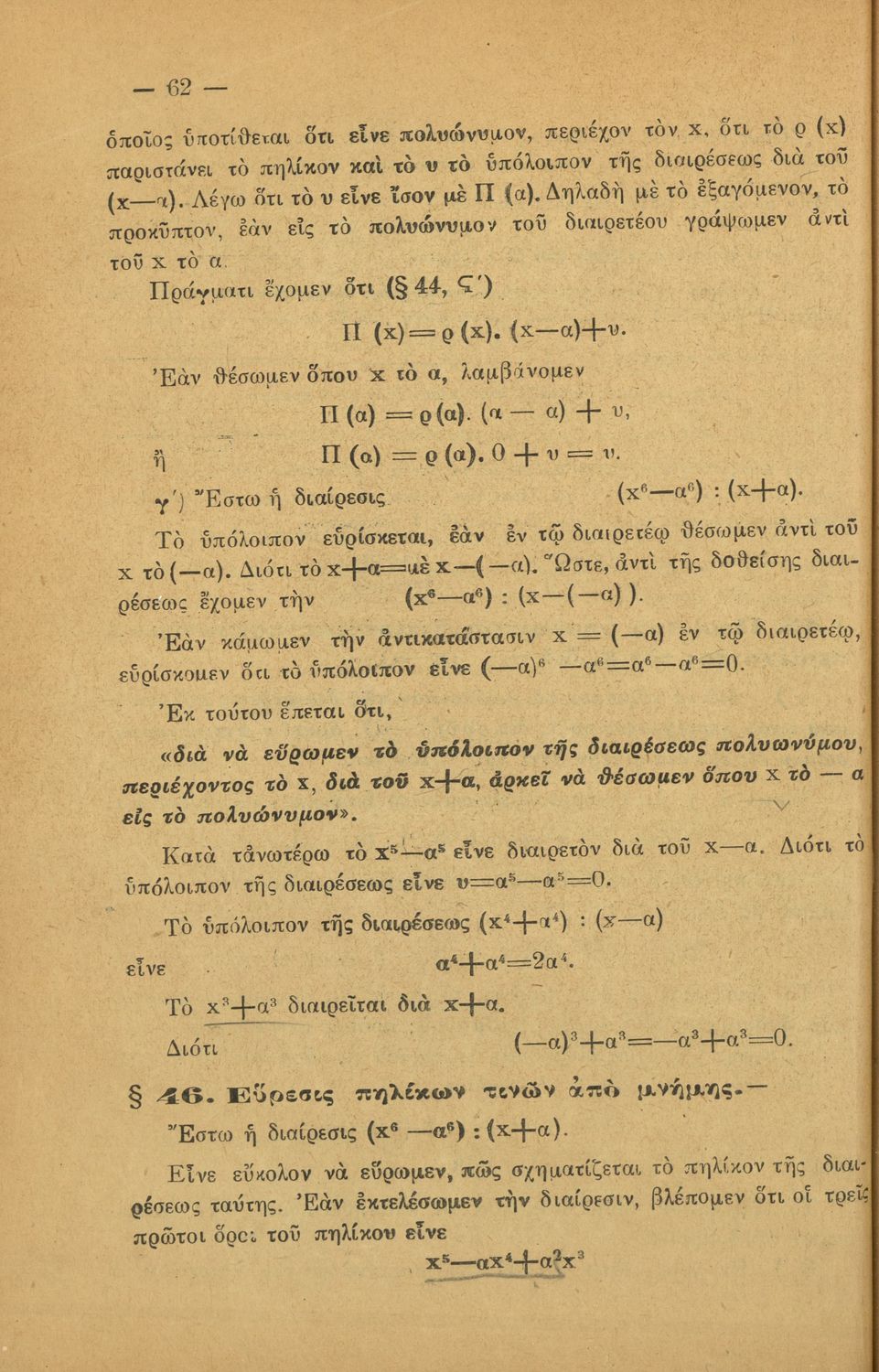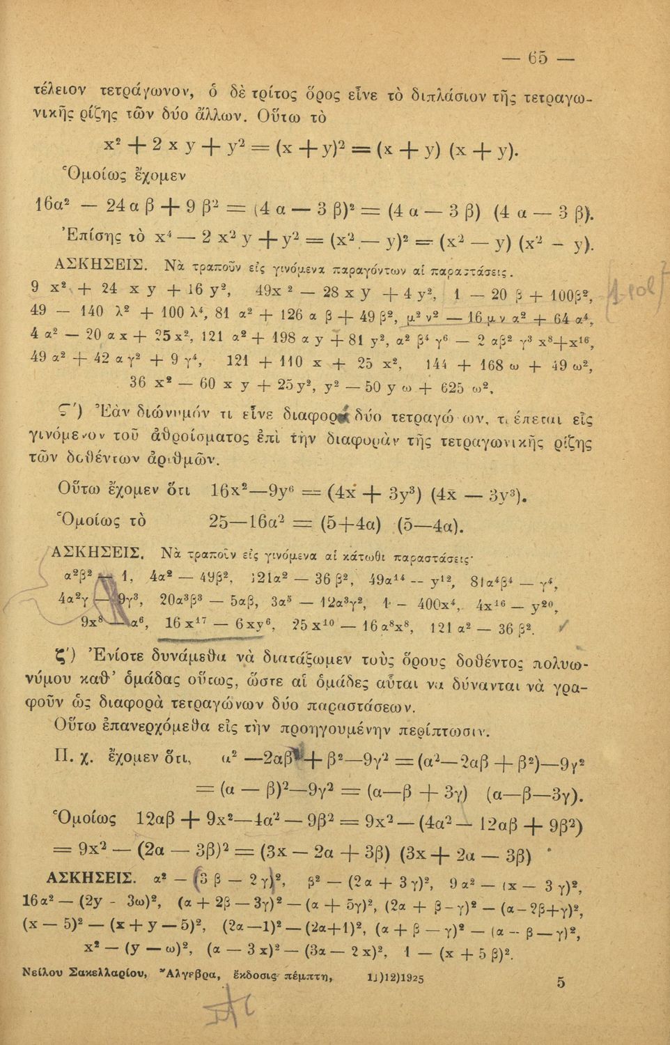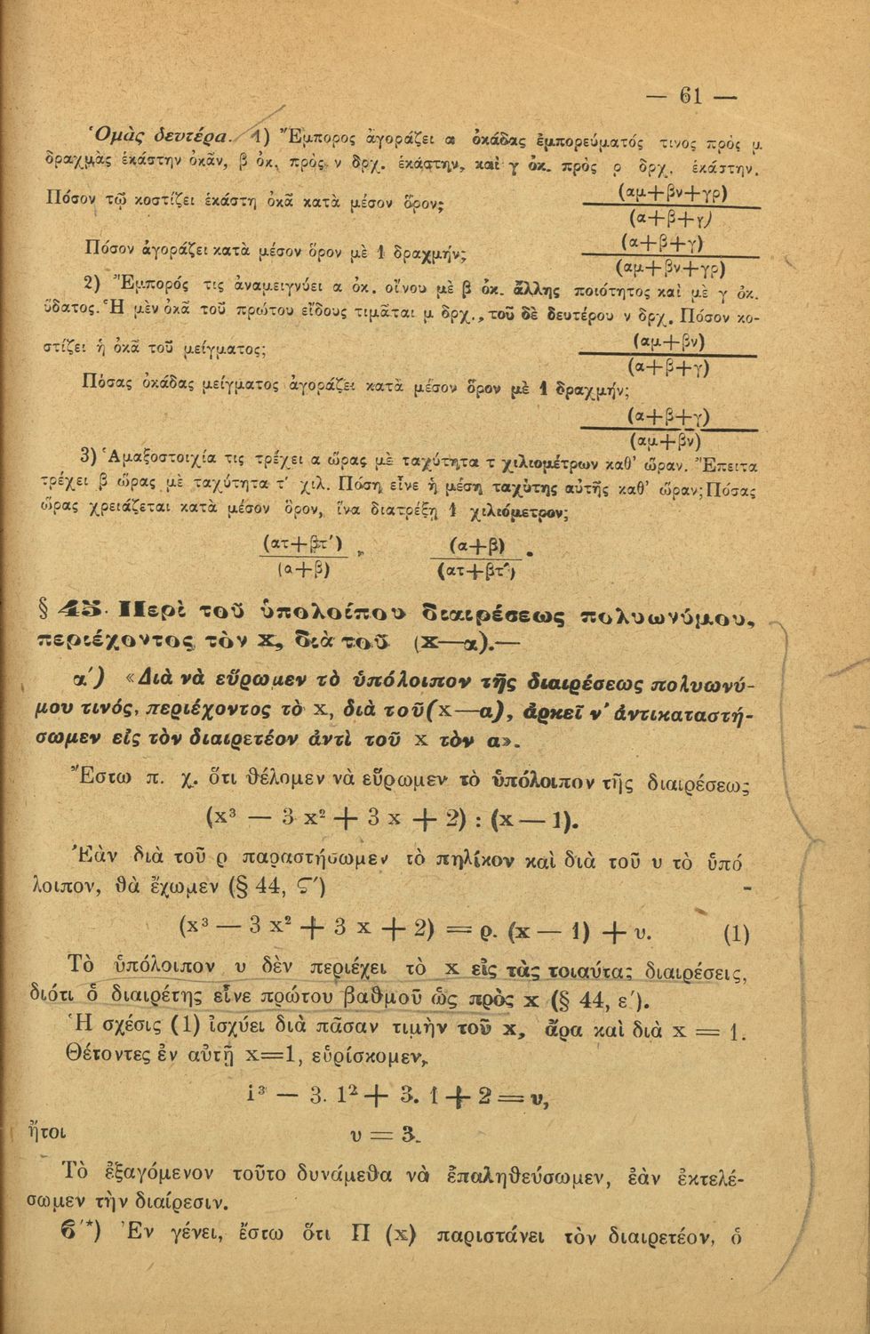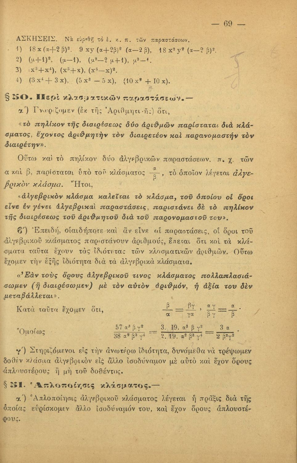 Σχολικό εγχειρίδιο Άλγεβρας για τα Γυμνάσια χωρισμένο σε θεωρία και ασκήσεις. Ο συγγραφέας ήταν καθηγητής στο Πανεπιστήμιο Αθηνών.