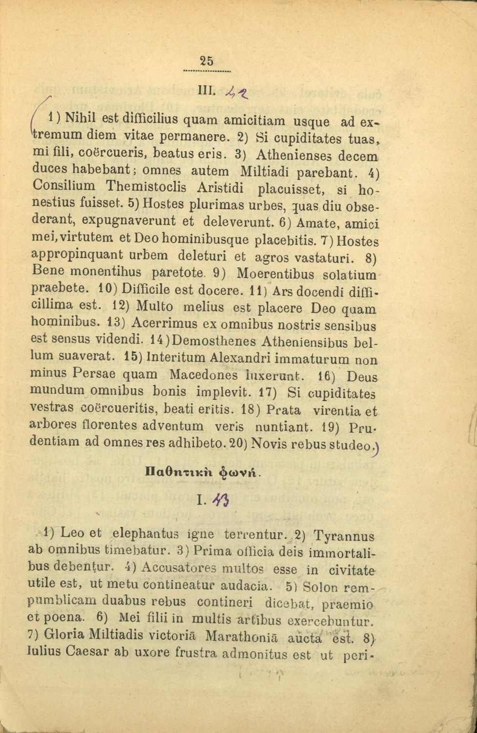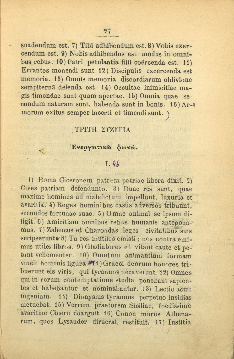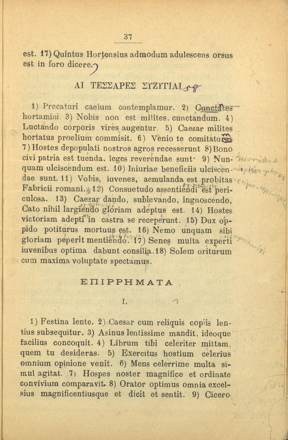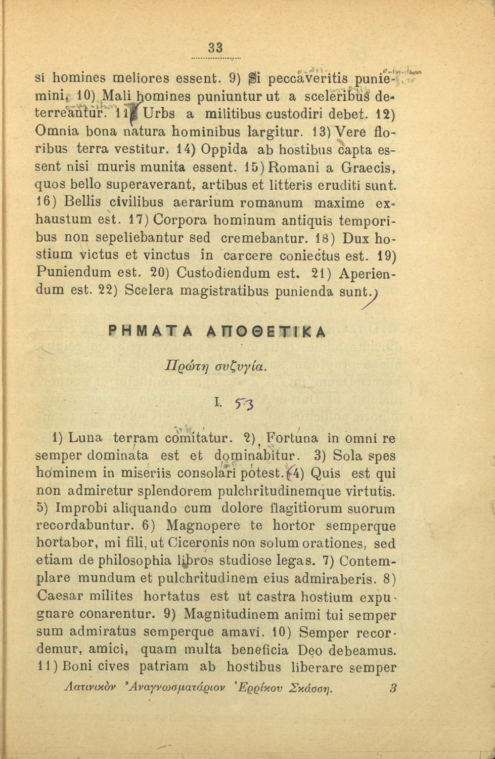 Σχολικό εγχειρίδιο Λατινικών Γ' Ελληνικού Σχολείου και Α΄ Γυμνασίου που περιλαμβάνει κείμενα για τη διδασκαλία των γραμματικών και συντακτικών φαινομένων, ερμηνευτικά και πραγματολογικά σχόλια και λεξιλόγιο.