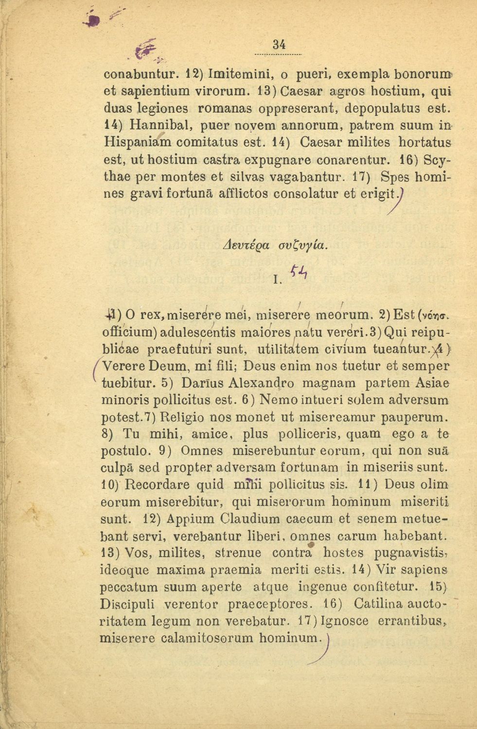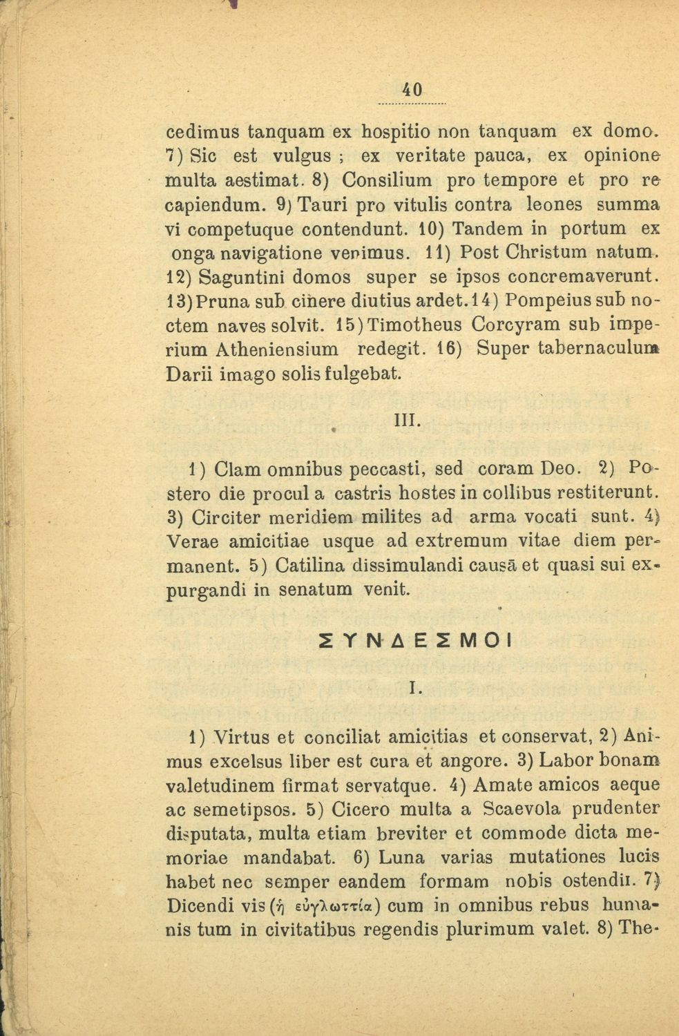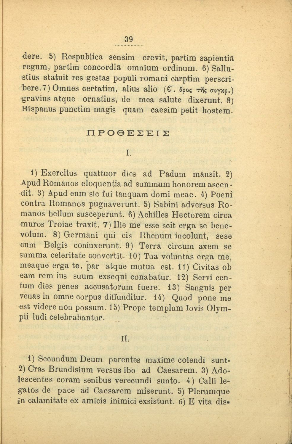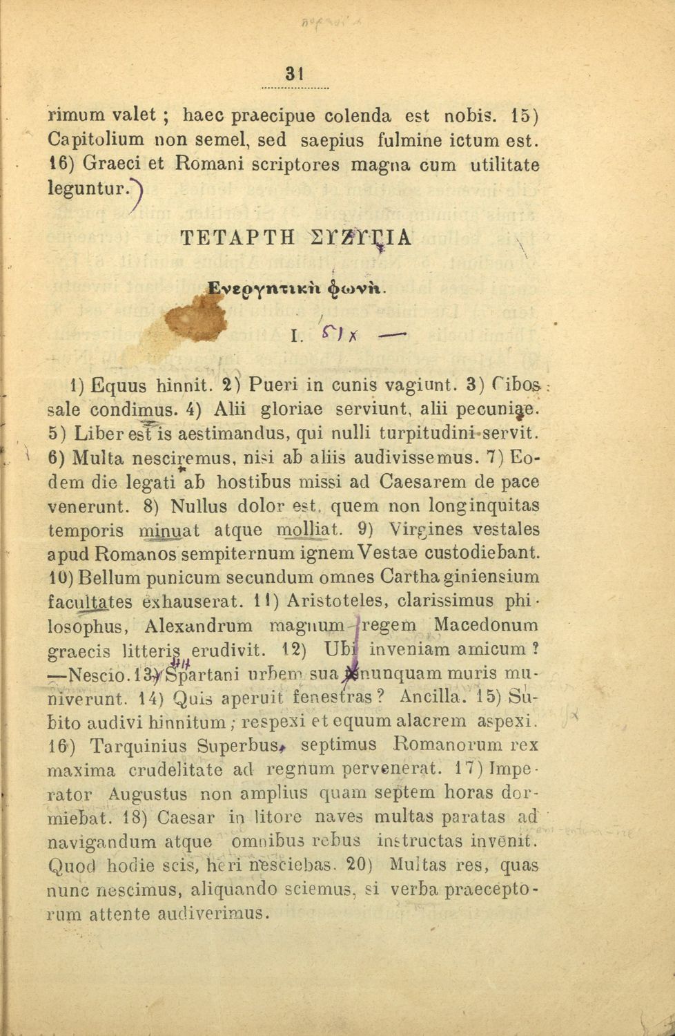 Σχολικό εγχειρίδιο Λατινικών Γ' Ελληνικού Σχολείου και Α΄ Γυμνασίου που περιλαμβάνει κείμενα για τη διδασκαλία των γραμματικών και συντακτικών φαινομένων, ερμηνευτικά και πραγματολογικά σχόλια και λεξιλόγιο.