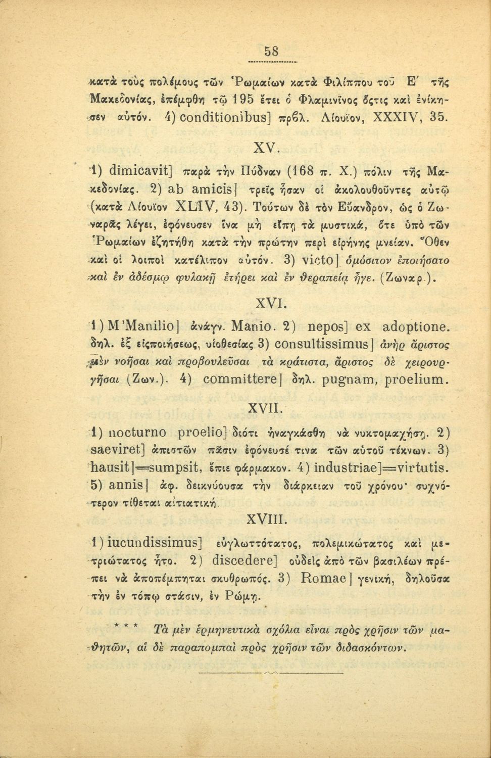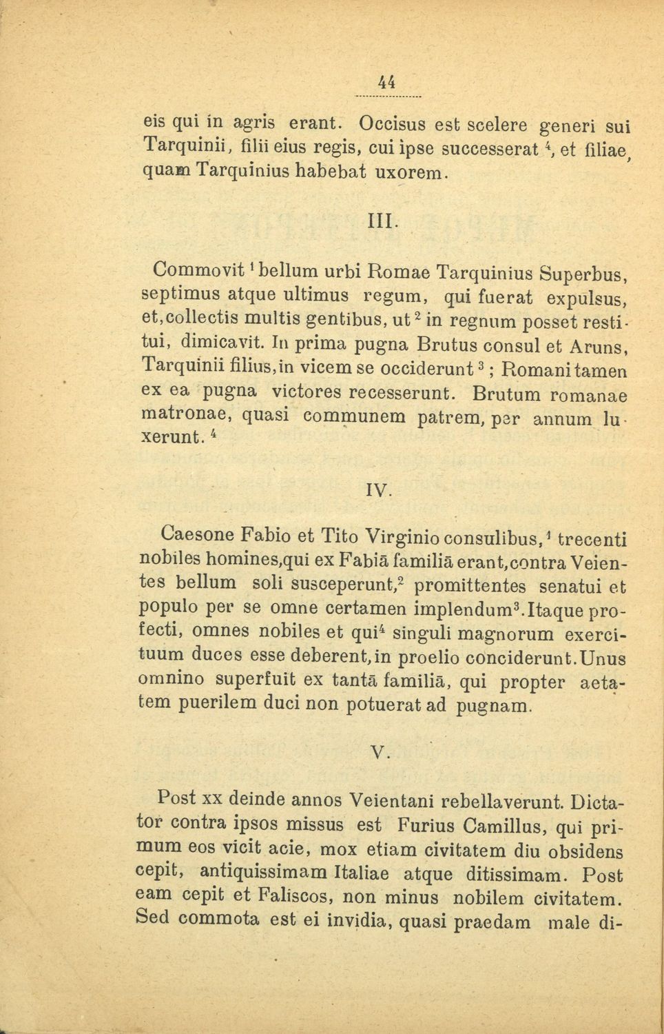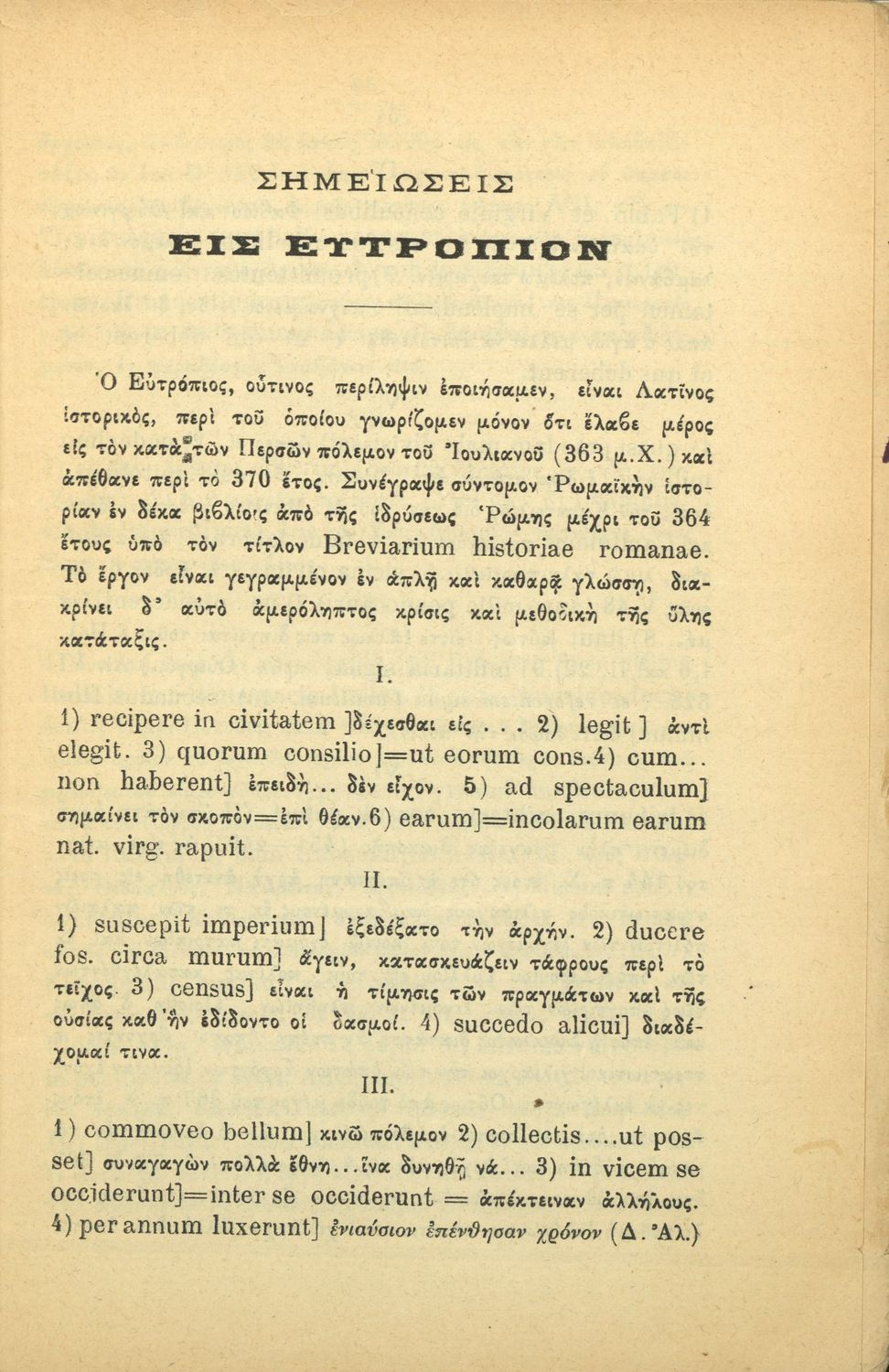 Σχολικό εγχειρίδιο Λατινικών Γ' Ελληνικού Σχολείου και Α΄ Γυμνασίου που περιλαμβάνει κείμενα για τη διδασκαλία των γραμματικών και συντακτικών φαινομένων, ερμηνευτικά και πραγματολογικά σχόλια και λεξιλόγιο.