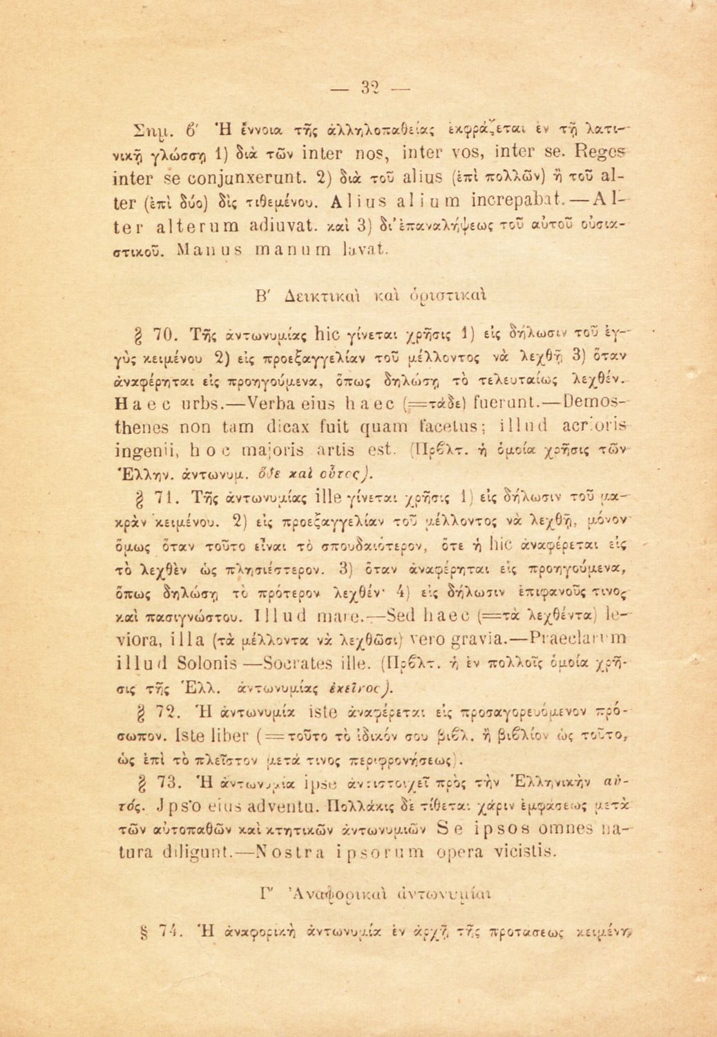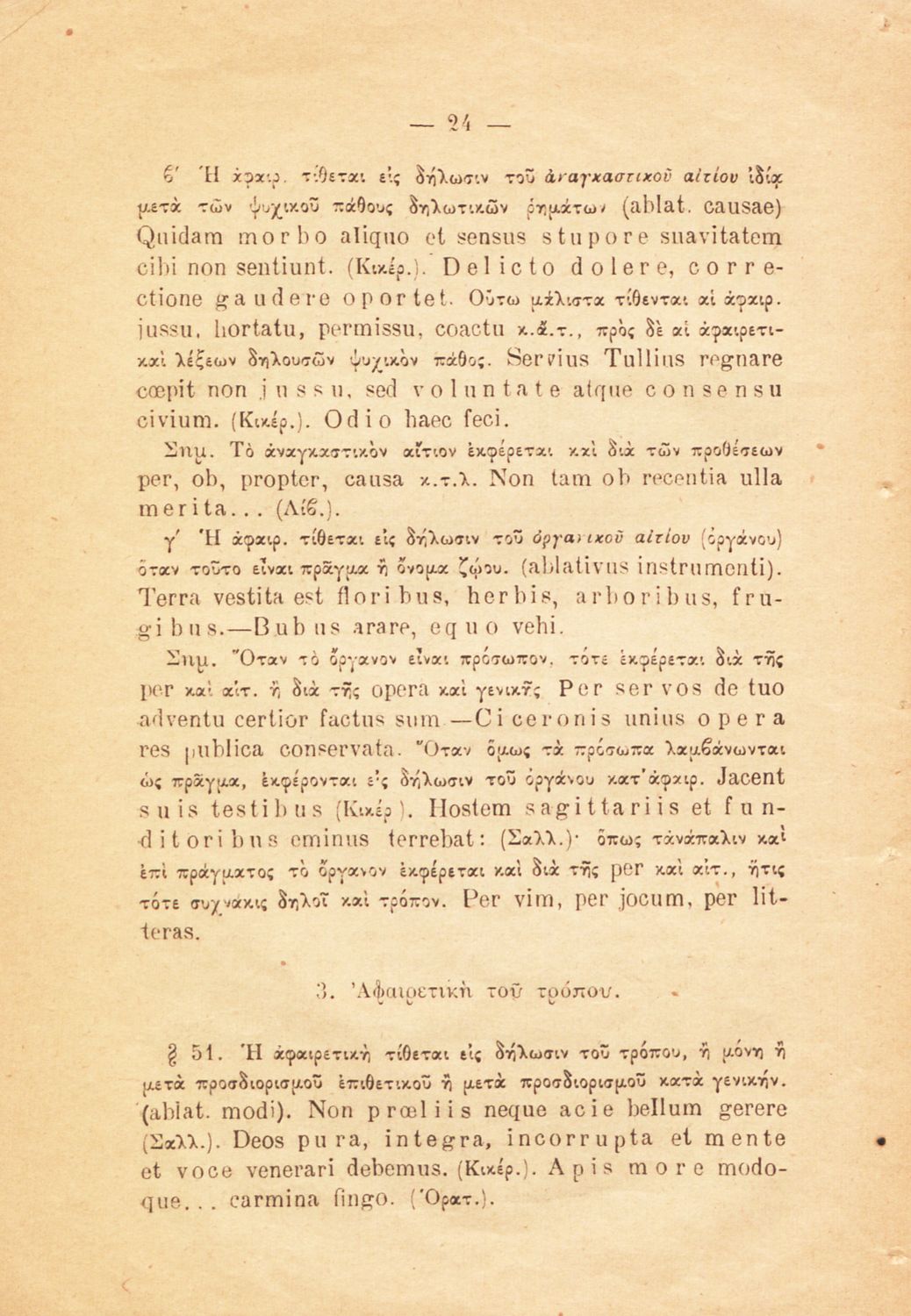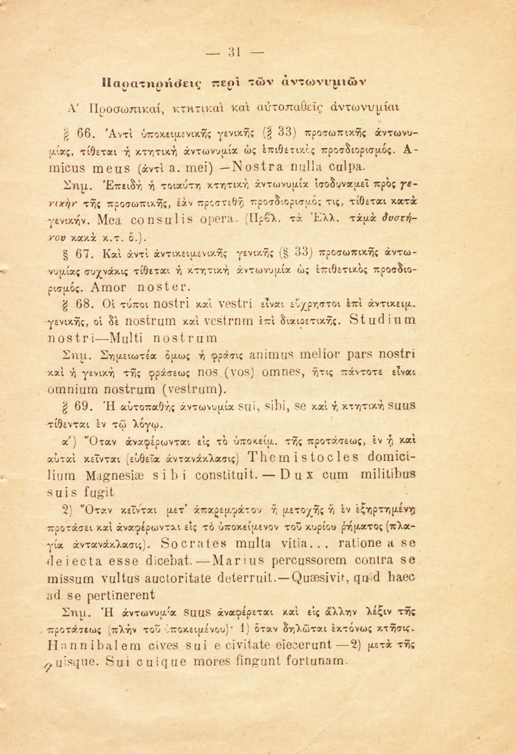 Σχολικό εγχειρίδιο Λατινικών Α΄, Β΄, Γ' Γυμνασίου που περιλαμβάνει γραμματική και συντακτικό και είναι χωρισμένο σε φθογγολογικό, τυπολογικό και ετυμολογικό μέρος.