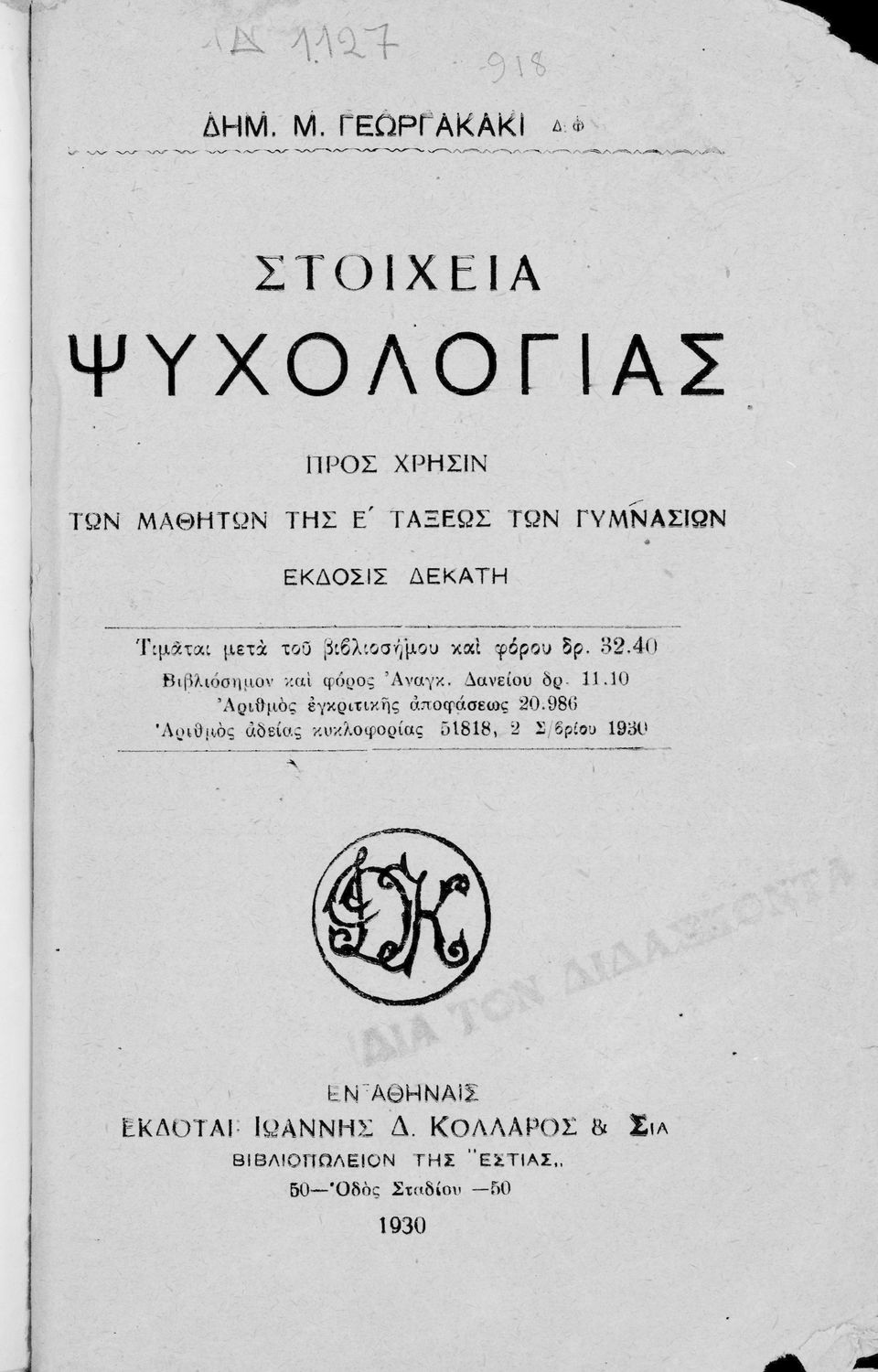 Εκδότης: Ιωάννης Δ. Κολλάρος, Βιβλιοπωλείο της "Εστίας" Έτος έκδοσης: 1930 Τόπος έκδοσης: Αθήνα Έκδοση: 10η Υπουργική απόφαση / Σύμβαση: 20986/2-9-1930 Έτος έγκρισης: 1930 |