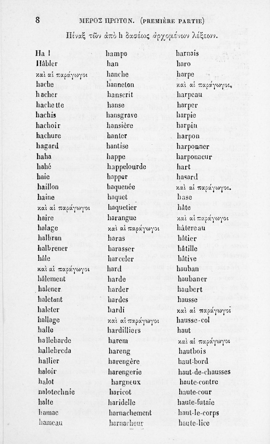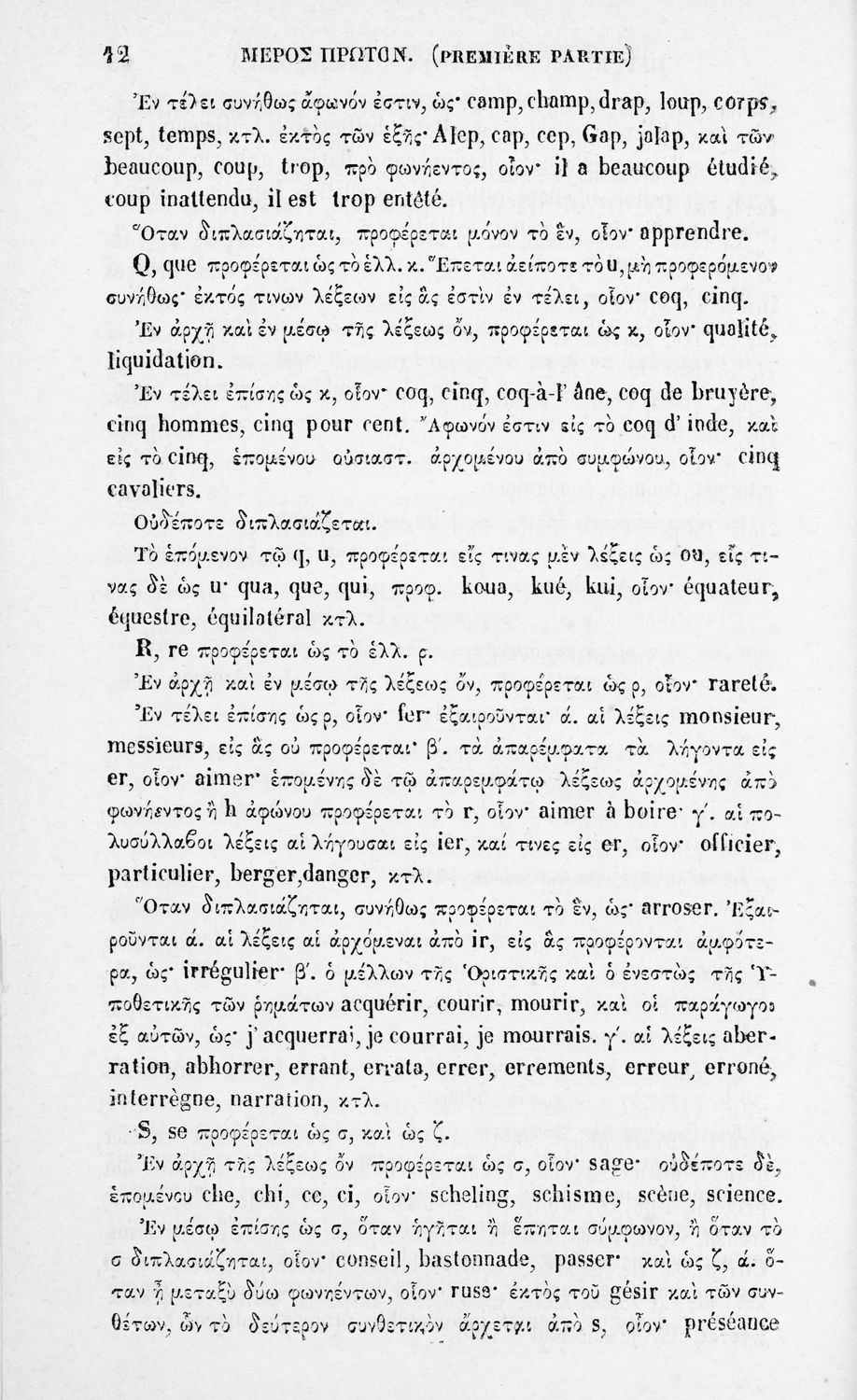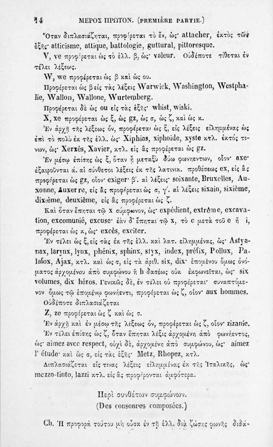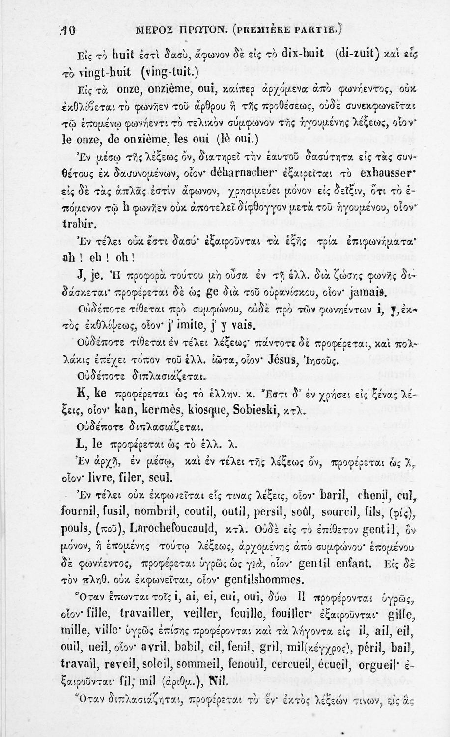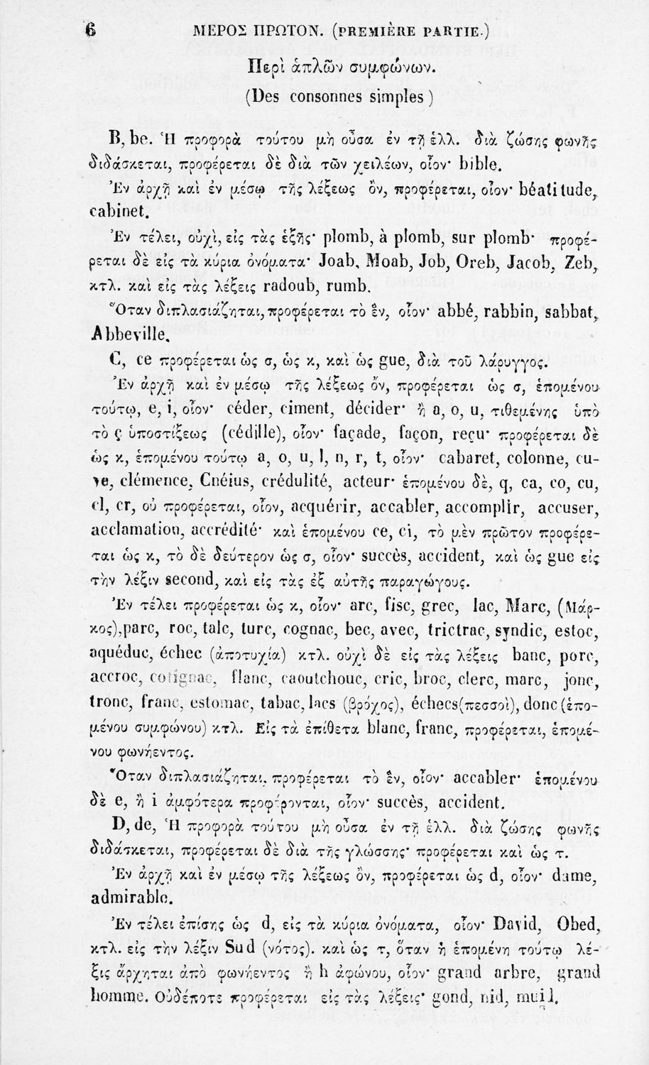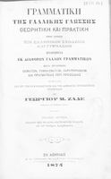 Γραμματική της Γαλλικής γλώσσας για τα Ελληνικά Σχολεία και Παρθεναγωγεία που αναλύει τα μέρη του λόγου και περιέχει παραδείγματα και ασκήσεις.