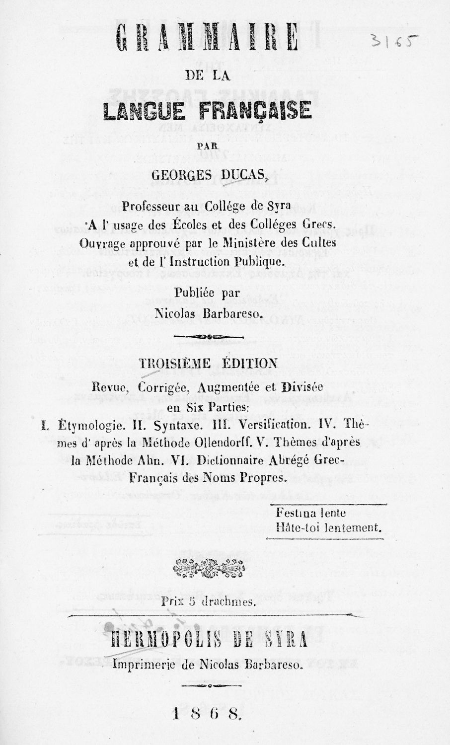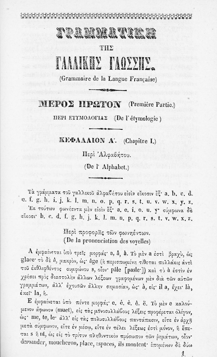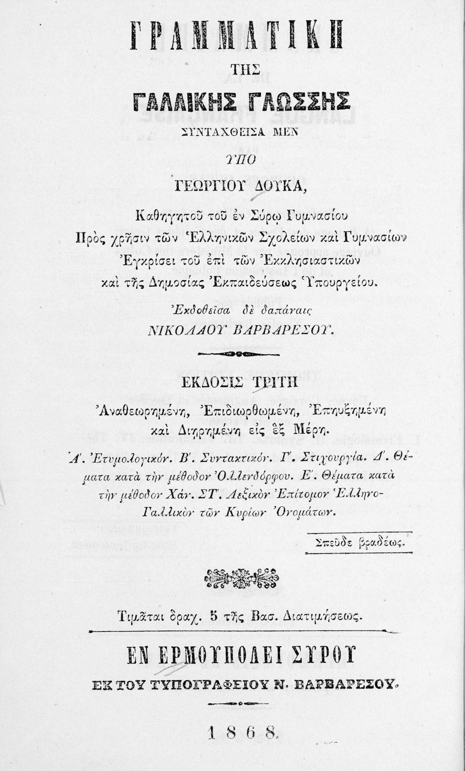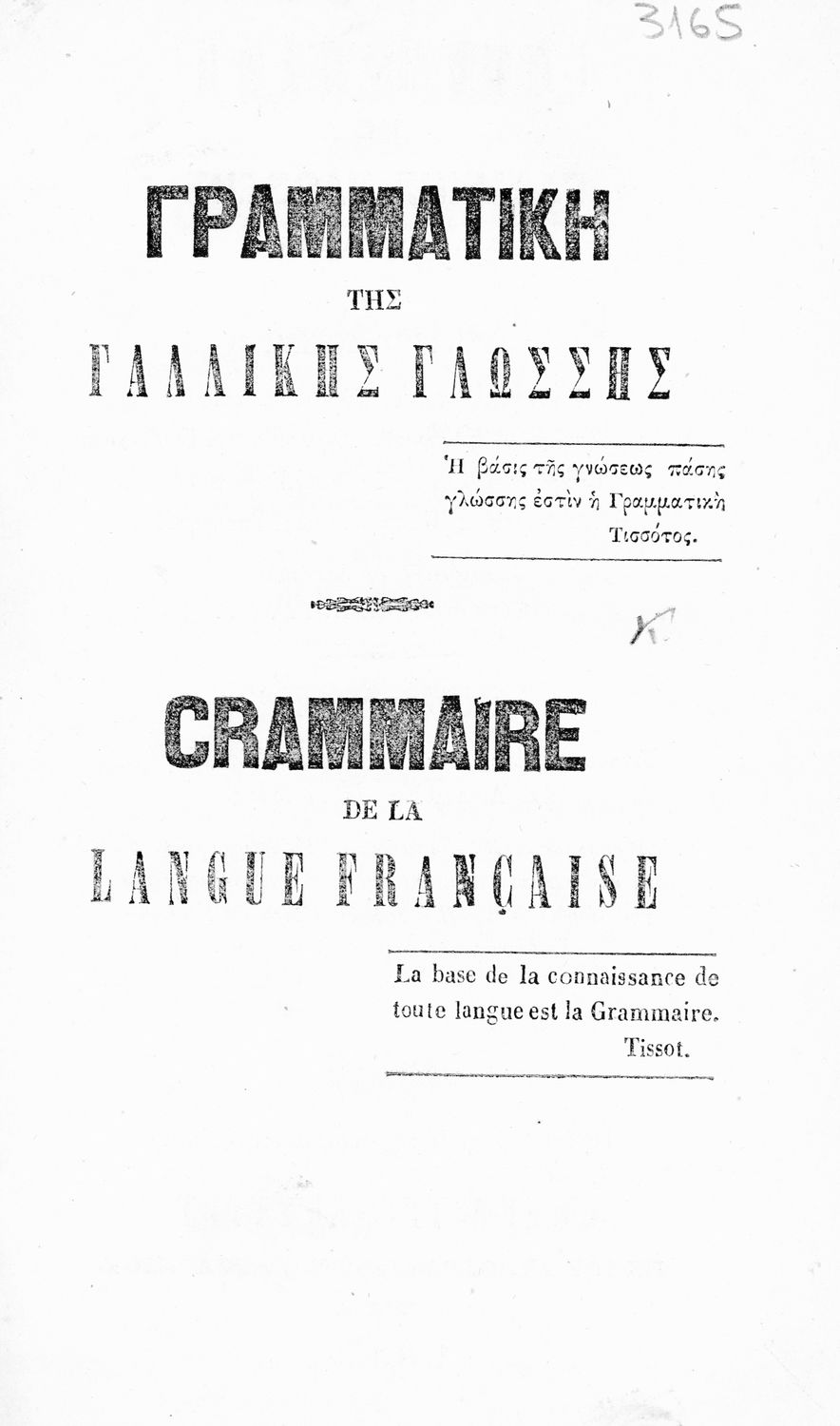 Τίτλος: Γραμματική της γαλλικής γλώσσης προς χρήσιν των Ελληνικών Σχολείων και Γυμνασίων