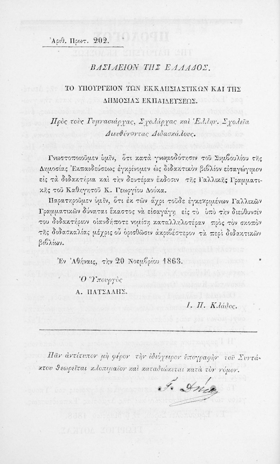 Σχολικό εγχειρίδιο Αρχαίων Ελληνικών για τα Ελληνικά Σχολεία, Παρθεναγωγεία και Γυμνάσια που περιέχει τους κανόνες γραμματικής και είναι χωρισμένο σε φθογγολογικό, τυπολογικό και ετυμολογικό μέρος.