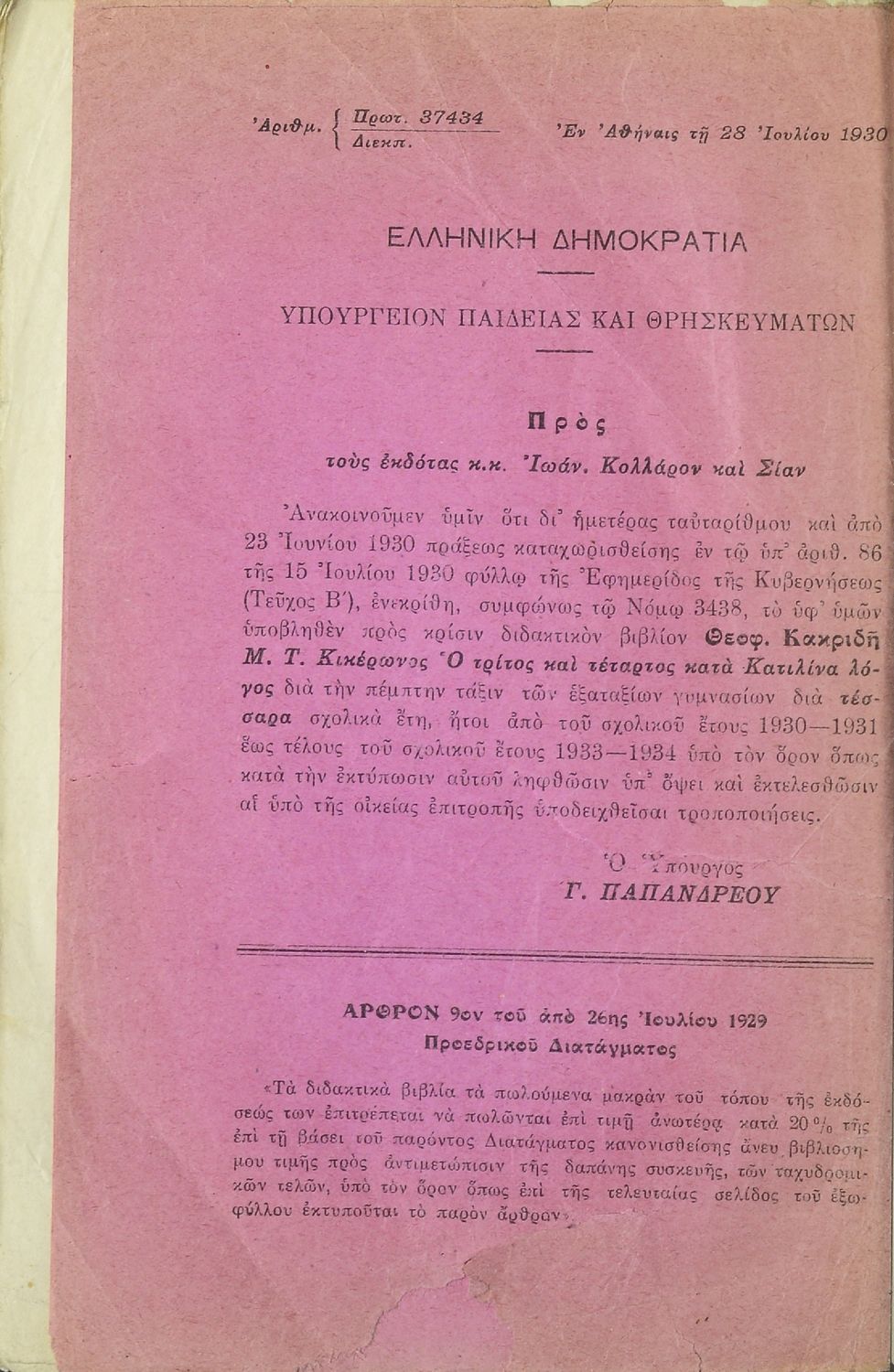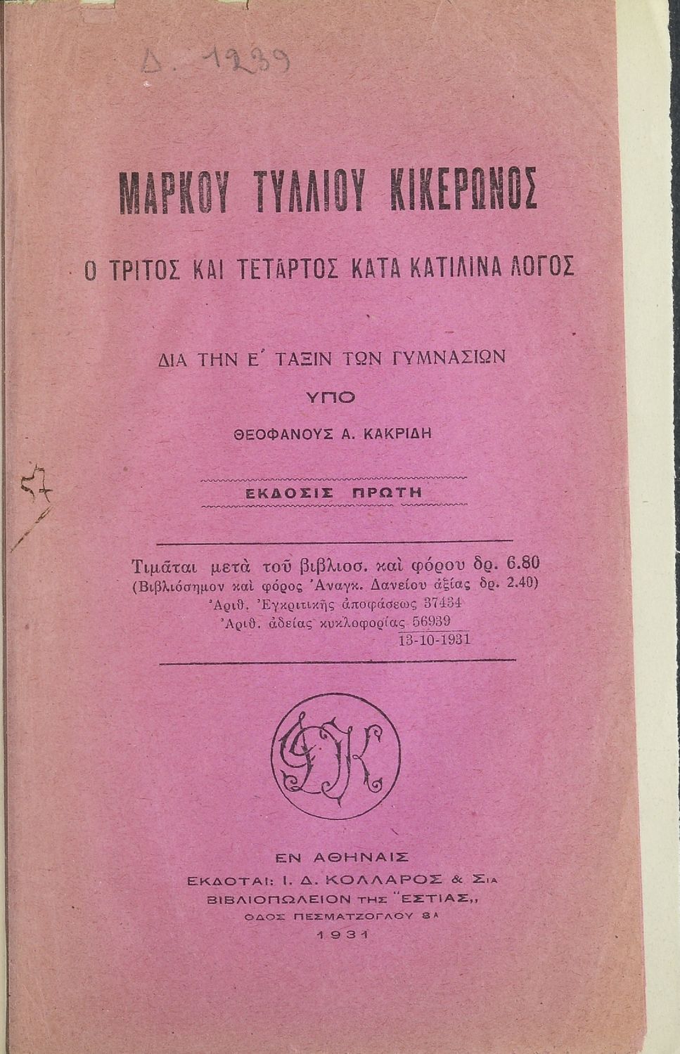 Σχολικό εγχειρίδιο Λατινικών για την Ε΄ Εξαταξίου Γυμνασίου που περιλαμβάνει τον Τρίτο και Τέταρτο Λόγο κατά Κατιλίνα