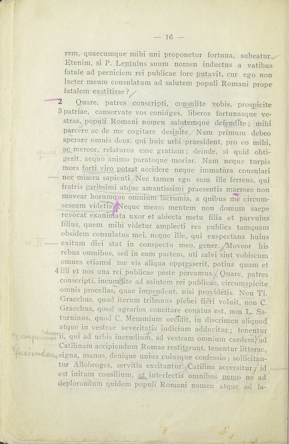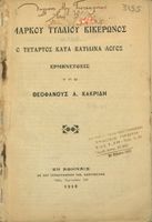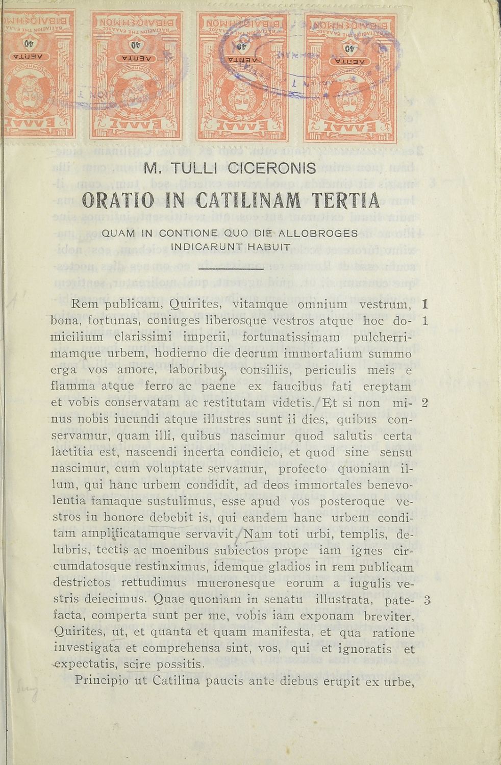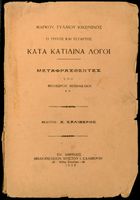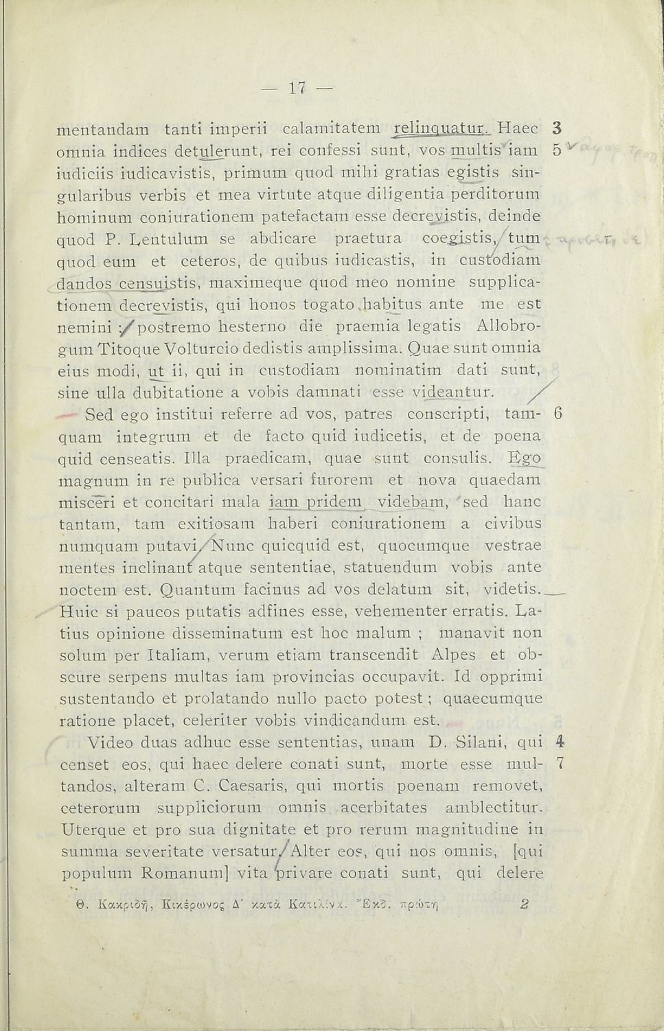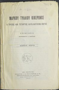 Μαθητικό βοήθημα Λατινικών που περιλαμβάνει μετάφραση του Τρίτου και Τέταρτου κατά Κατιλίνα λόγων και περίληψη της υπόθεσής τους.