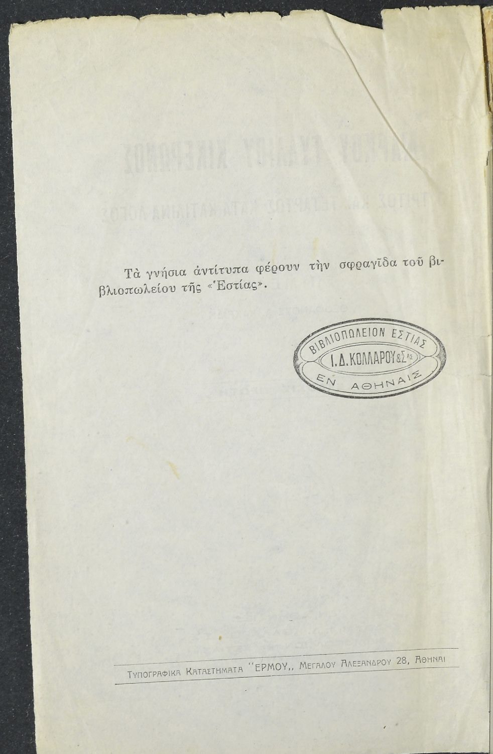 Εκδότης: Ιωάννης Δ. Κολλάρος, Βιβλιοπωλείο της "Εστίας"