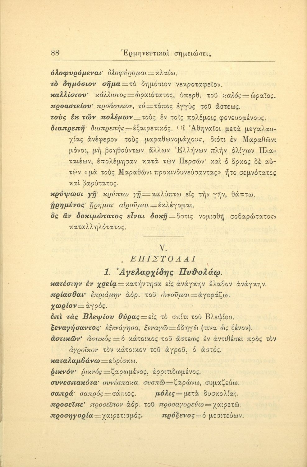 Σχολικό εγχειρίδιο Αρχαίων Ελληνικών για τις Ε΄ Δημοτικού και Α' Ελληνικού Σχολείου που περιλαμβάνει σύντομα διηγήματα εμπνευσμένα από τους μύθους του Αισώπου, περιγραφές ελληνικών πόλεων, επιστολές και ...