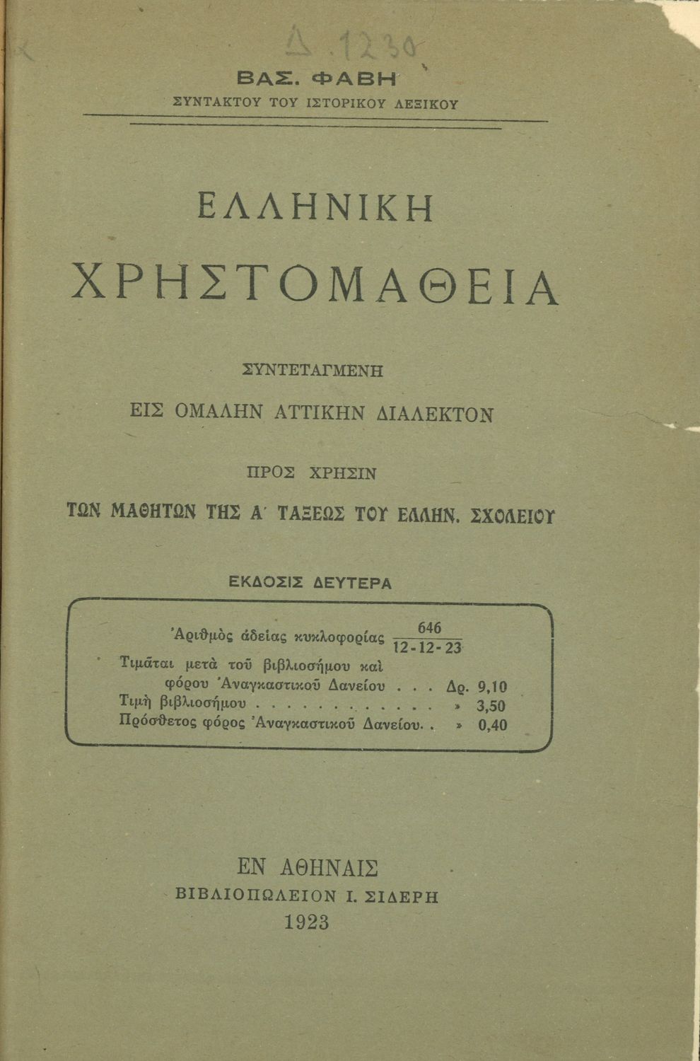 Τίτλος: Ελληνική χρηστομάθεια συντεταγμένη εις ομαλήν αττικήν διάλεκτον προς χρήσιν των μαθητών της Α΄ τάξεως του Ελληνικού Σχολείου