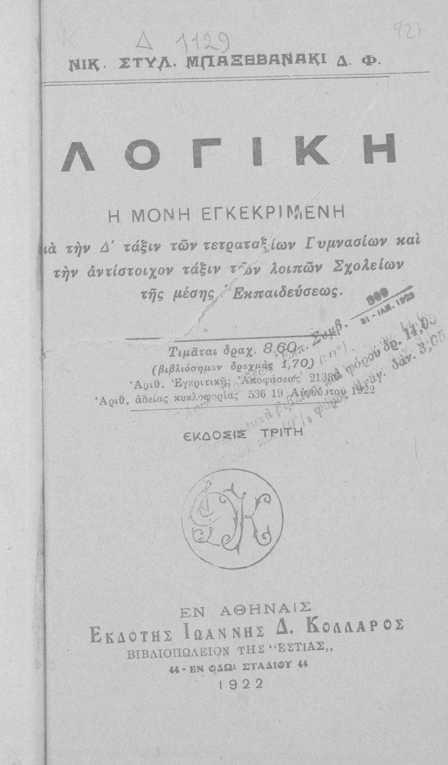Κωδικός αναγνώρισης: 20-03170 Τίτλος: Λογική η μόνη εγκεκριμένη διά την Δ΄ τάξιν των Τετραταξίων Γυμνασίων και την αντίστοιχον τάξιν των λοιπών σχολείων της Μέσης Εκπαιδεύσεως Συγγραφέας: Νικ. Στυλ. Μπαξεβανάκις Μέγεθος και υπόστρωμα: Σχολικό εγχειρίδιο, 19εκ., μαλακό εξώφυλλο, 174 σελίδες. |