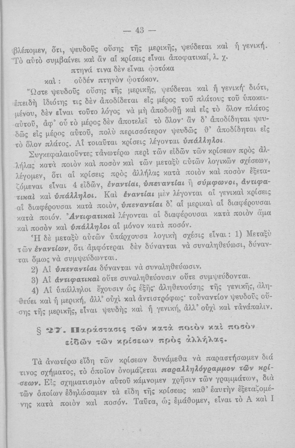 Βαθμίδα εκπαίδευσης: Δευτεροβάθμια Τάξη: Δ' Γυμνασίου Μάθημα: Λογική Γλώσσα: Καθαρεύουσα Παρουσίαση περιεχομένου: Σχολικό εγχειρίδιο Λογικής Δ΄ Τετραταξίου Γυμνασίου που είναι χωρισμένο σε καθαρή λογική και μεθοδολογία των φυσικών επιστημών. Περιέχει και ασκήσεις λογικής. |