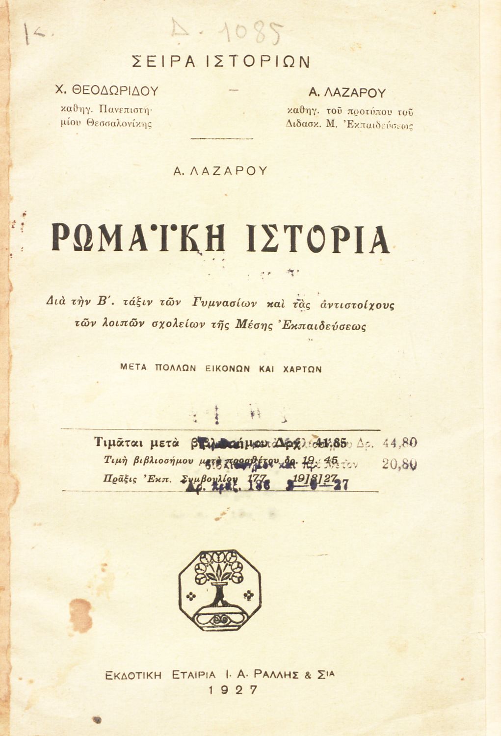 Τίτλος: Ρωμαϊκή ιστορία διά την Β΄ τάξιν των Γυμνασίων και τας αντιστοίχους των λοιπών σχολείων της Μέσης Εκπαιδεύσεως