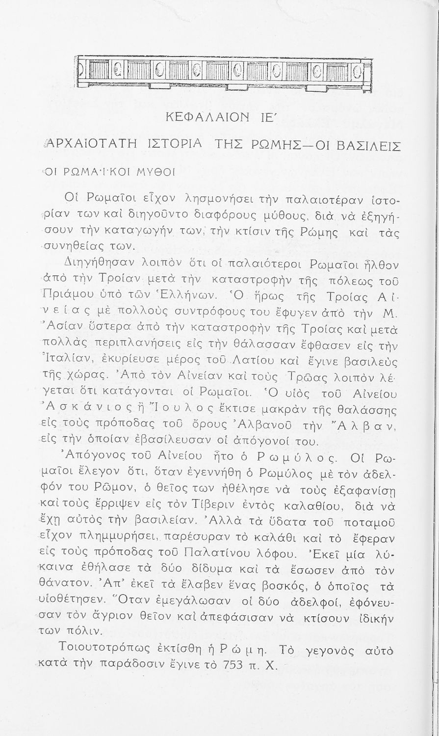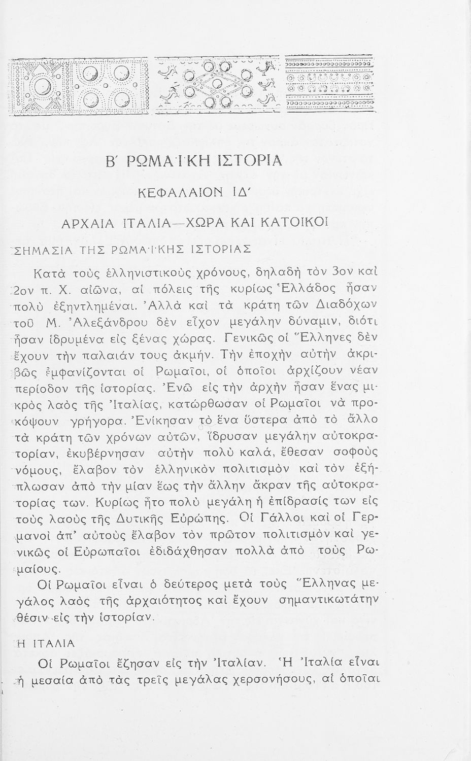 Κωδικός αναγνώρισης: 20-03273 Τίτλος: Ιστορία Ελληνική και Ρωμαϊκή εγκεκριμένη διά μίαν πενταετίαν 1932-1937, Β΄ Γυμνασίου Συγγραφέας: Χ. Θεοδωρίδης, Α. Λαζάρου Μέγεθος και υπόστρωμα: Σχολικό εγχειρίδιο, 21εκ., μαλακό εξώφυλλο, 262 σελίδες. Σκίτσα (ασπρόμαυρα). |