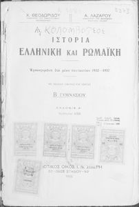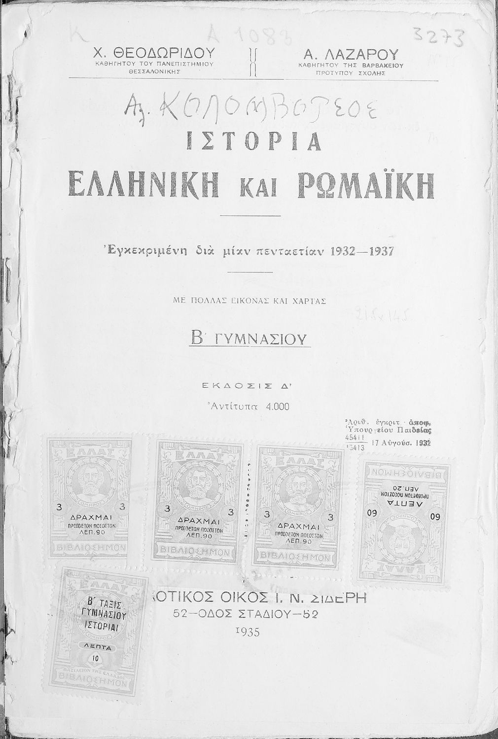 Τίτλος: Ιστορία Ελληνική και Ρωμαϊκή εγκεκριμένη διά μίαν πενταετίαν 1932-1937, Β΄ Γυμνασίου