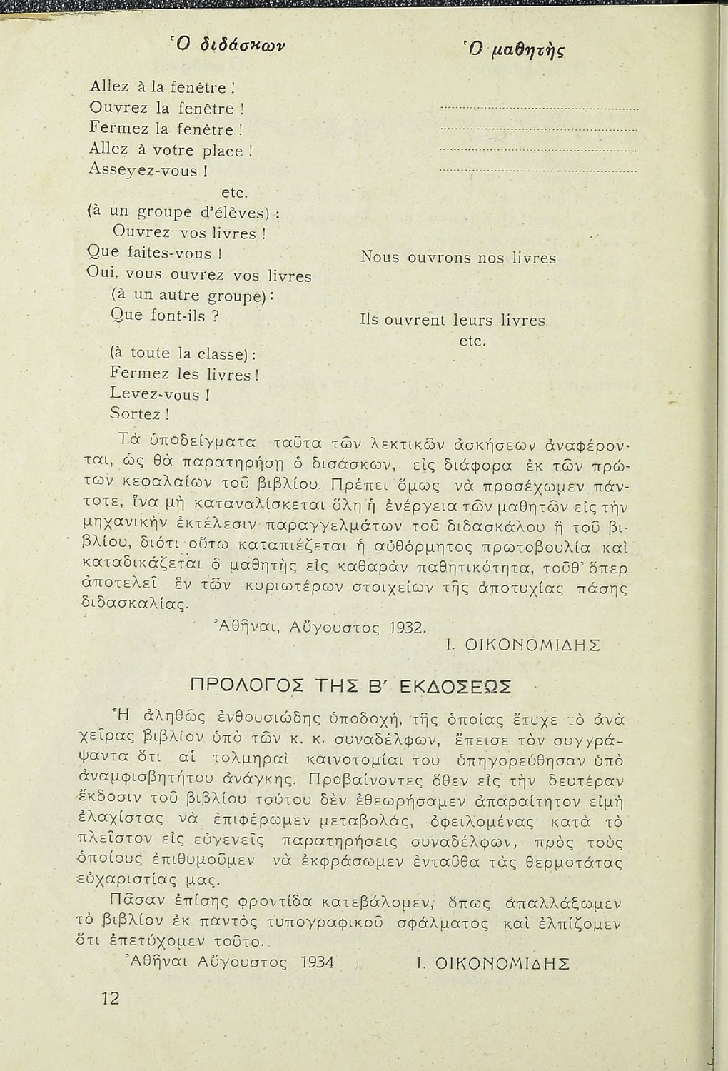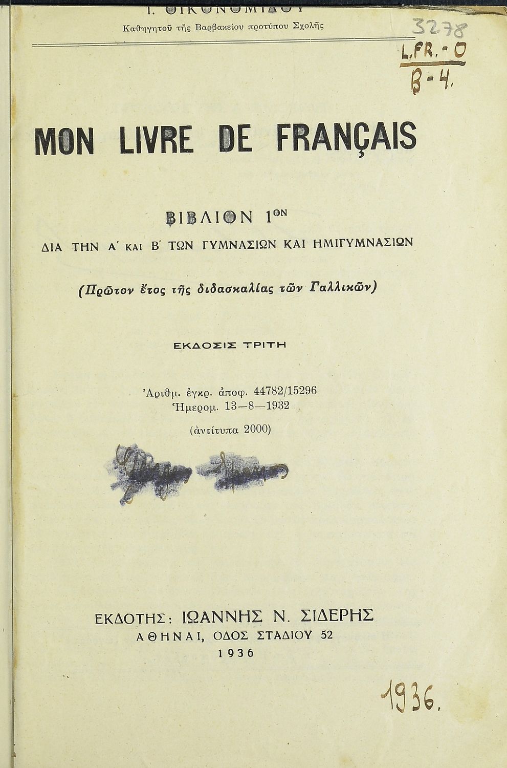 Κωδικός αναγνώρισης: 20-03278 Τίτλος: Mon livre de francais βιβλίον 1ον διά την Α΄ και Β΄ των Γυμνασίων και Ημιγυμνασίων (πρώτον έτος της διδασκαλίας των Γαλλικών) Συγγραφέας: Ι. Οικονομίδης Εικονογράφος: Σπ. Βυτωρόπουλος Μέγεθος και υπόστρωμα: Σχολικό εγχειρίδιο, 19εκ., μαλακό εξώφυλλο, 88 σελίδες. Σκίτσα (ασπρόμαυρα). |