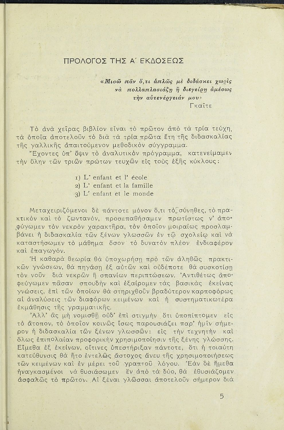 Βαθμίδα εκπαίδευσης: Δευτεροβάθμια Τάξη: Α' Γυμνασίου / Β' Γυμνασίου Μάθημα: Γαλλικά Γλώσσα: Καθαρεύουσα Παρουσίαση περιεχομένου: Σχολικό εγχειρίδιο Γαλλικών για τις Α΄ και Β΄ Γυμνασίου που περιλαμβάνει 26 κείμενα προσαρμοσμένα στη διδασκαλία της γραμματικής και του συντακτικού. Περιέχει και γαλλικά τραγούδια. |